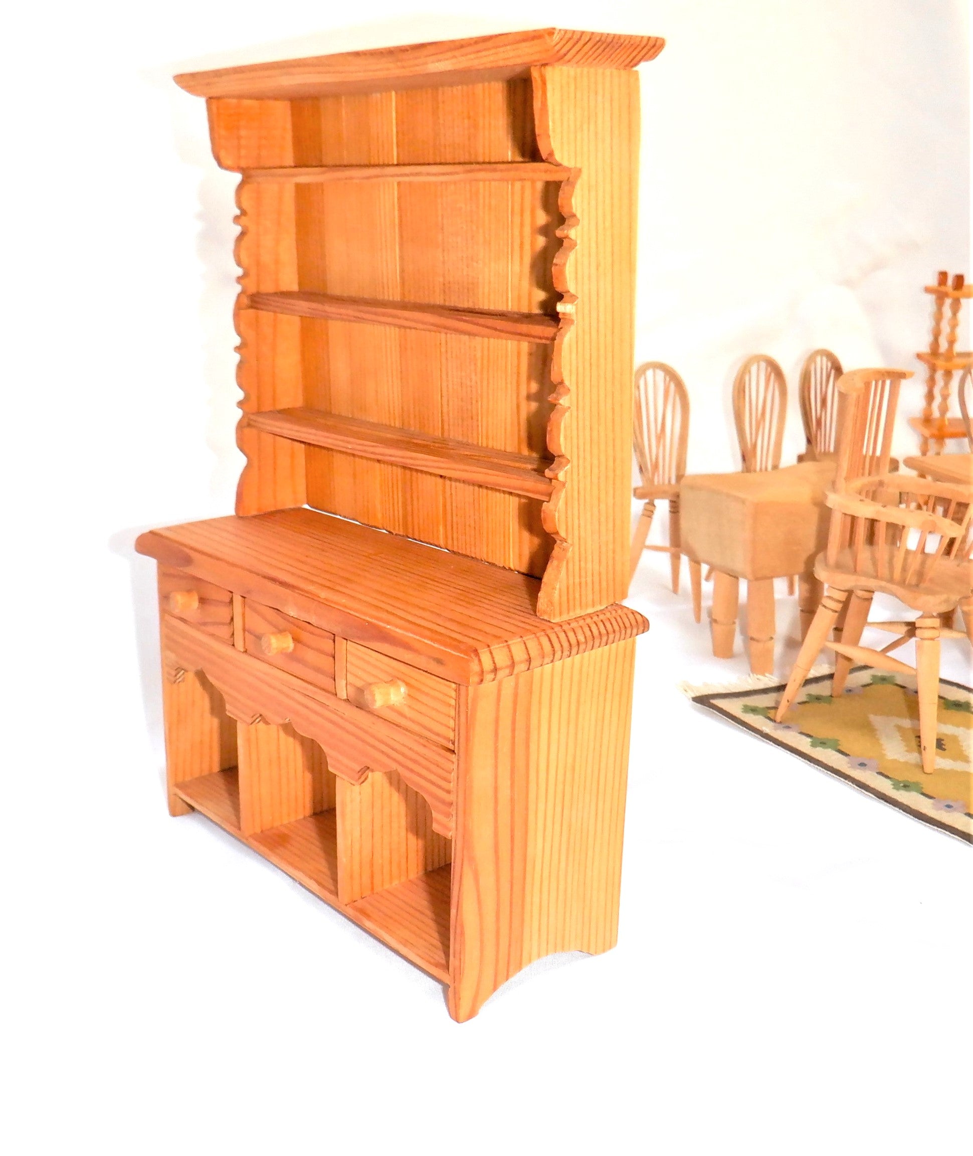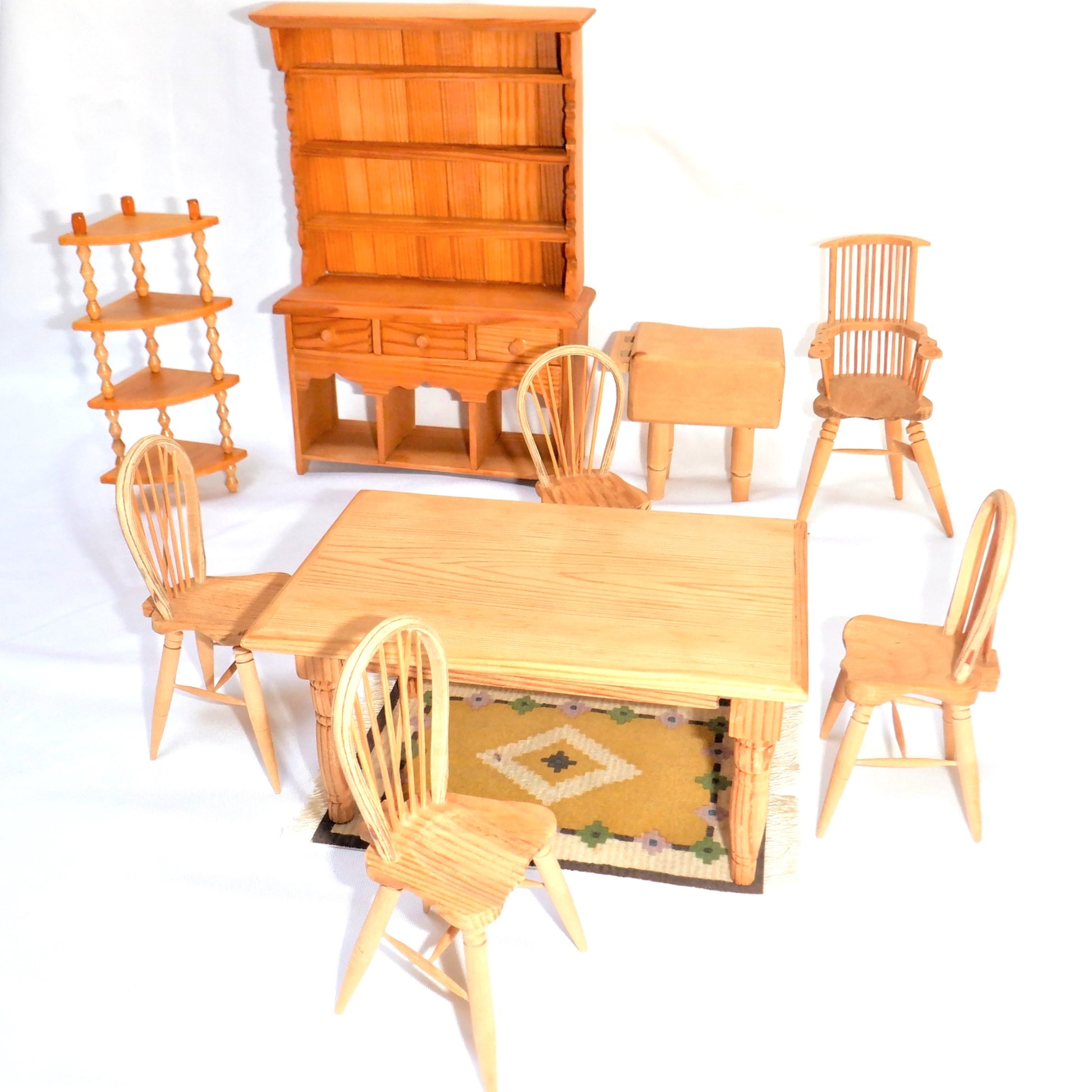 This is a meticulous 11-Pc Country Kitchen Pine Doll House Miniature Furniture Set, all hand-made, and several of the pieces are signed and dated by the artist. All pieces are in excellent condition. Hand-Crafted in Canada.