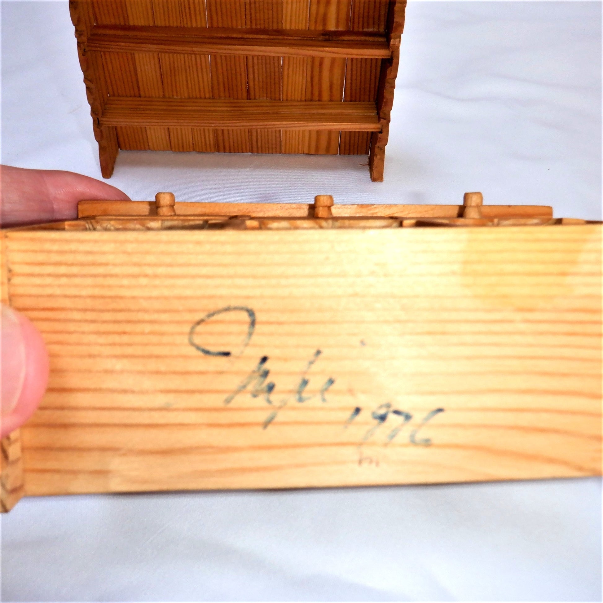 - Kitchen HUTCH & SHELVES: Hutch size 5w x 3h x 1.75d inch,ย Top Shelf size 5w x 4.5h x 1d inch, Signed by artist and dated 1976.