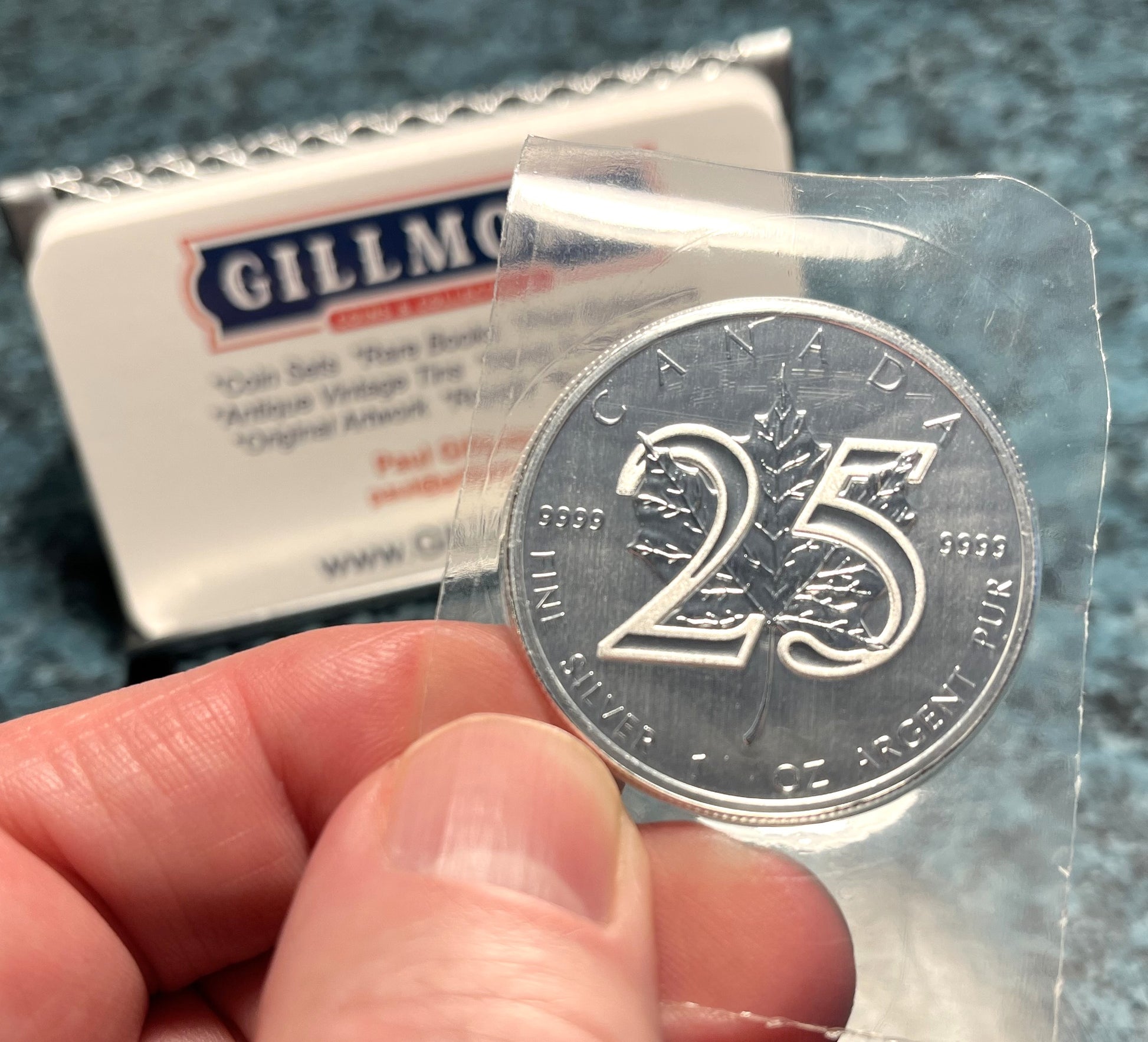 This Anniversary Edition features the typical Silver Maple Leaf design with a super imposed "25" along with a different unique finish to make it stand out, and includes the series hallmark assurance of "Fine Silver 1 oz Argent Pur" on the face.