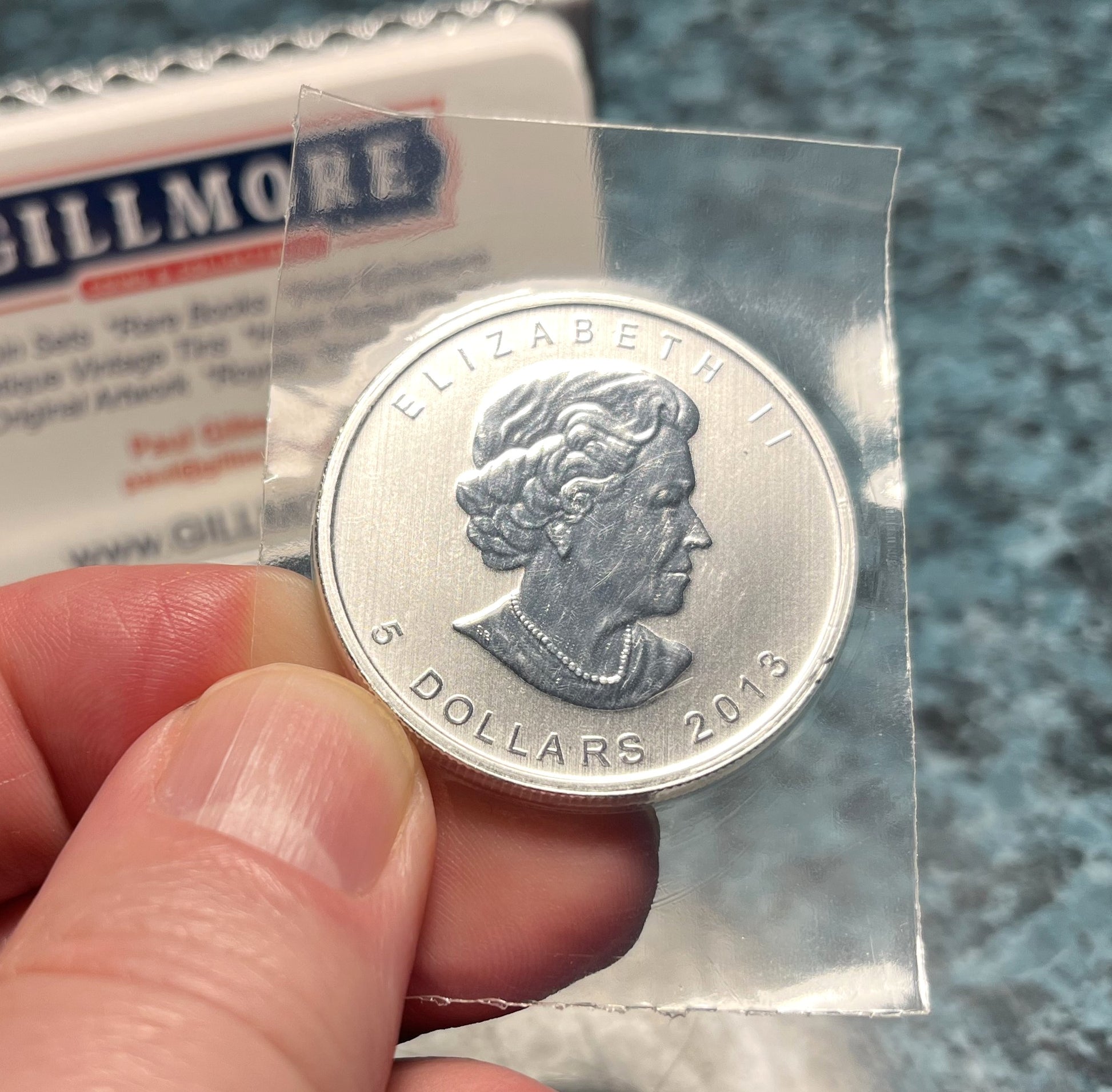 2013 1 oz Fine Silver Coin $5 - 25th ANNIVERSARY OF THE SILVER MAPLE LEAF Coin, in RARE PRISTINE MINT Condition, and still packaged in the original Royal Canadian Mint's shrink-wrap as photo depicts.