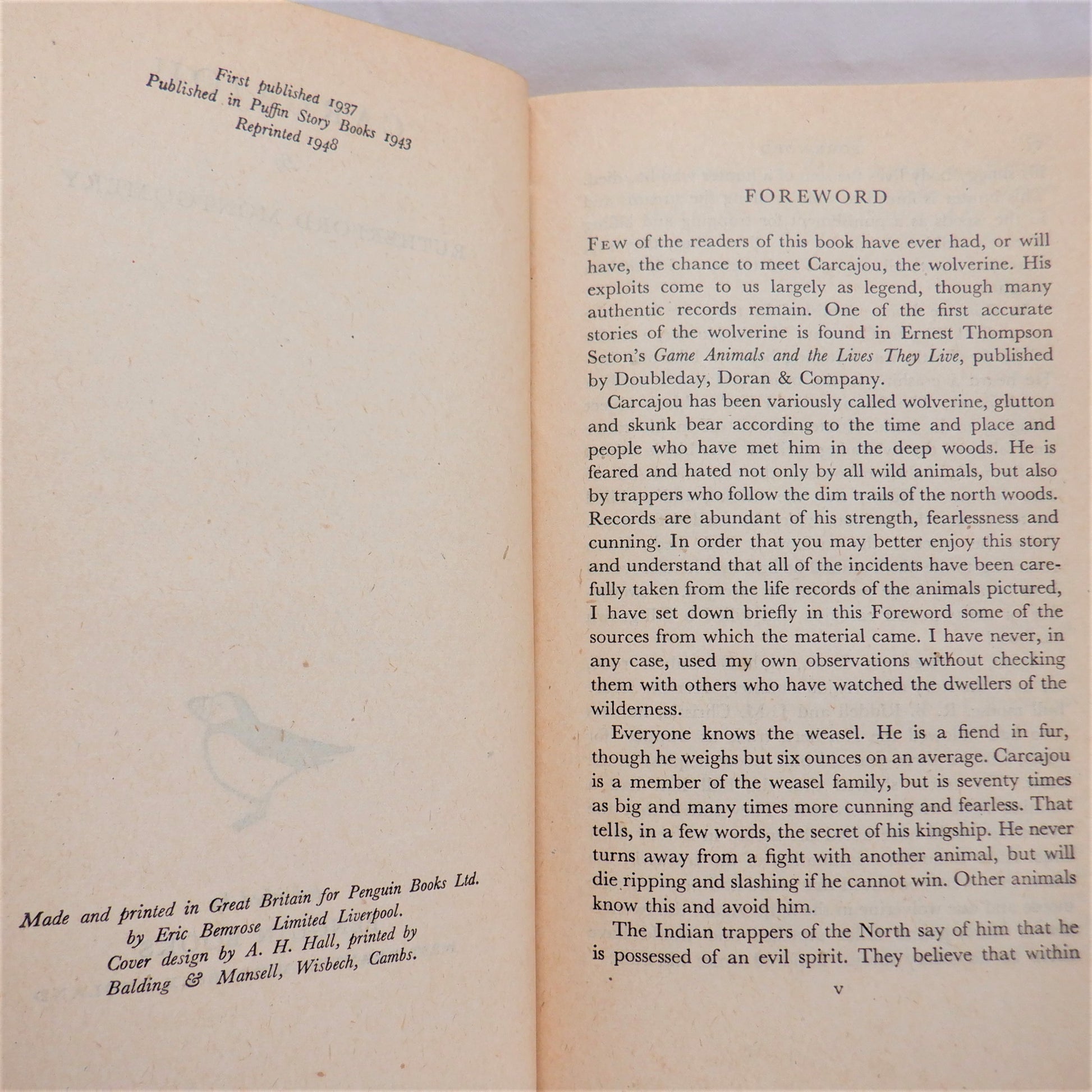 RARE: This is the classic 1937 tale of Carcajou, the North American Wolverine, but in a 1948 Penguin Book Reprint, with amazing vivid cover graphics, and the original price sticker on the back cover of "Two Shillings and sixpence."