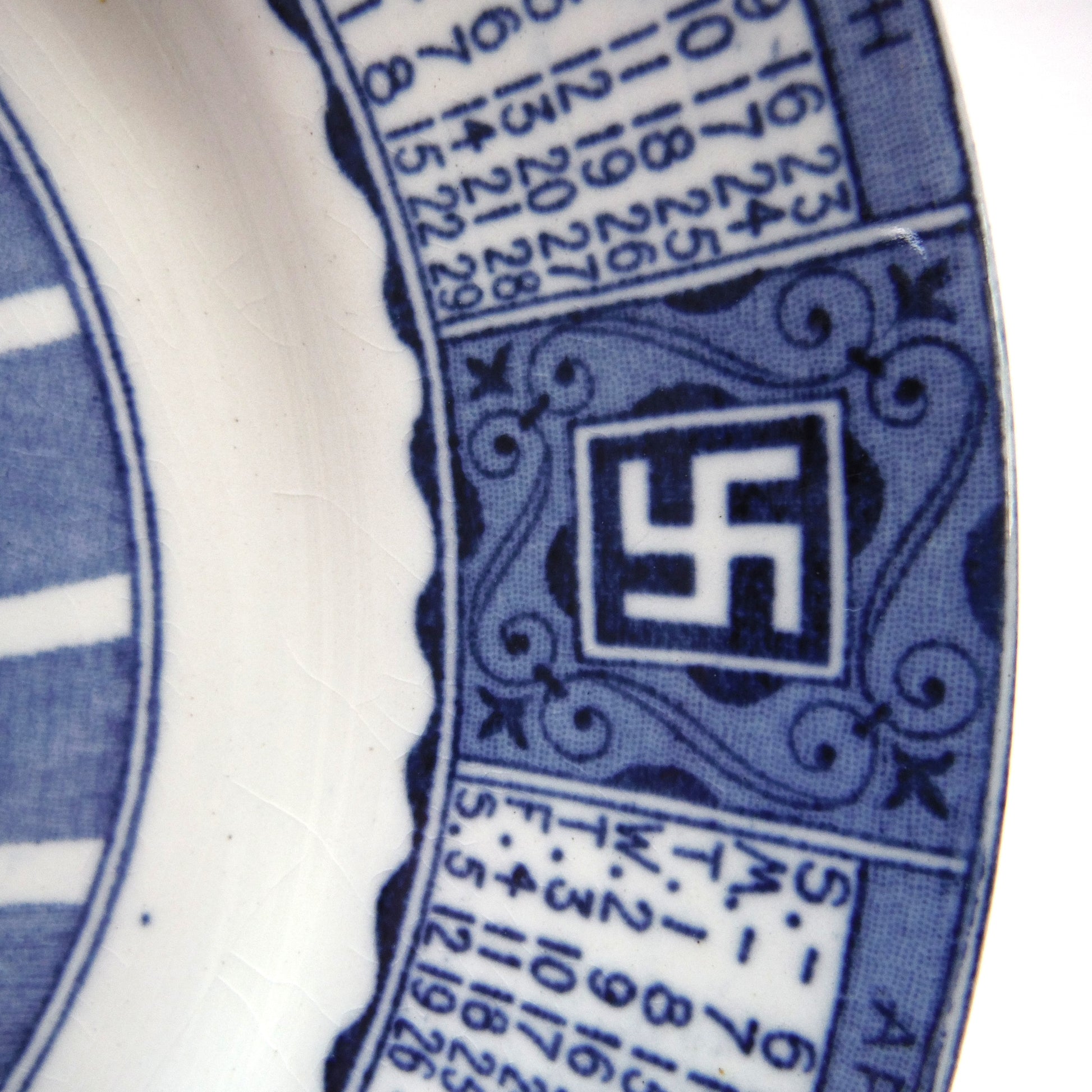 The outer rim features a pair of swastika symbols, which was actually used as a good luck symbol before it was appropriated by the nazi party. The top of the plate displays the year, 1930, and all around the sides are each month's calendar. The inner circle features a galleon style sailing ship and a vivid image of the rising sun. The lower rim was gold imprinted, "Compliments Malpass & Wilson, Nanaimo, BC." The underside displays the Woods Ware, Woods and Sons factory logo. Made in England.