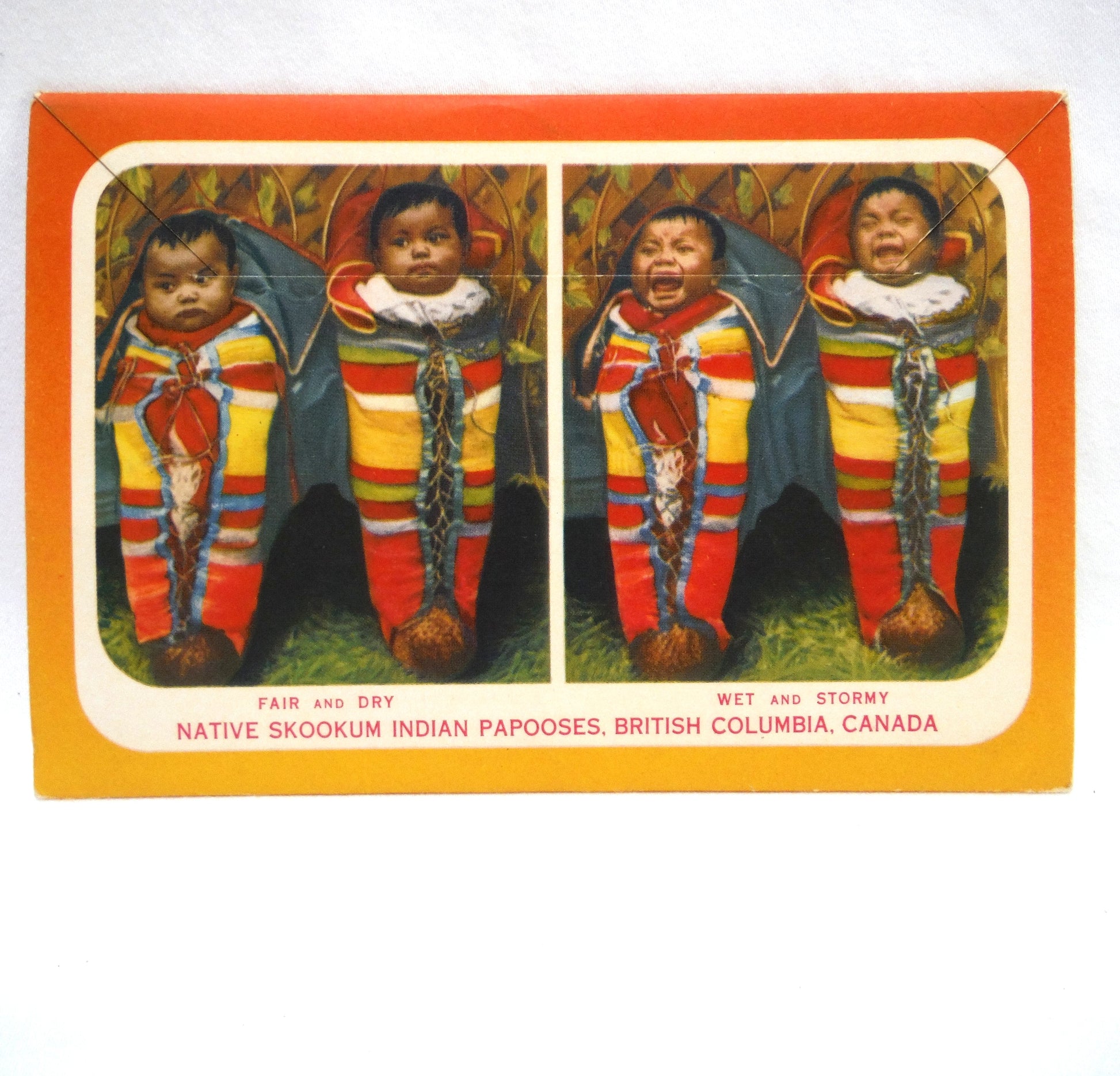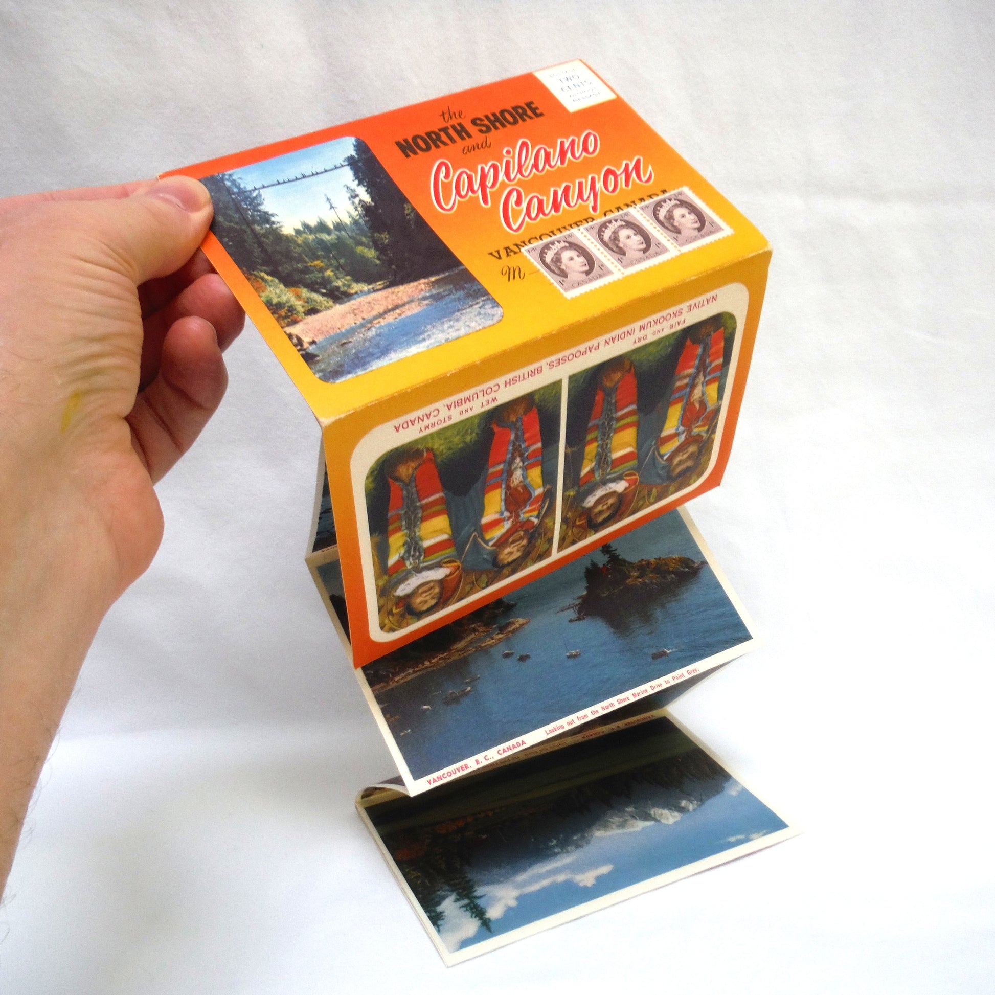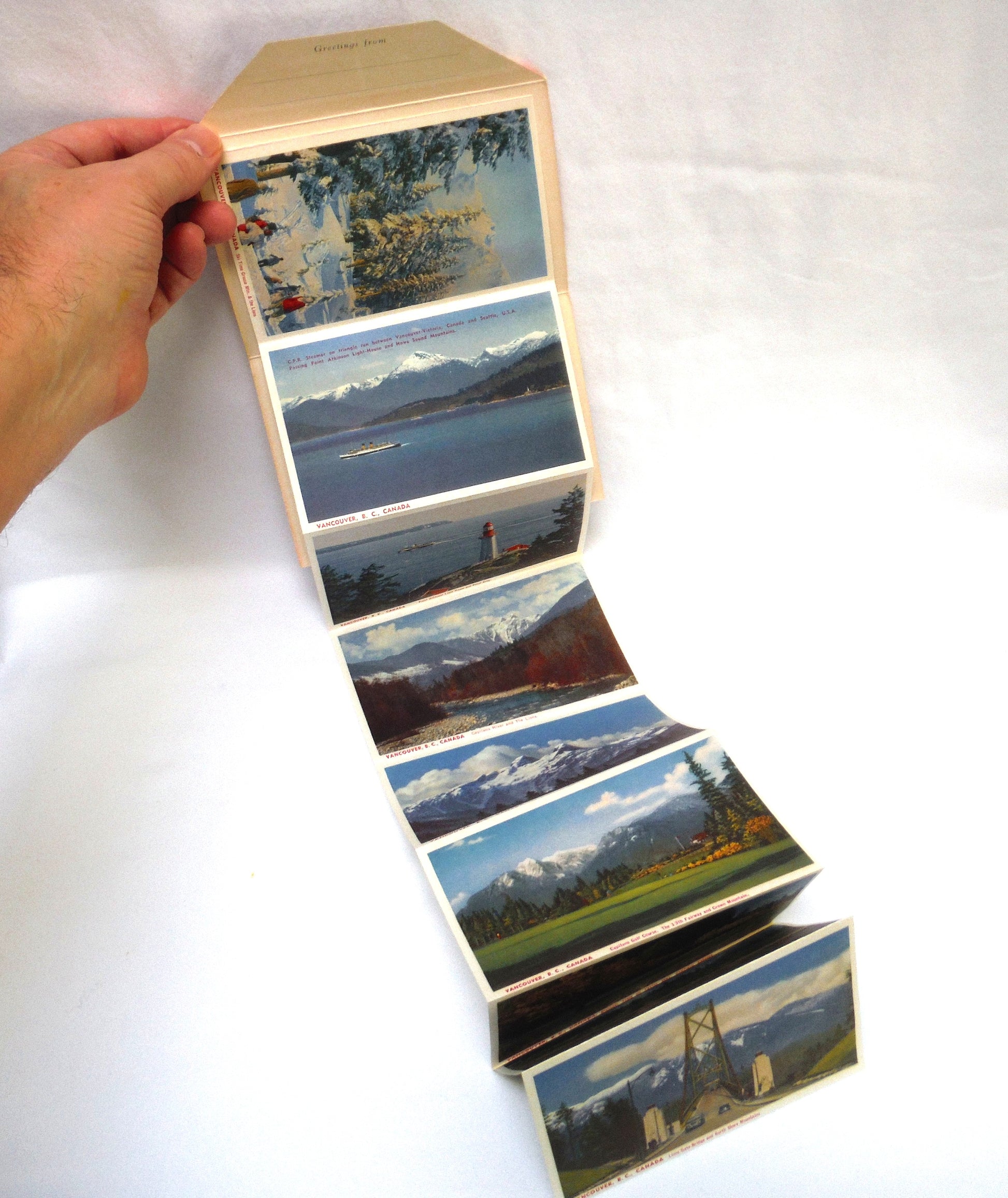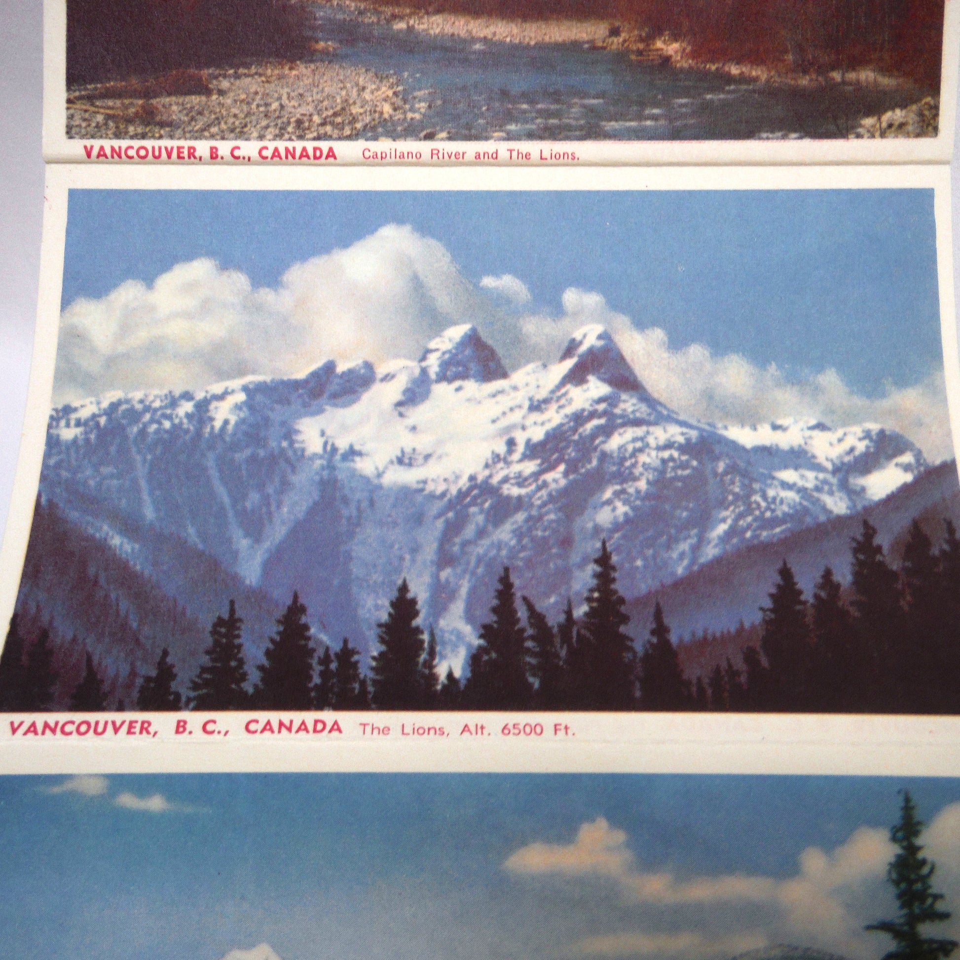 This Fold-out Travel Postcard Collection consists of 9 pages of double-sided, full-colour hand-tint styled 1950's images, with a brilliant red ink used for titles and descriptions. All nine cards equal 18 unique scenes, and they are still firmly attached to each other, and in like-new condition. Inside the cardboard folder is some information about the area. The back cover features a lovely photo of two First Nation babies in their papooses, before and after entitled, 'fair and dry, and wet and stormy.' The front cover displays a scenic photo of the famous Capilano Canyon Bridge, along with the three 1954 1-cent stamps, not cancelled. Inside and out is free of any marks or writing. This is truly a one-of-a kind remarkable collectible souvenir of all things Vancouver!