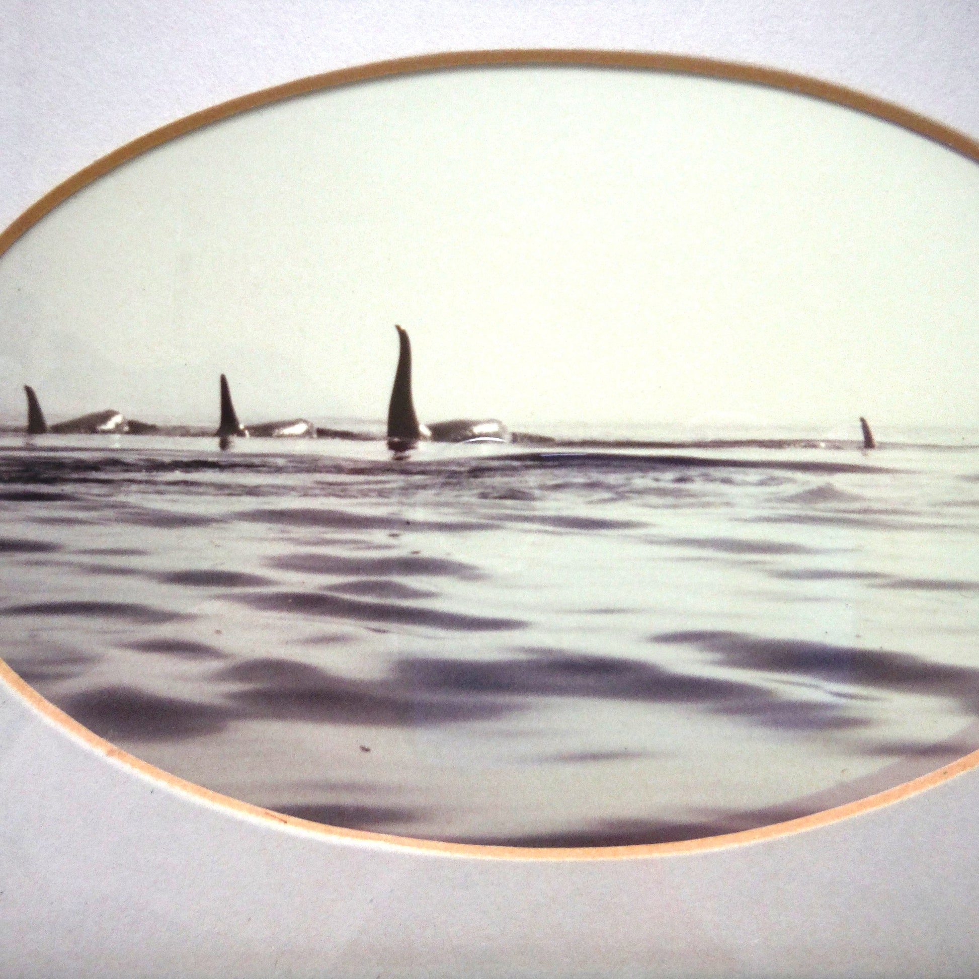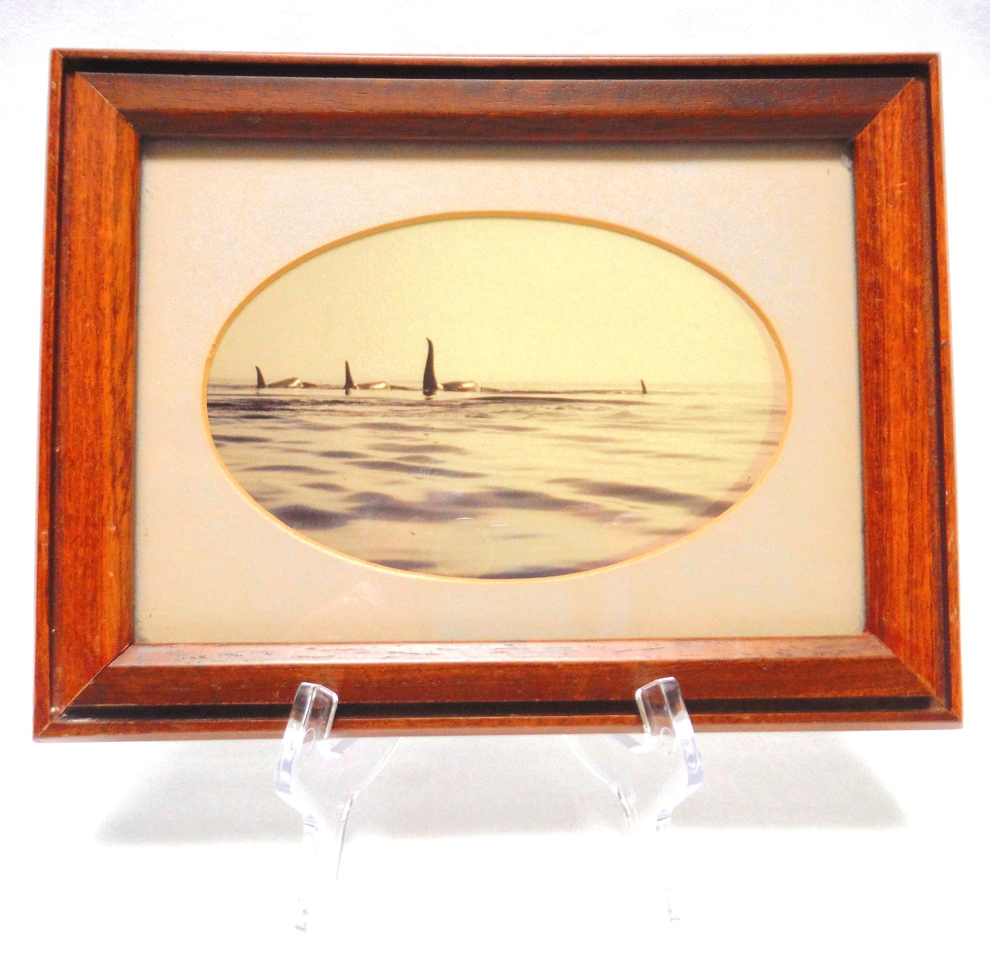 1956 Mid-Century B&W Sepia-Toned Wood Framed Photograph: 'FOUR ORCA KILLER WHALES'