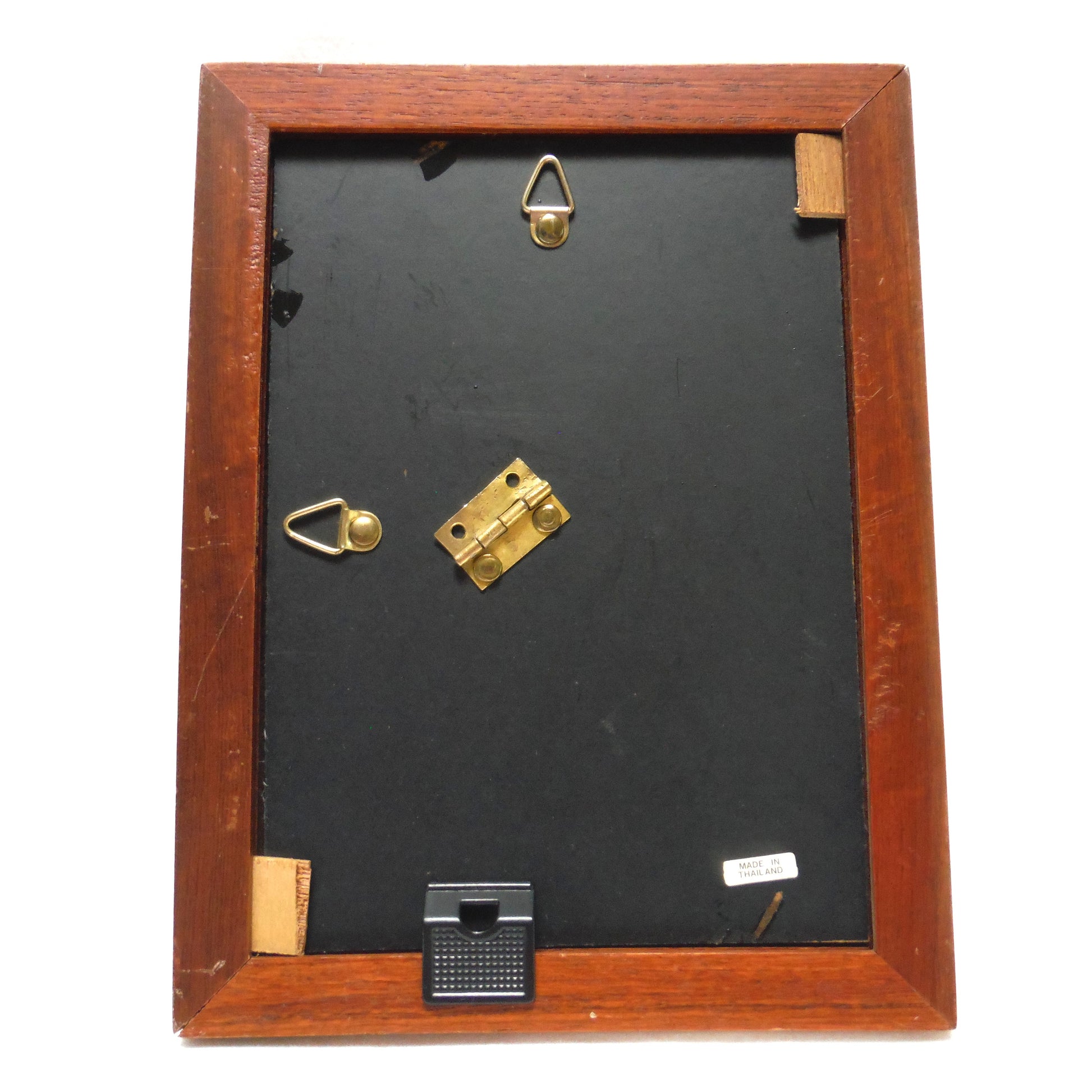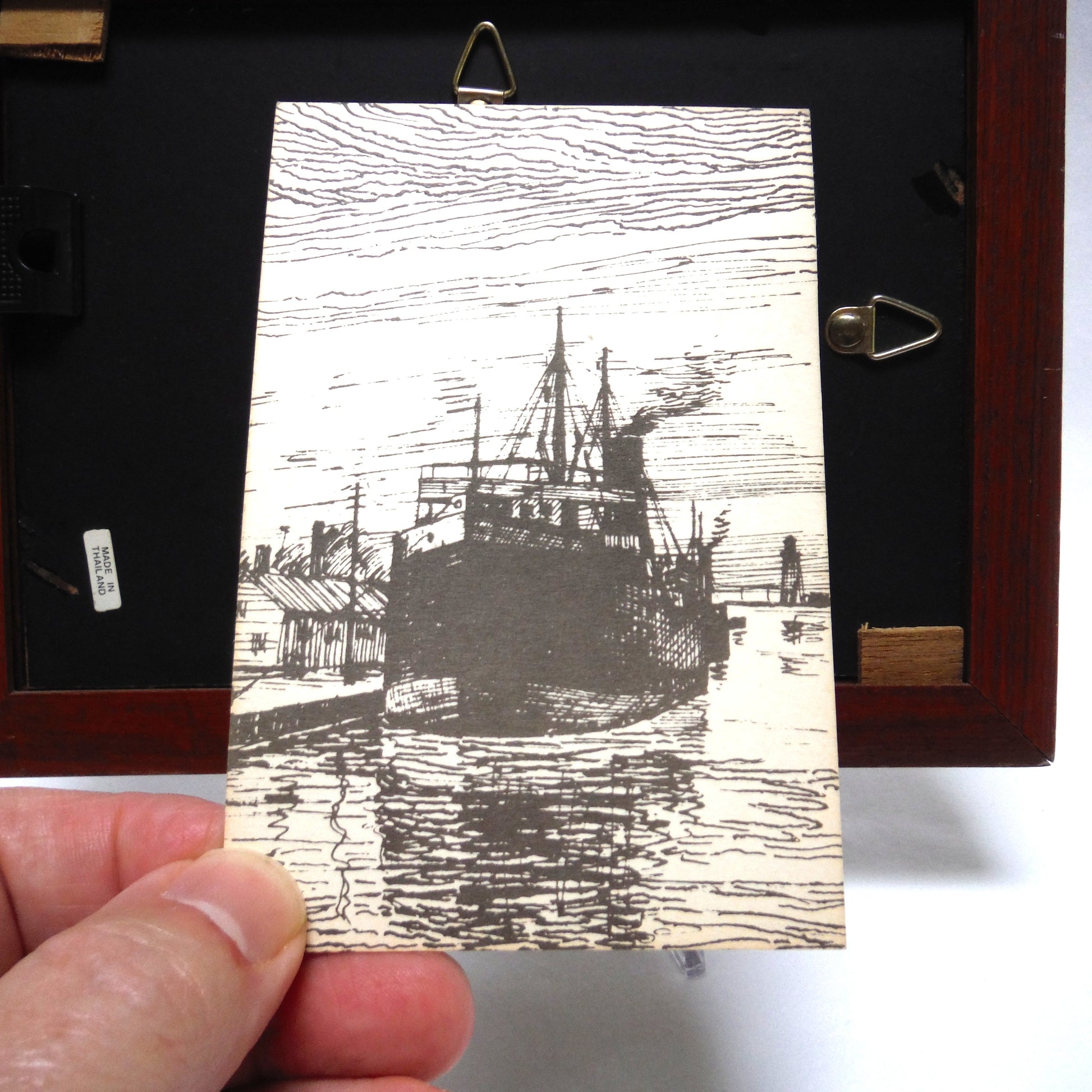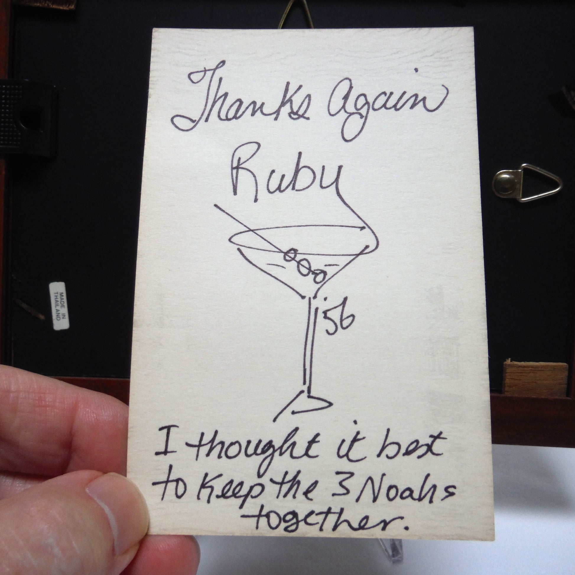 What truly makes this piece special is the hand-written card attached to the back of the frame. One side features an ink drawing of a trawler ship, while the other side reads, "Thanks again Ruby, I thought it best to keep the 3 Noahs together," alongside a stylized martini glass drawing, and a '56, likely referencing to the year. A beautiful piece of West Coast art that serves as both a stunning display and a great conversation starter for dinner parties.