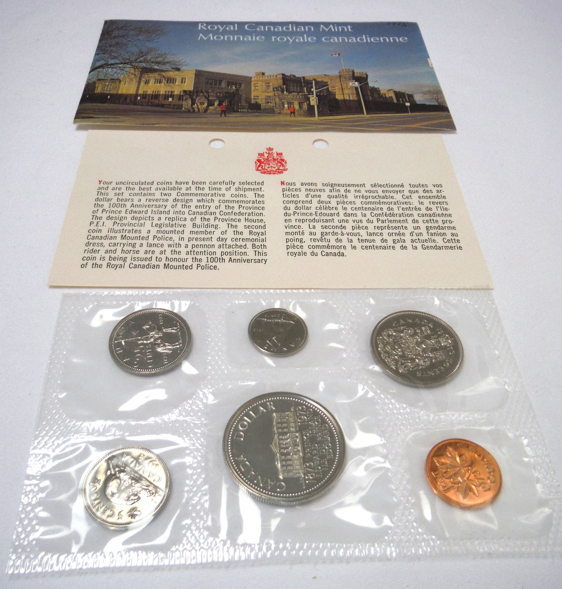 1973 Canadian 6-Coin Proof-Like Brilliant Uncirculated Coin Collector Set. Still Factory sealed in original plastic. All Brilliant Finish: $1, .50, .25, .10, .05, and penny. MINT CONDITION and comes with original envelope and COA (Certificate of Authenticity Card). Made in Canada by The Royal Canadian Mint.