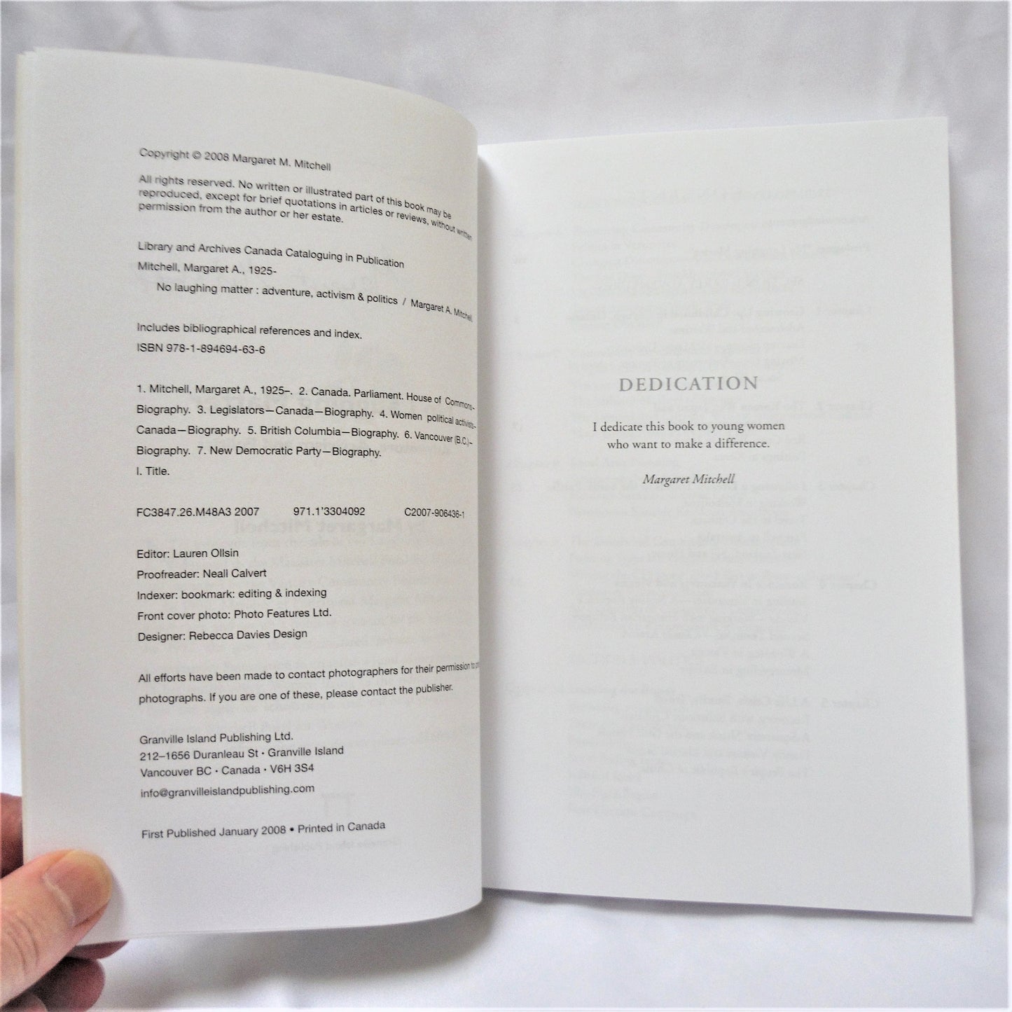 NO LAUGHING MATTER by Margaret Mitchell, is a testament to the struggles and achievements of women MPs, and chronicles her life's adventures and work, in an engaging story that will have broad public appeal. It will also interest those involved in political science, women's studies and local history.