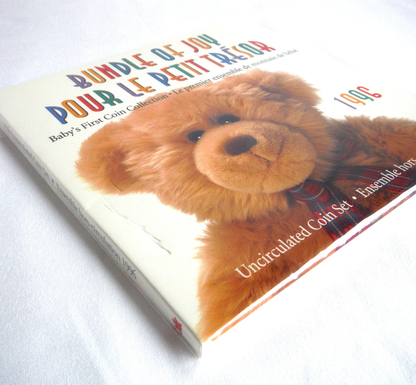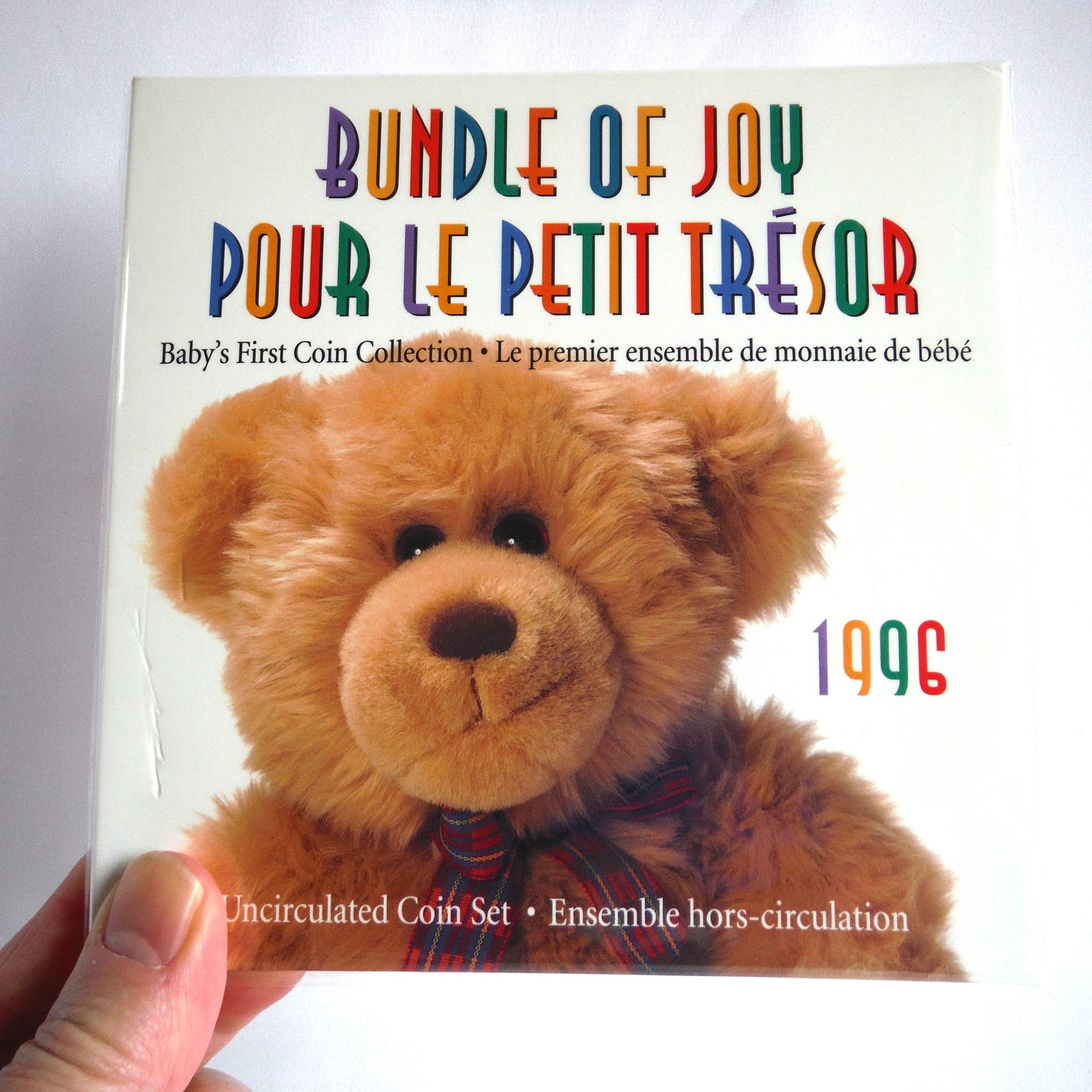 1996 BUNDLE OF JOY Baby's First Coin Collection.ย Celebrate a newborn bundle of joy with this special gift of Canadian coins, and rest assured this will be a lifelong reminder of the year of birth for the special child...a remembrance of when all the world was set in wonder and comfort. 1996 Canadian 6-Coin Bundle of Joy Baby's First Coin Collection Gift Set comes with foldable, baby-themed card, secured and plastic protected coins, and a special insert with additional information. Made in Canada by The Royal Canadian Mint.