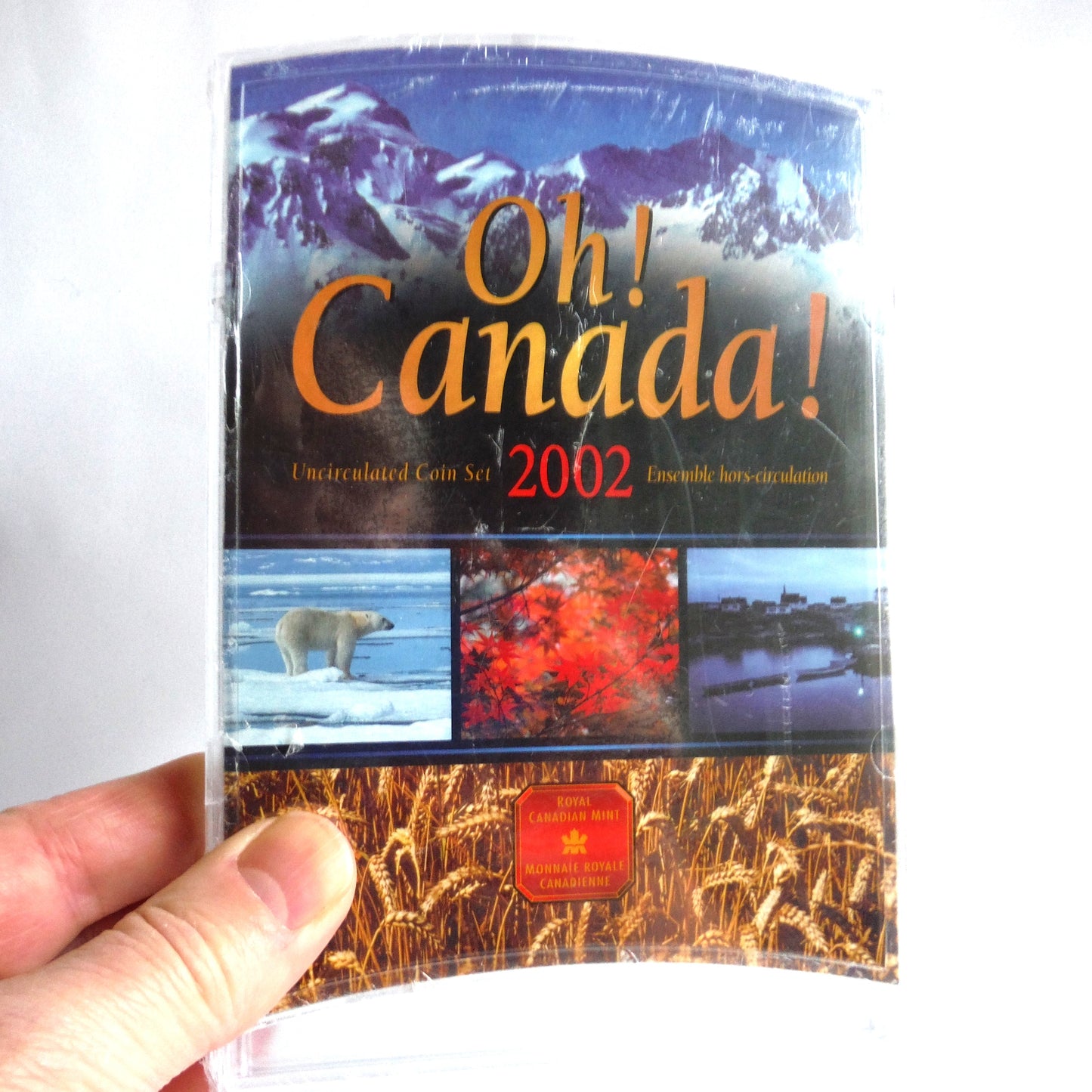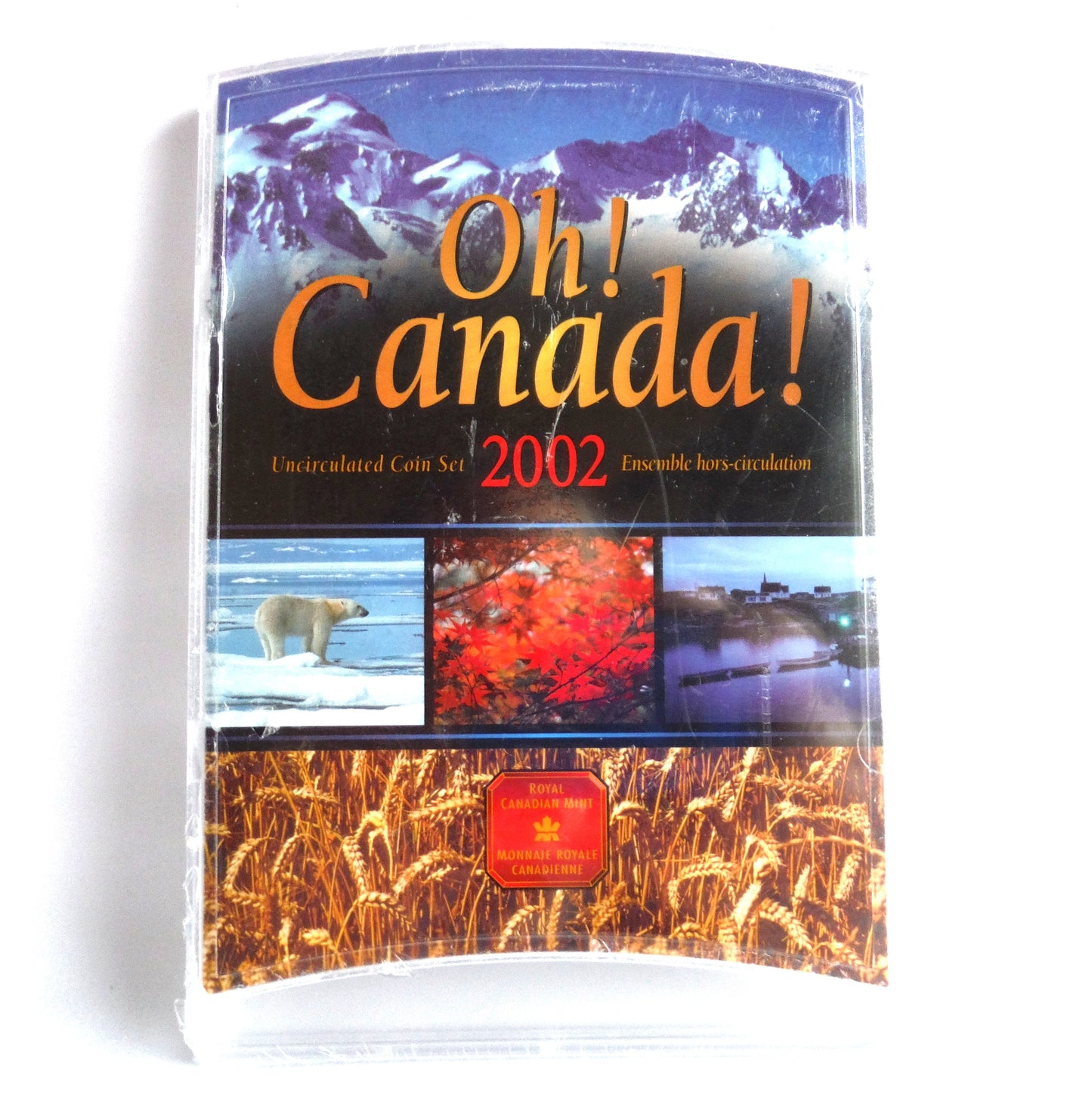 2002 OH! CANADA! Uncirculated Royal Canadian Mint 7-Coin Set, in MINT Plastic Display Case that flips over to showcase both sides of the coins. This 2000 display set includes the $2, $1, 50 cent, 25 cent, 10 cent, 5 cent, and penny coins. All uncirculated. In Brand New condition (plastic shrink-wrap is still on).
