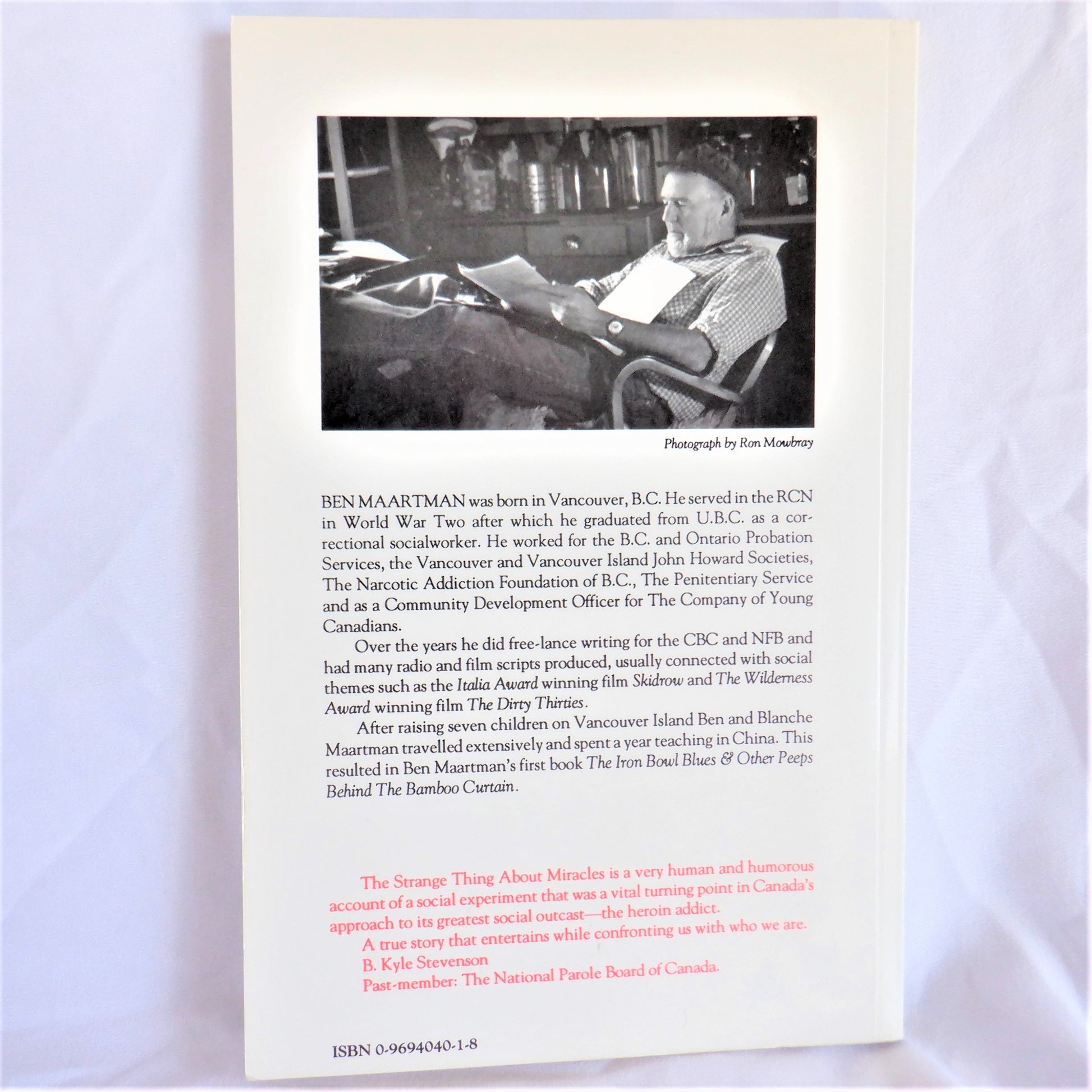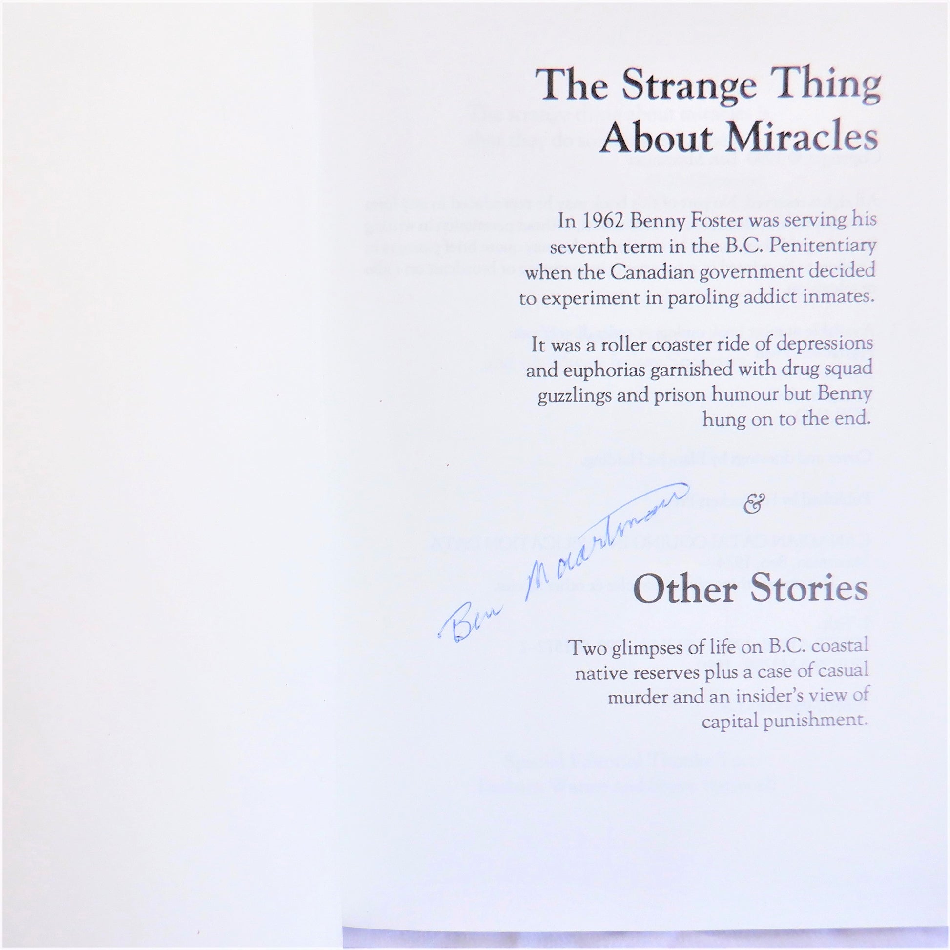 THE STRANGE THING ABOUT MIRACLES is a collection of short stories, with the main title story being about Ben Maartman's 18-month-long experiences with 16 male, hardcore, recidivist criminal addicts who became penitentiary parolees under his care in 1962.