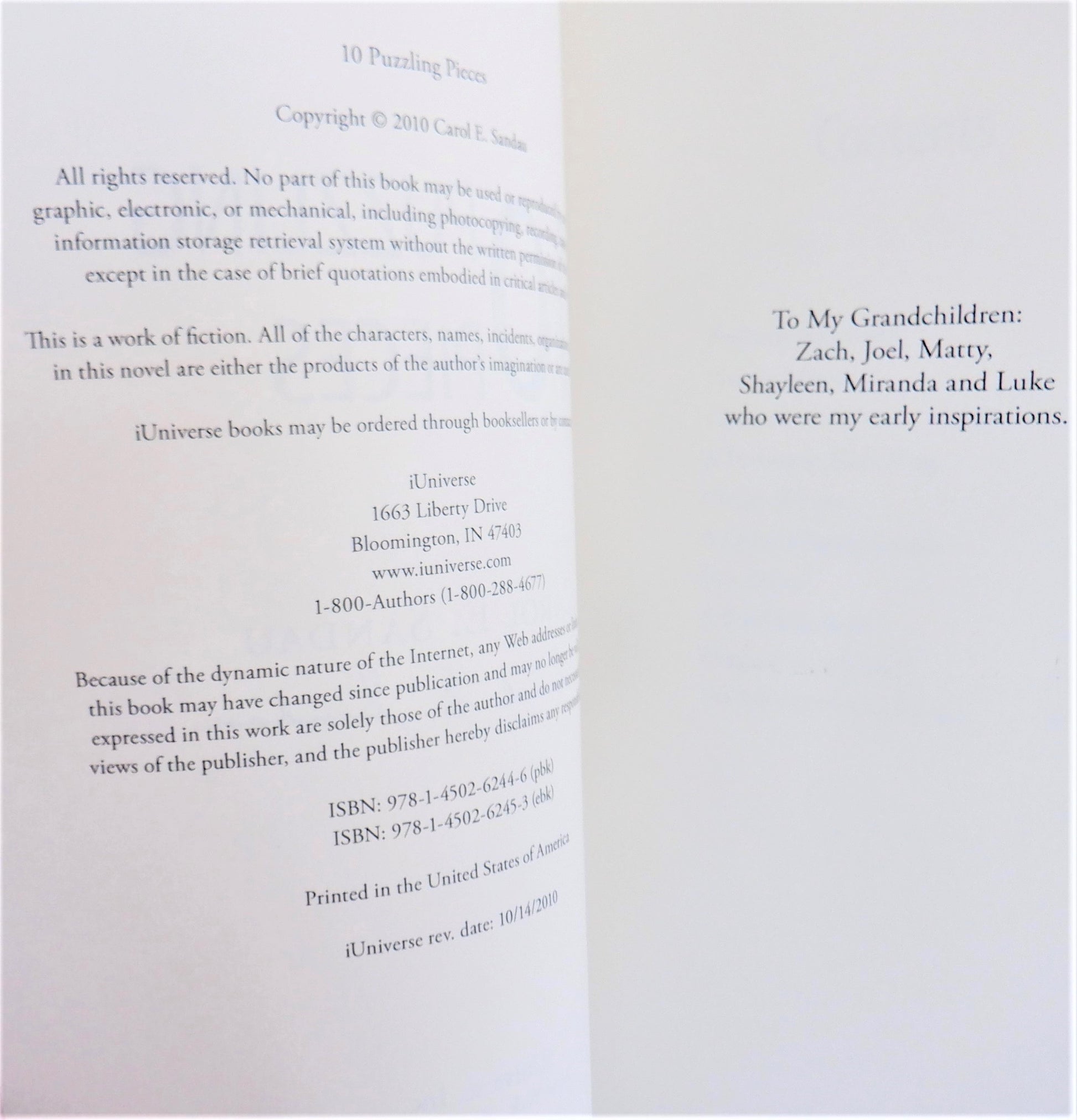 Author: Carol E. Sandau. Published by iUniverse, Bloomington, IN., 2010, 1st Edition. Flat Signed & Dated by Author, and a pretty little smiling face heart!. Printed in USA. Like New Condition SOFTCOVER Book.