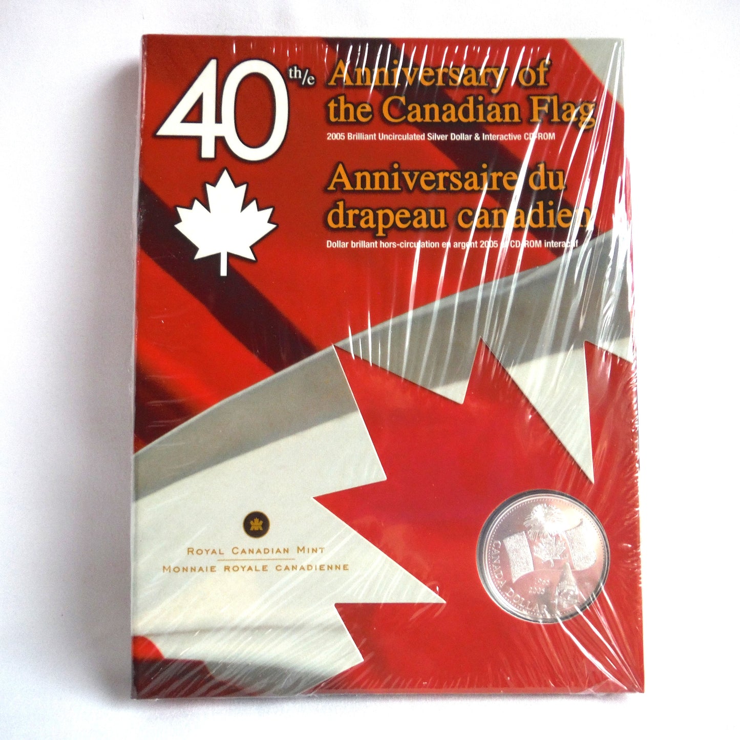 40th Anniversary of The Canadian Flag: A 2005 Brilliant Uncirculated Silver Dollar & Interactive CD-ROM, from the Royal Canadian Mint, is in BRAND NEW Condition, still factory wrapped in plastic.