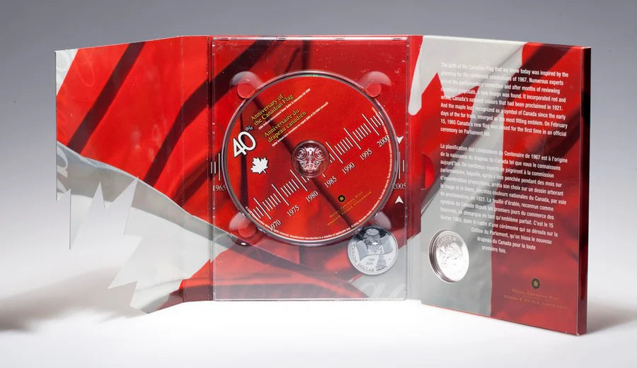 Uniquely packaged in a tri-fold presentation folder, this gift set includes an encapsulated 2005 (1965-) Brilliant Uncirculated Silver Dollar along with an interactive CD-ROM.ย The interactive CD-ROM includes a complete history of the Canadian Flag and various versions of the National Anthem in both official languages of English and French.