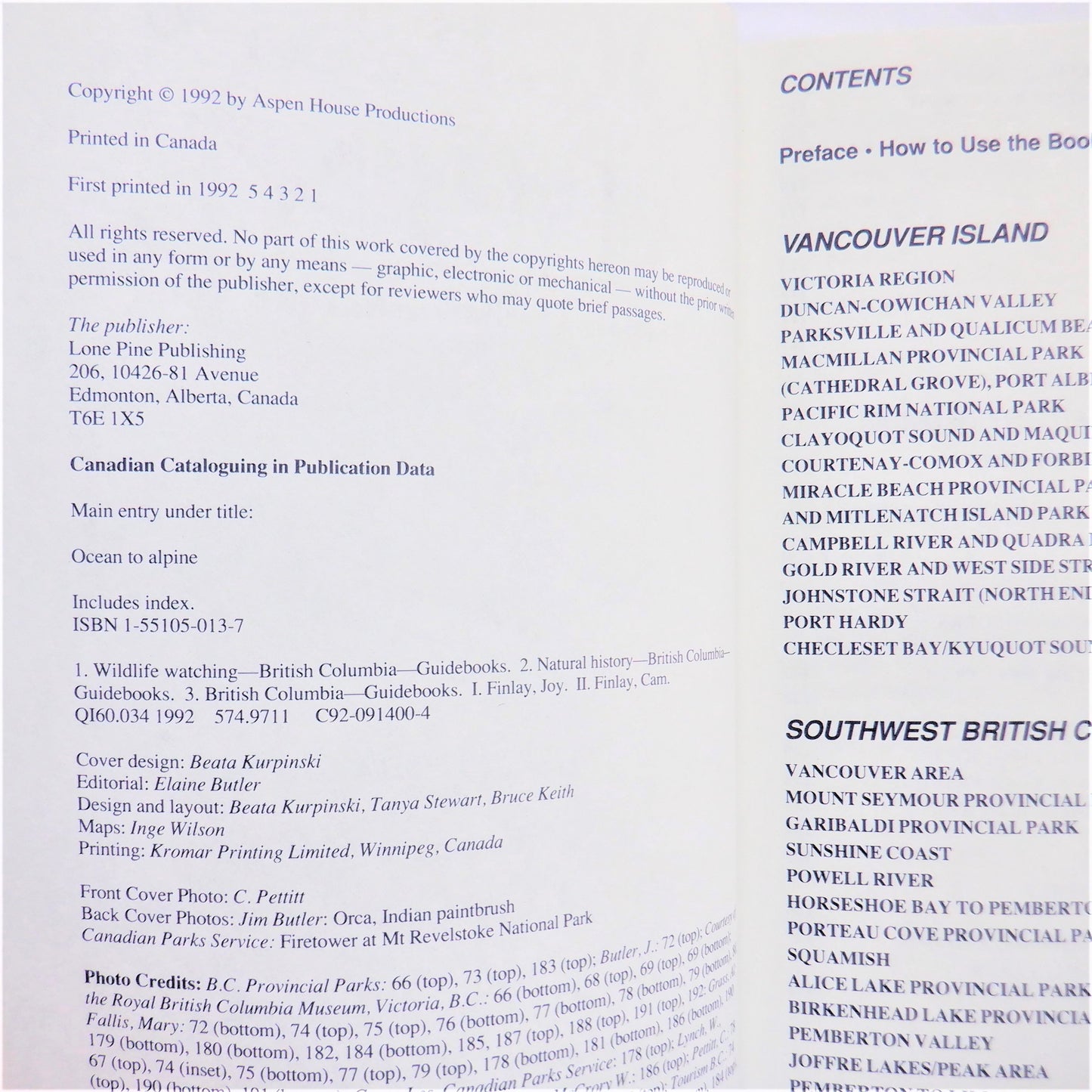 OCEAN TO ALPINE, A BRITISH COLUMBIA NATURE GUIDE, by Joy & Cam Finlay, is an extended guide to natural history and wildlife viewing. Organized by regions from the west coast to the Alberta border, and covers more than 350 sites throughout BC.
