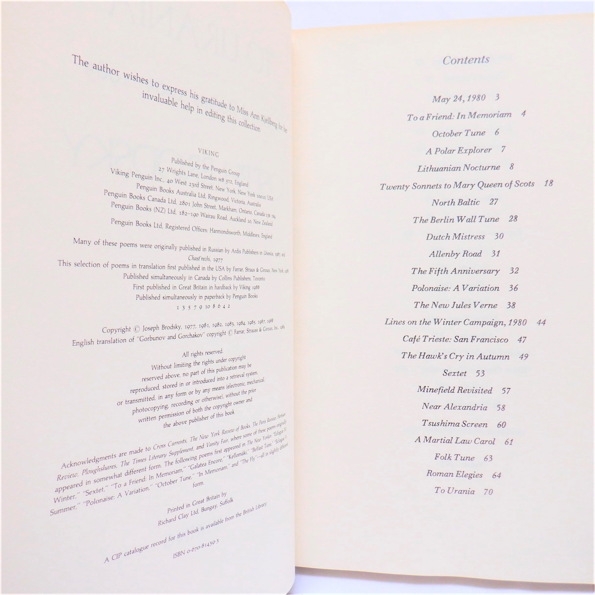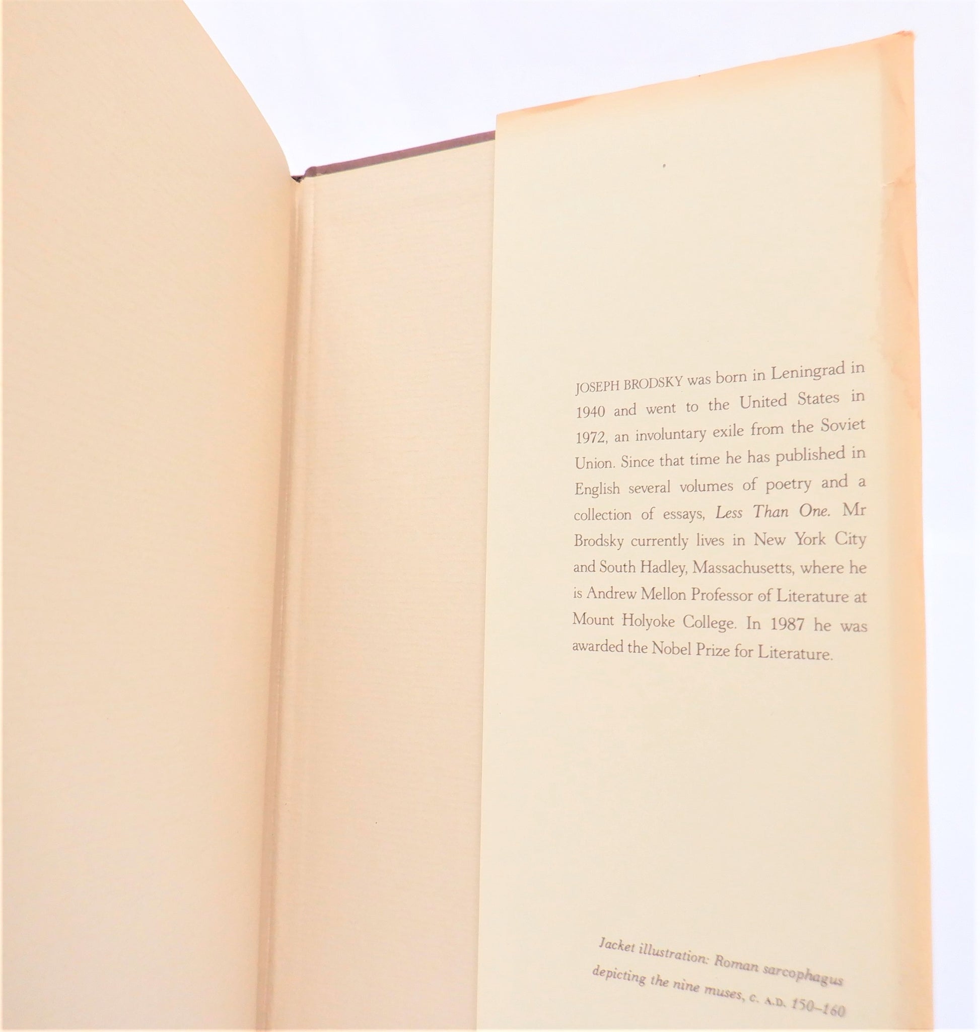 Author: Joseph Brodsky. Published by Viking, Peguin Group, 1988, Printed in Great Britain by Richard Clay Ltd Bungay, Suffolk. A Good Condition HARDCOVER Book, with age-yellowing. Unknown signature inside. A Fair Condition Dust Jacket, with some sun fade, grime, marks, stain.