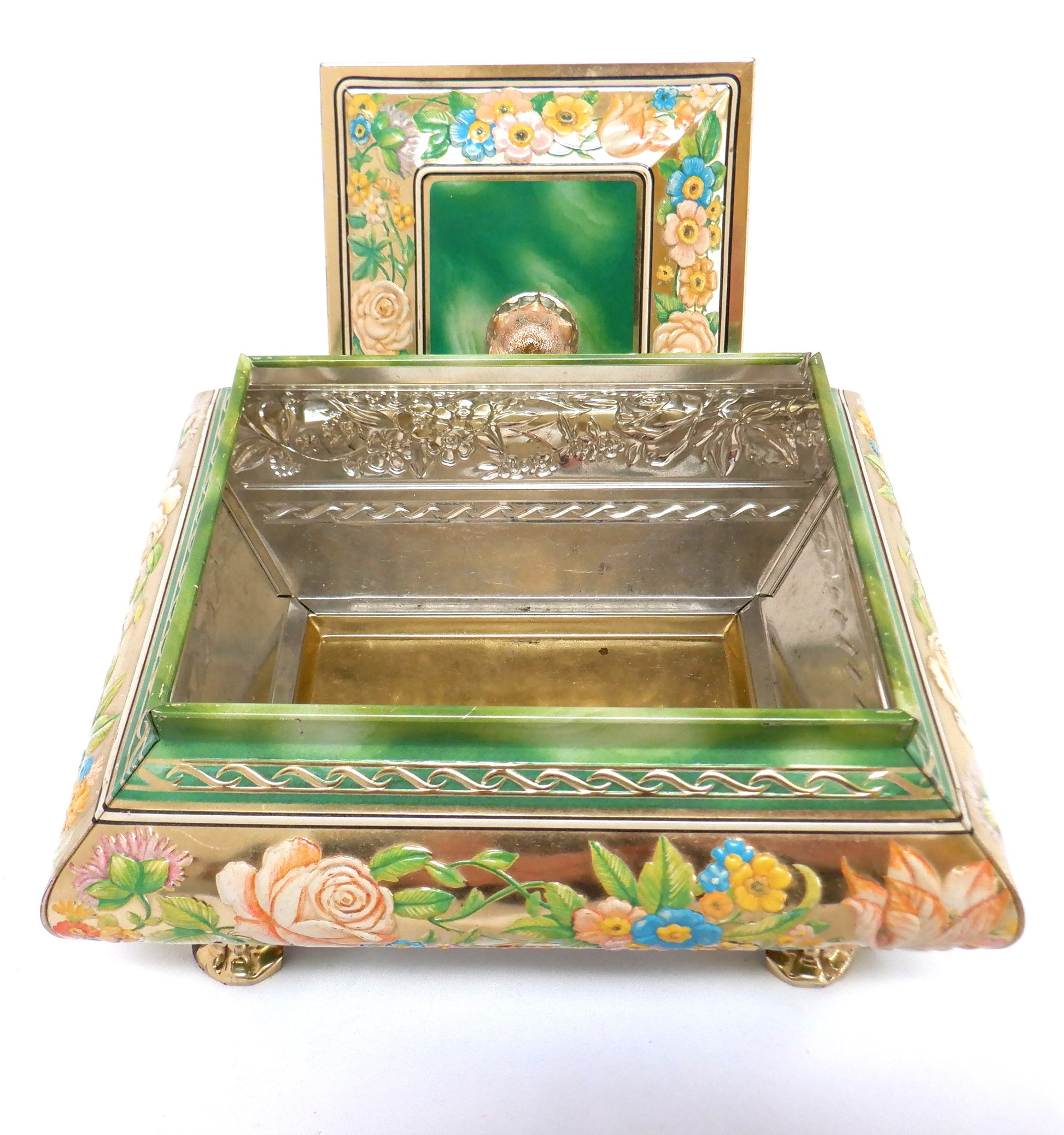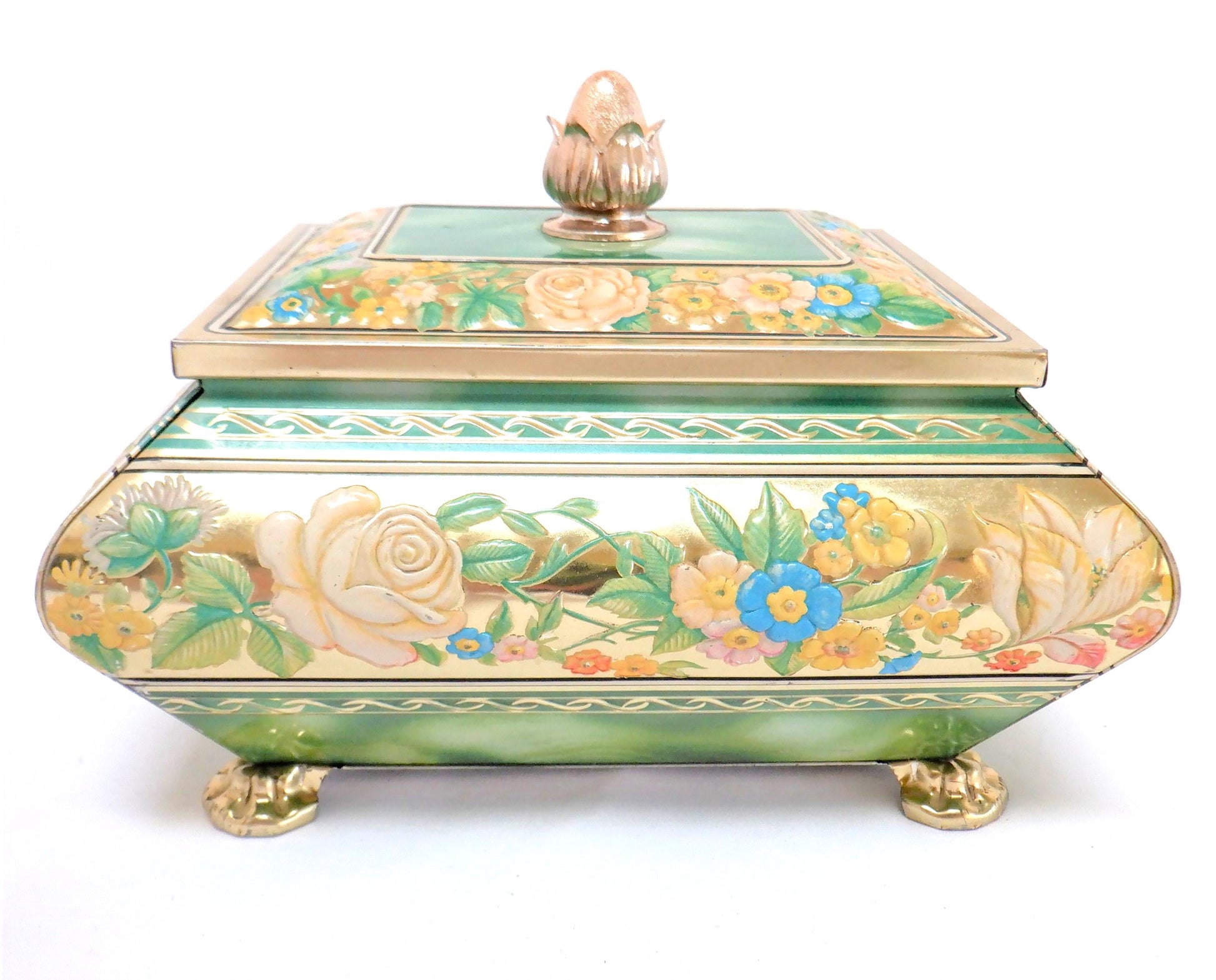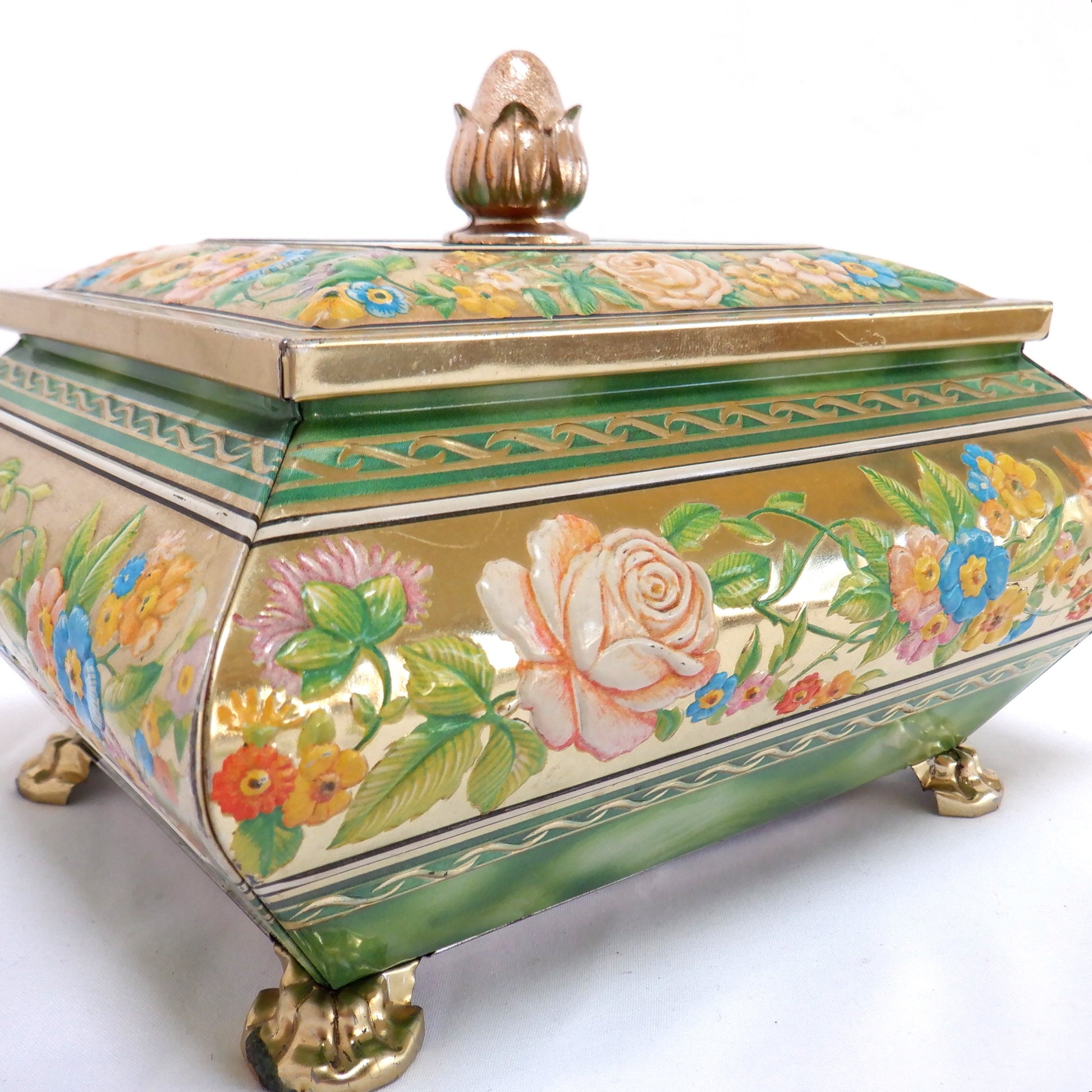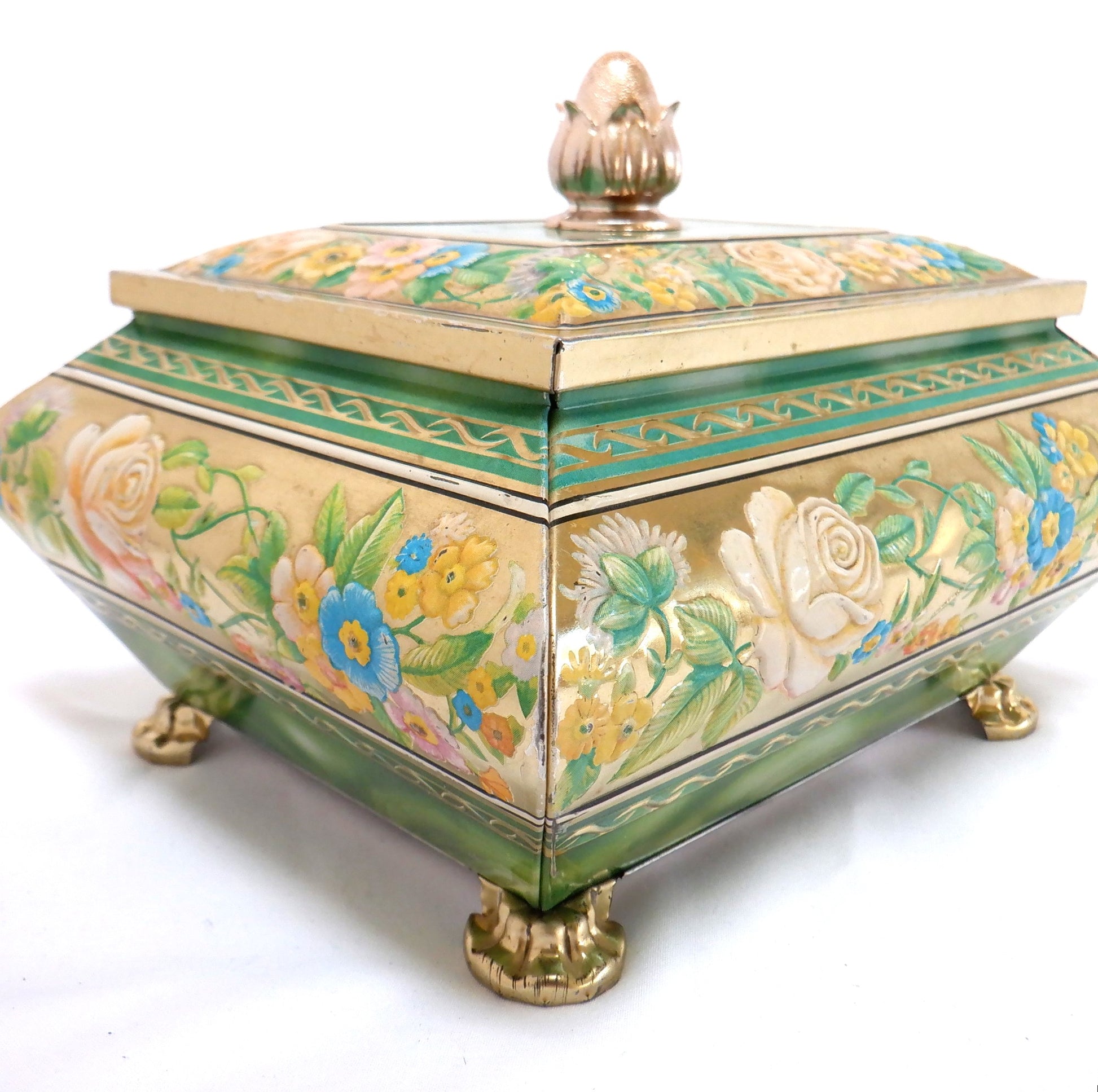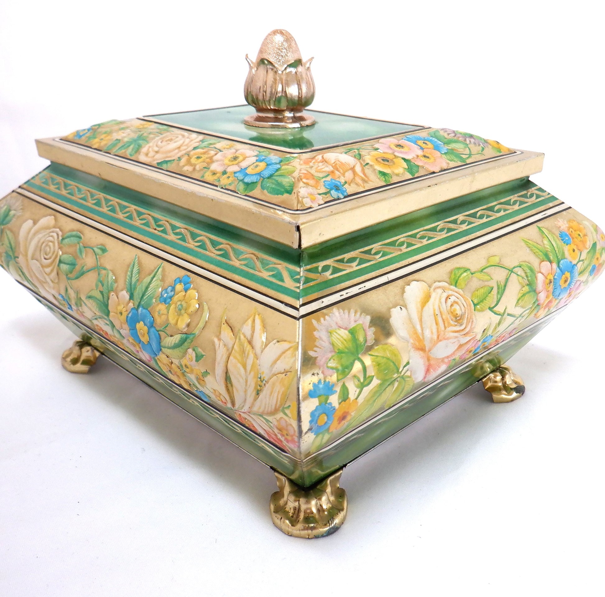 The entire Blue Bird Ornate Tin Container series is very under-appreciated, and has room to grow in price and collectibility! This MARBLED GREEN w/ Roses #1 is in superb condition with a Green Marbled background finish, and highlited with White Roses and muted-pastel flowers. Removable lid, Plastic pull-handle, 4-fancy claw-feet. Made in England.
