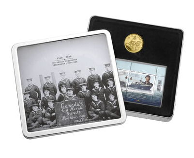 2010 Canada Proof Gold Plated Navy Loonie Coin & Stamp Set - 100th Anniversary of the Canadian Navy This stunning set features a Loonie Dollar commemorating the 100th Anniversary of the Royal Canadian Navy. It has been meticulously plated in gold for a unique, eye-catching touch. This special collectors set also includes 2 each .57 cent Navy Commemorative Stamps, an informative historical booklet on the Royal Canadian Navy, a Certificate of Authenticity, and packaged in a special collectors tin display box.
