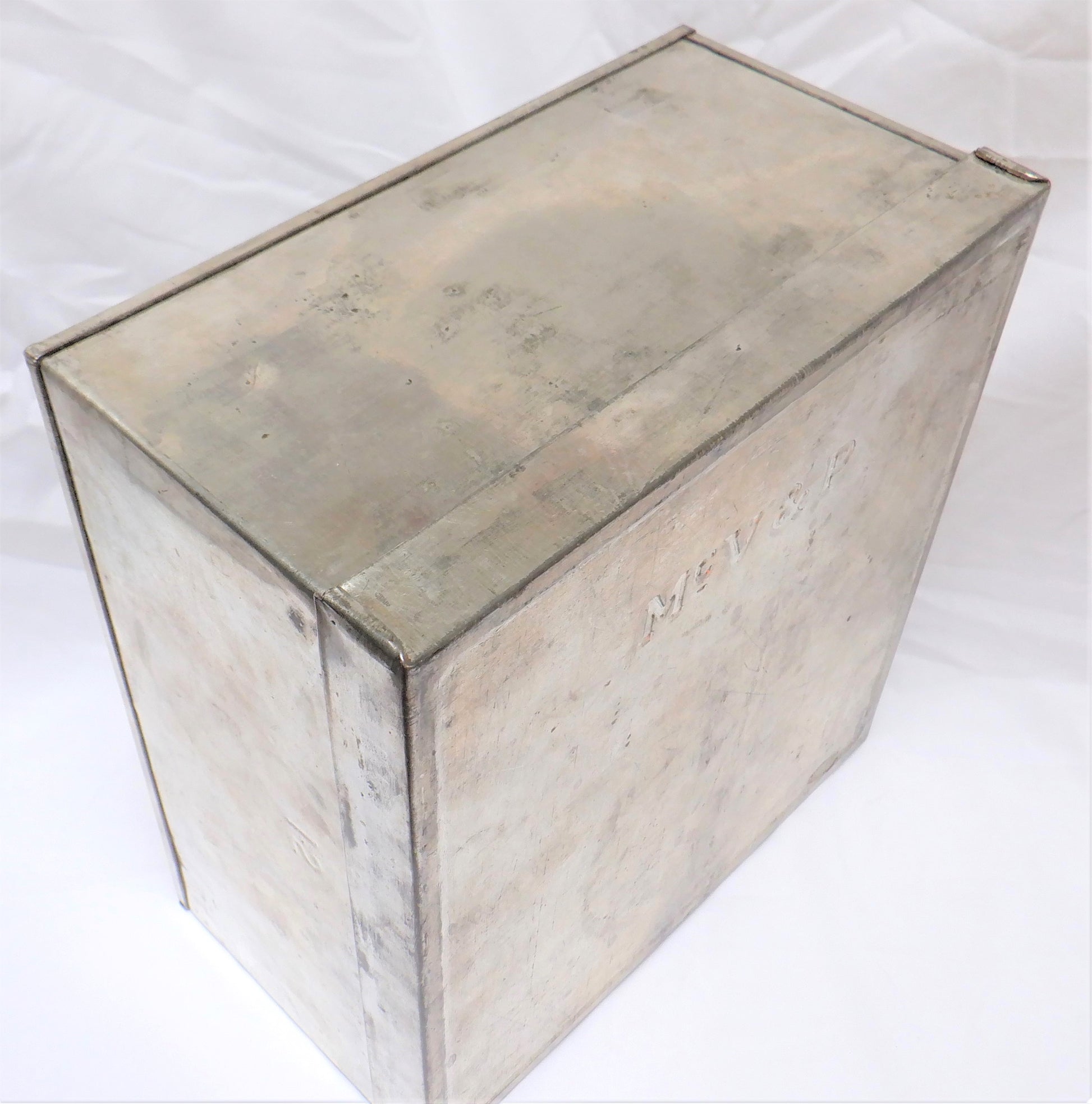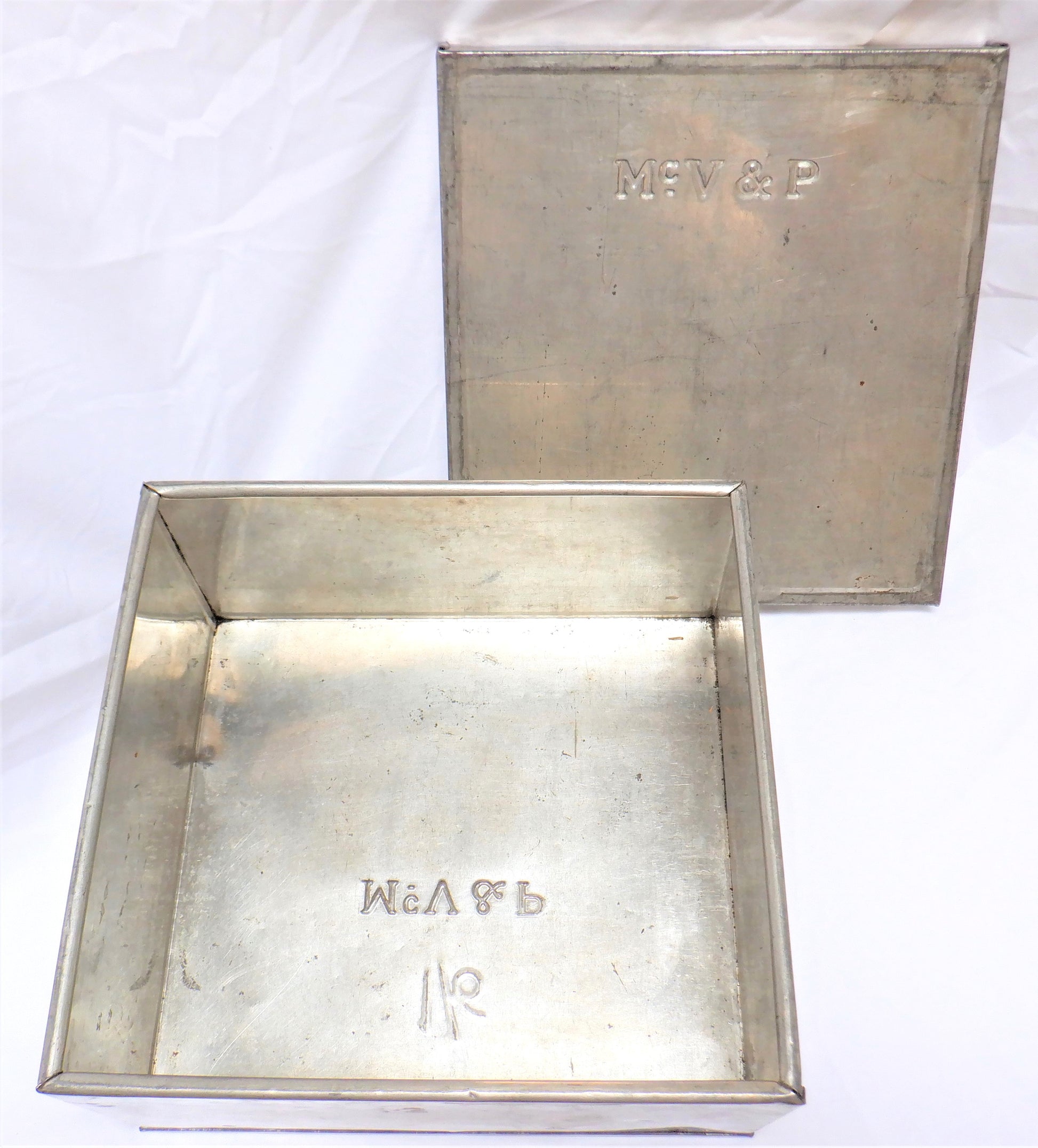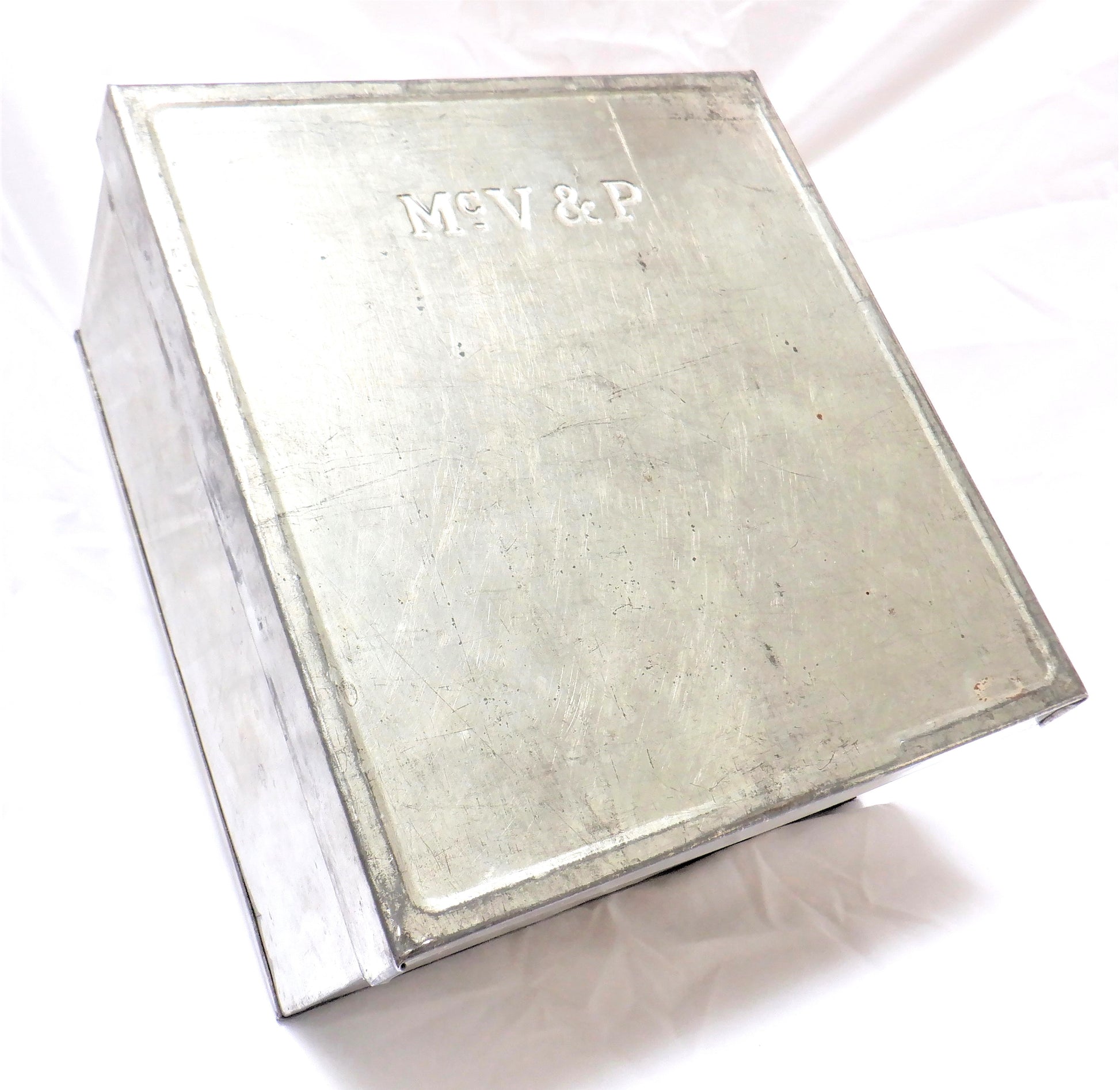 McVITIE & PRICE BISCUIT COMPANY: A Large Silver Antique Biscuit Tin Container that is a wonderful workhorse of a tin. Tin walls are fully wrapped along top edge, with one wall embossed '1-2'. The removable Rectangular lid is embossed with 'McV&P', and a unique design makes it also fit onto the bottom of the tin. The box construction also features folded inside edges with rolled corners. Box Base is applied separately and is embossed with '1/6 McV&P'.