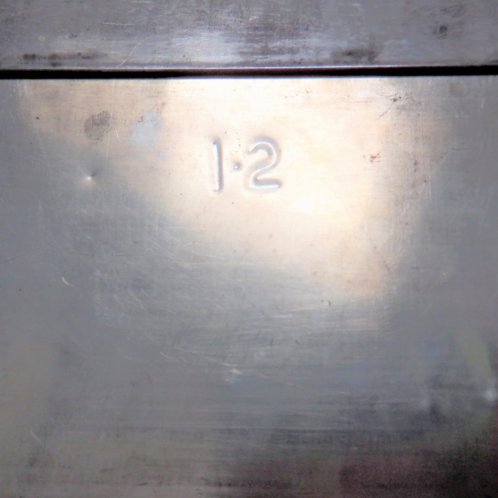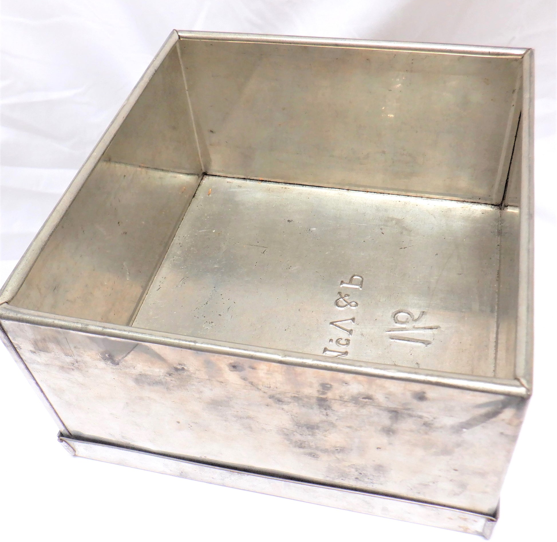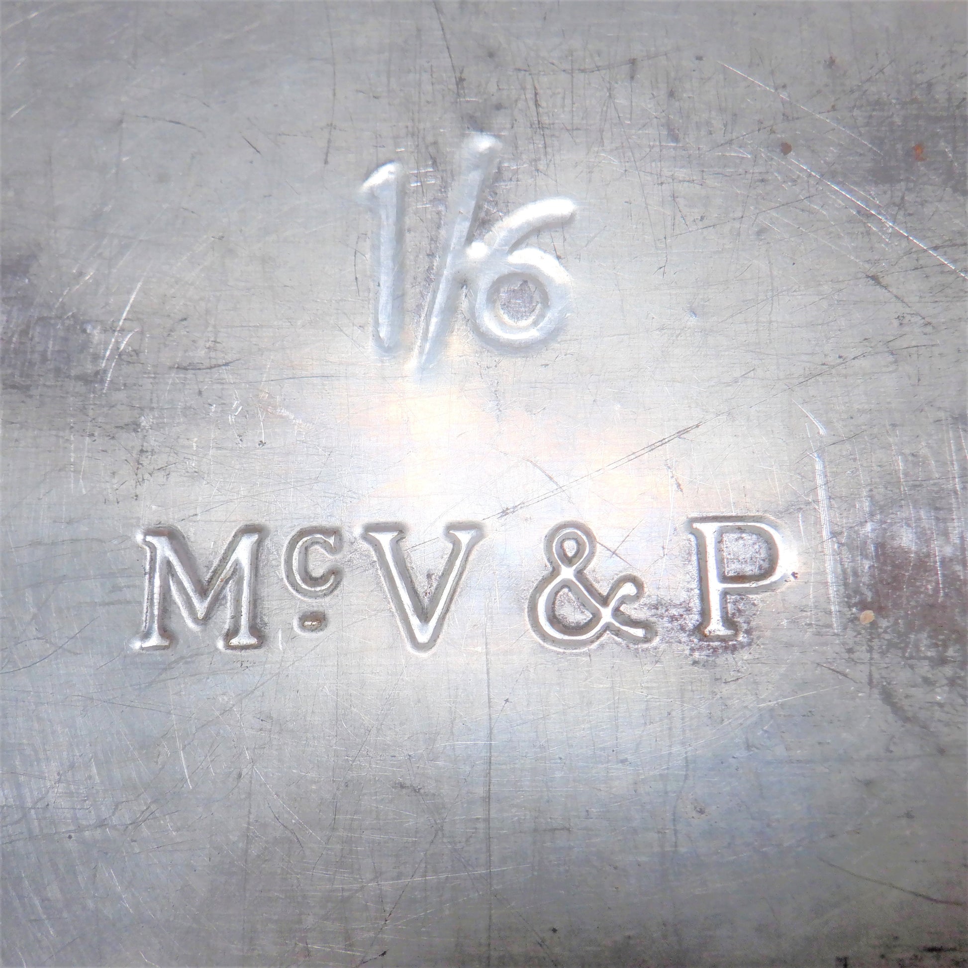 McVITIE & PRICE BISCUIT COMPANY: A Large Silver Antique Biscuit Tin Container that is a wonderful workhorse of a tin. Tin walls are fully wrapped along top edge, with one wall embossed '1-2'. The removable Rectangular lid is embossed with 'McV&P', and a unique design makes it also fit onto the bottom of the tin. The box construction also features folded inside edges with rolled corners. Box Base is applied separately and is embossed with '1/6 McV&P'.