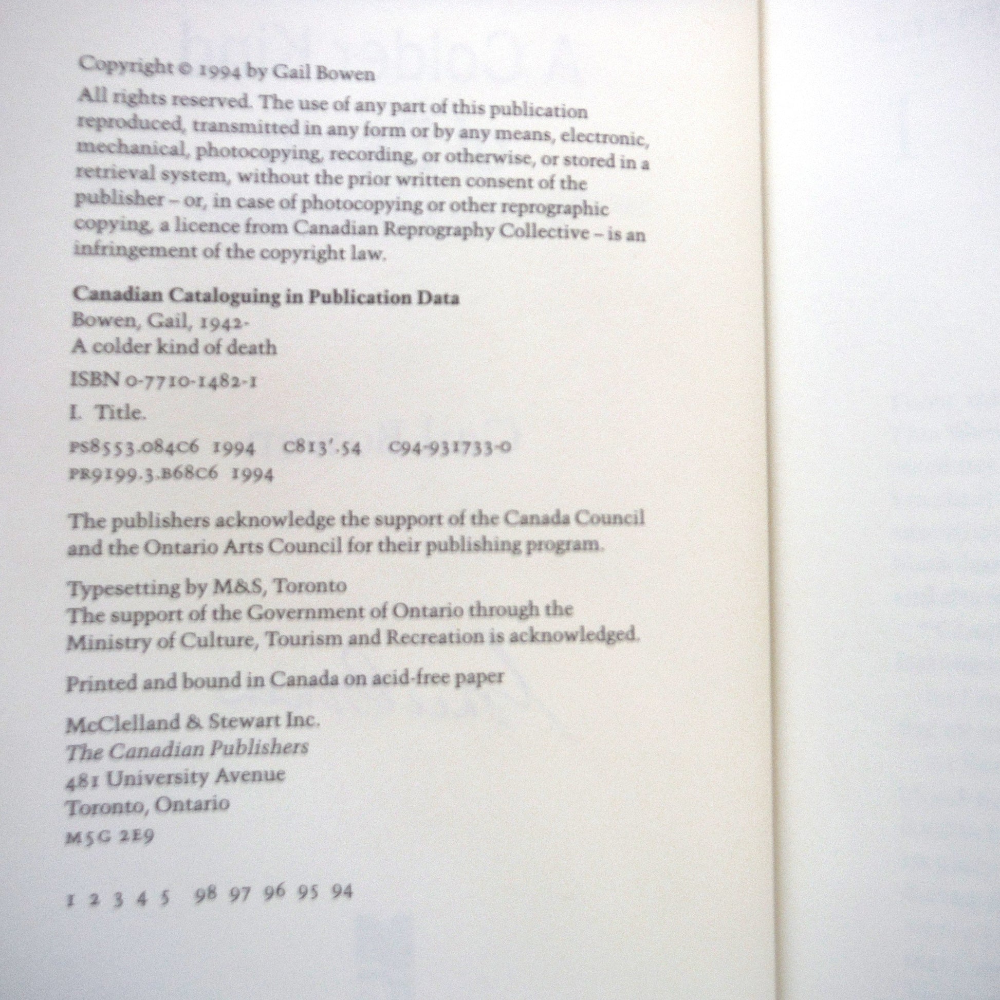A COLDER KIND OF DEATH, A Joanne Kilbourn Mystery by Gail Bowen (1st Ed. SIGNED)