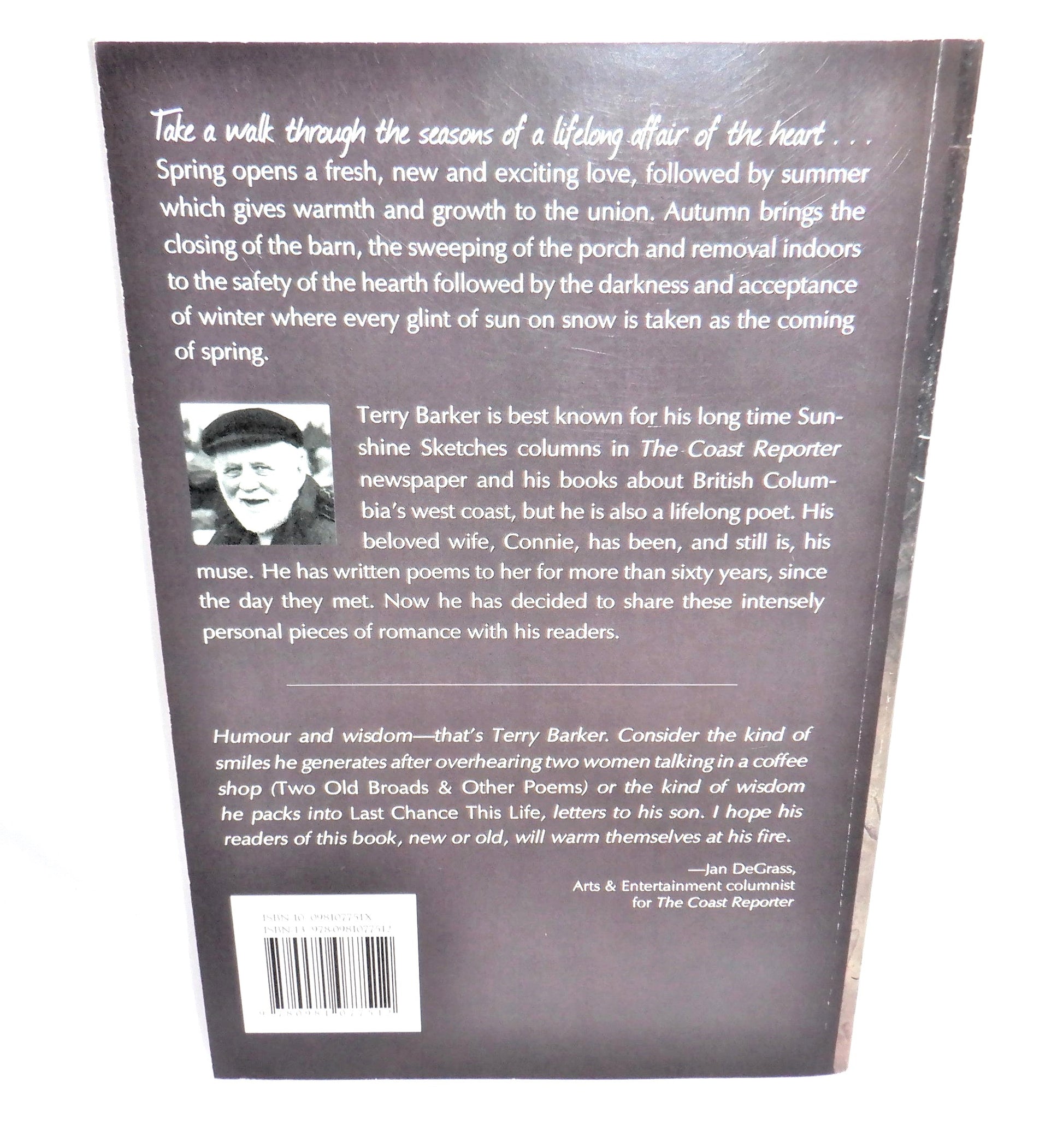 ABOUT THE AUTHOR: Terry Barker is best known for his long time Sunshine Stetches columns in The Coast Reporter newspaper and his books about B.C.'s west coast, but he is also a lifelong poet. His beloved wife, Connie, has been, and still is, his muse. He has written poems to her for more than sixty years, since the day they met. Now he has decided to share these intensely personal pieces of romance with his readers.