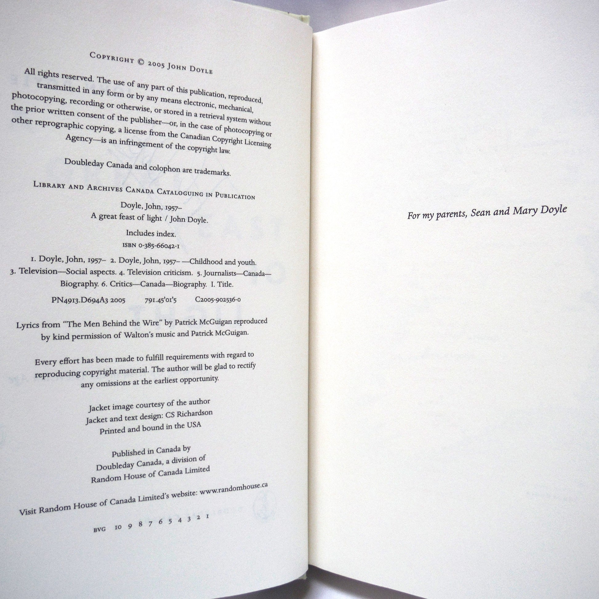 A GREAT FEAST OF LIGHT, Growing Up Irish in the Television Age, by John Doyle (1st Ed. SIGNED)