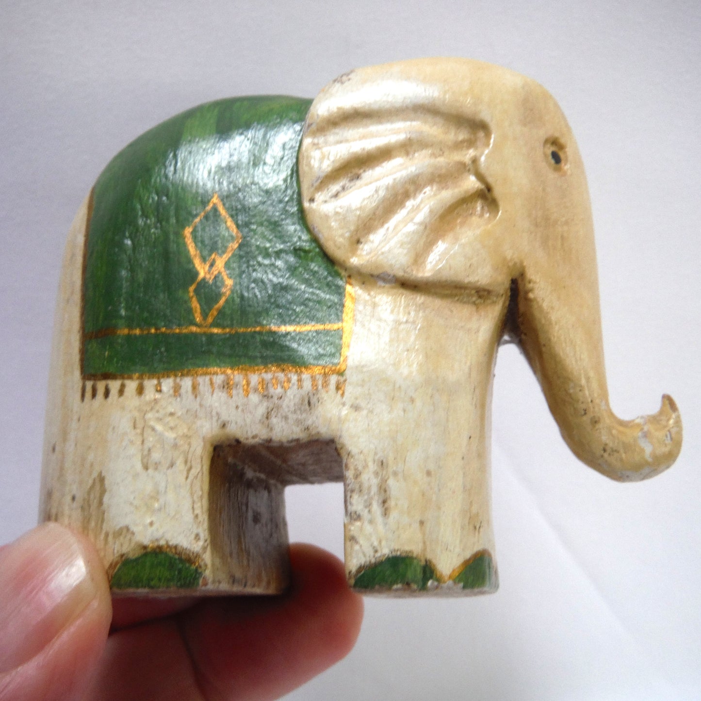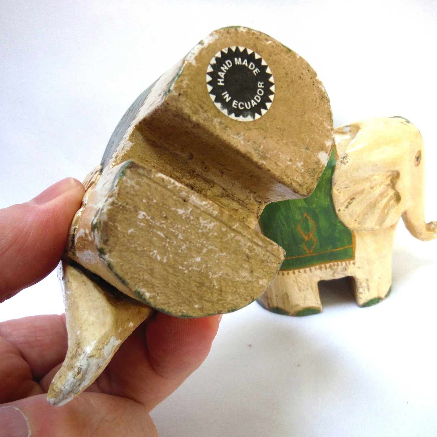 A Pair of Wooden Hand-Carved and Painted ELEPHANTS, Hand Made in Equador, and they've got a bangs and bumps to them, but they still look very displayable. Lovely muted yellow, with green and gold overpaint. The original sticker is still on the bottom of one elephant. Made in Equador.