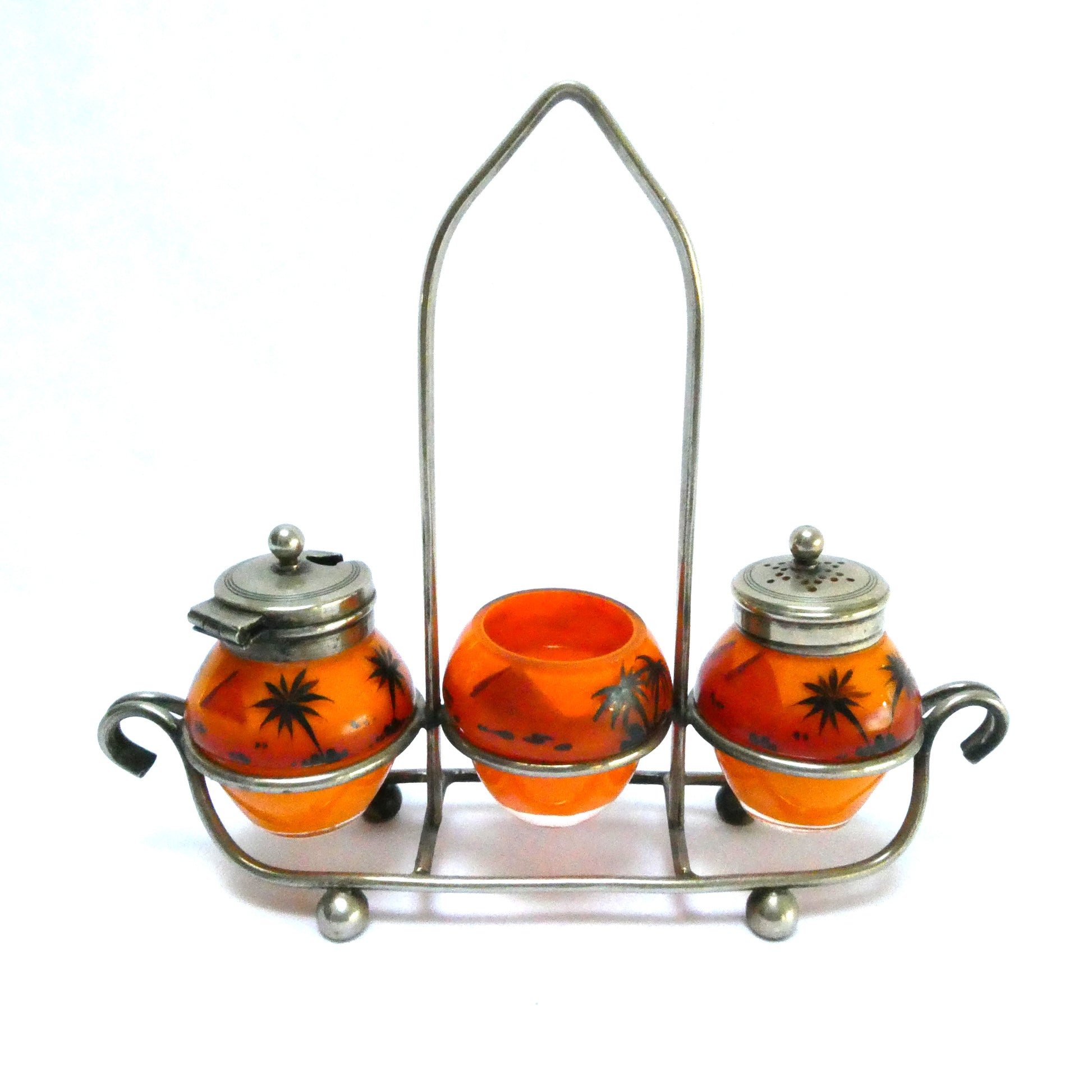 This antique 1940s hand-painted tropical orange 3-piece glass condiment cruet set with a silver-plated caddy is in excellent condition. The glass is free of chips or cracks, and the vibrant painted images, possibly depicting Egypt or another warm locale, are rich and scratch-free. The stand is in great shape, though it could use a bit of polishing. Featuring silver plate composition (EPNS) and a style that harks back to a bygone era, this set would make a charming addition to any dining table. It includes a cruet and matching accessories, all radiating antique charm that will impress both guests and collectors. EPNS markings are found on the holder/stand and on the tops of the salt and pepper lids. The glass pieces are as originally produced, with no damage and only minor manufacturing bubbles. All tops and the hinge are in superb condition with no signs of wear.