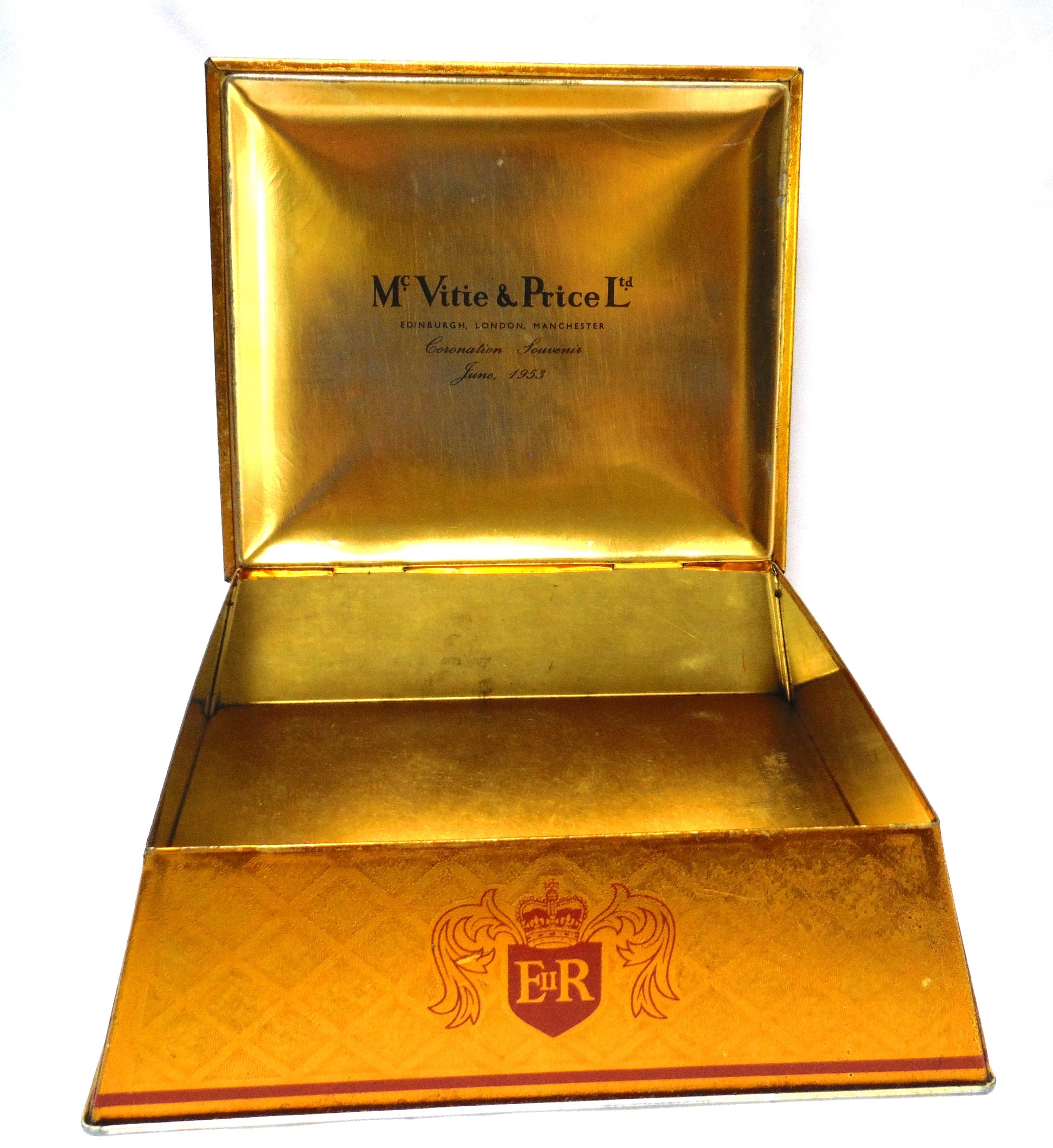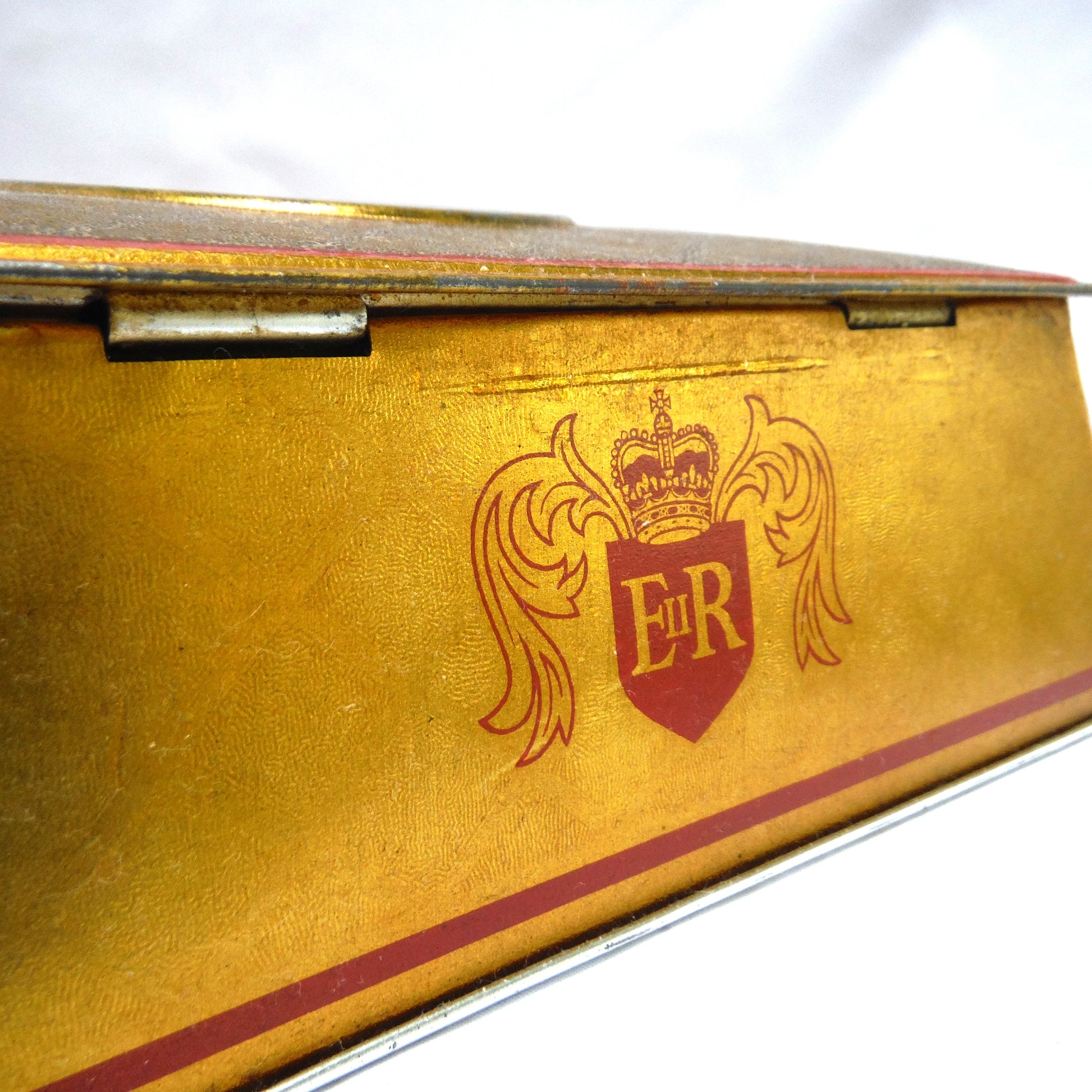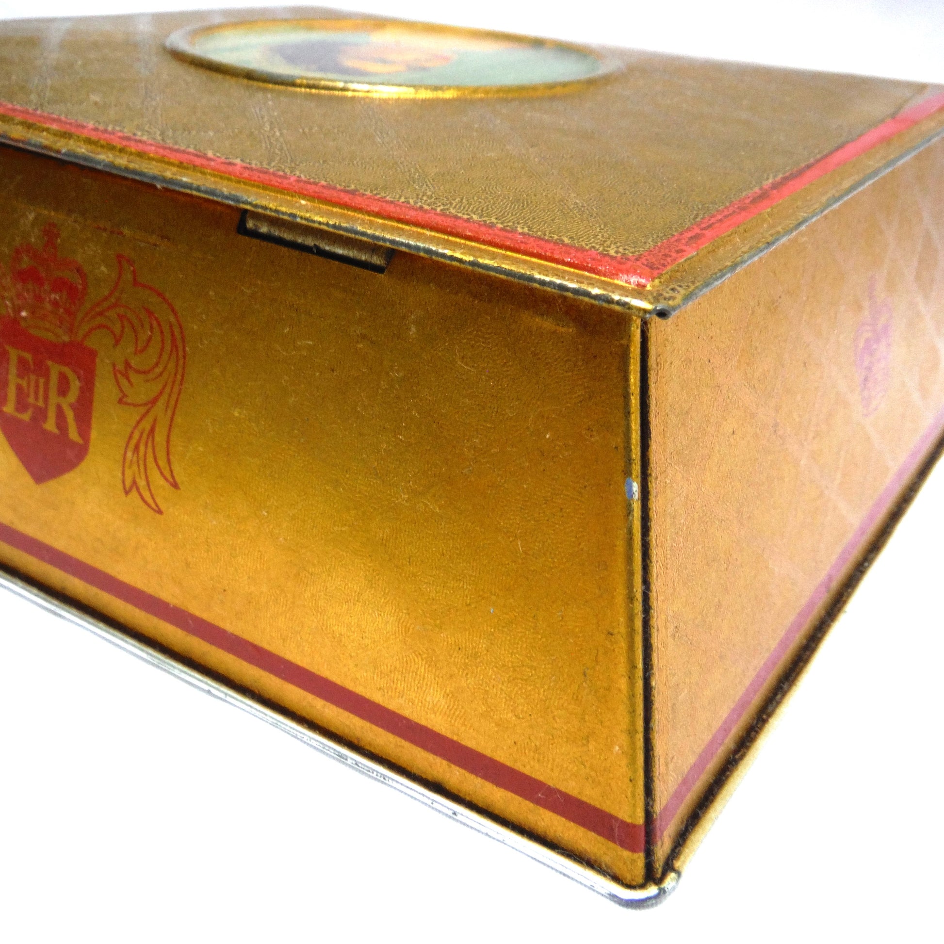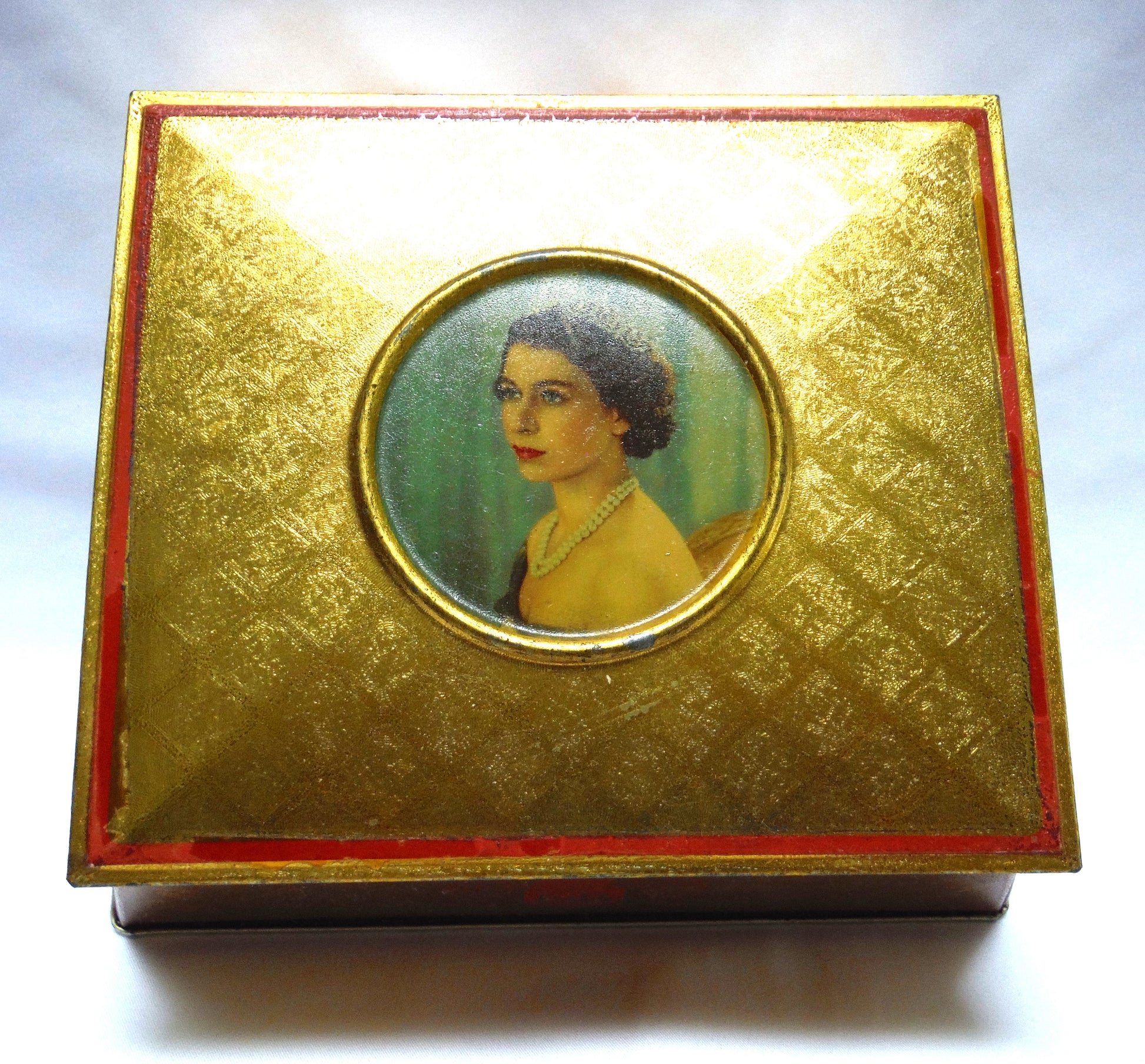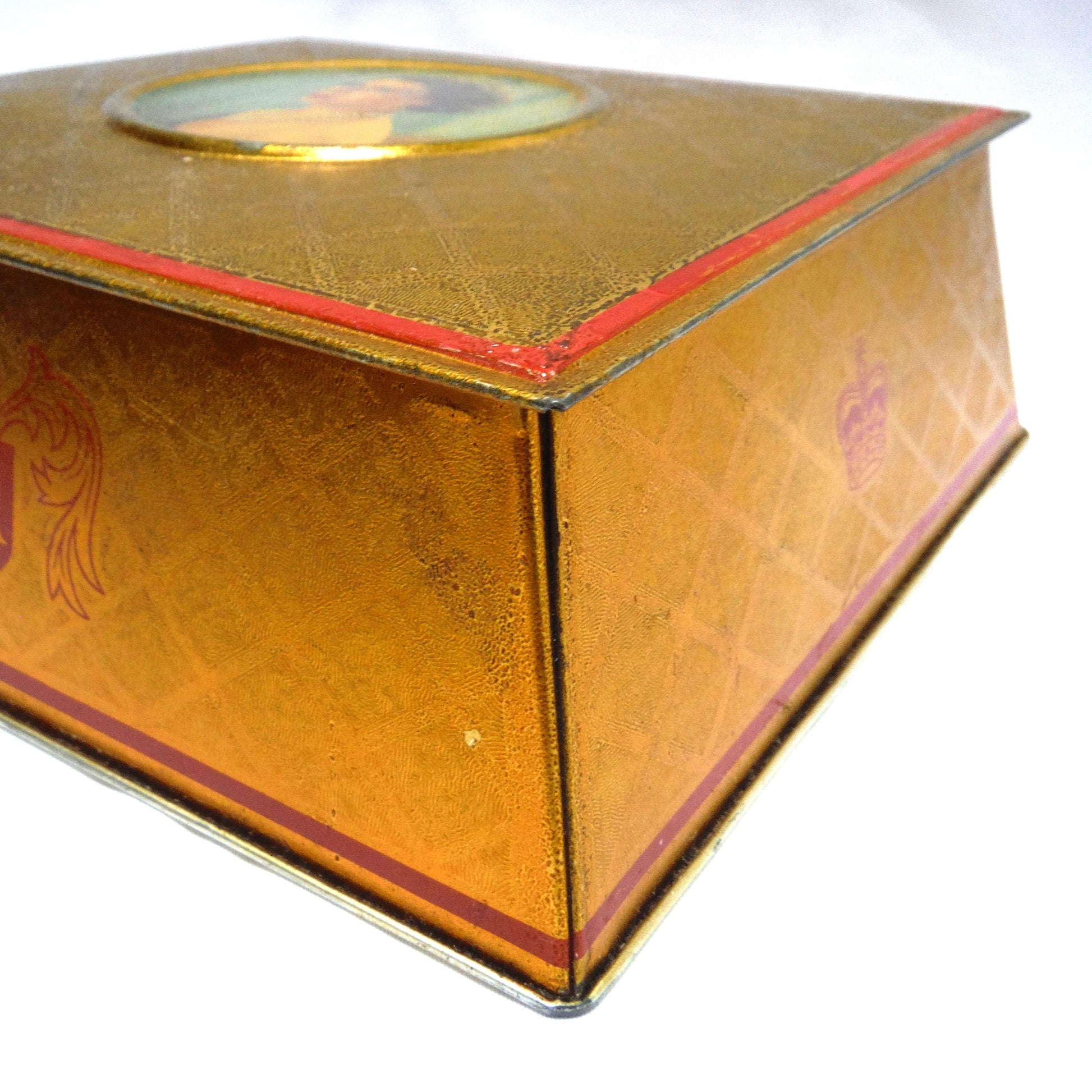 Antique Gold Hinged-Lid 1953 Coronation Tin by McVitie & Price of Great Britain: "CAMEO OF QUEEN ELIZABETH II'