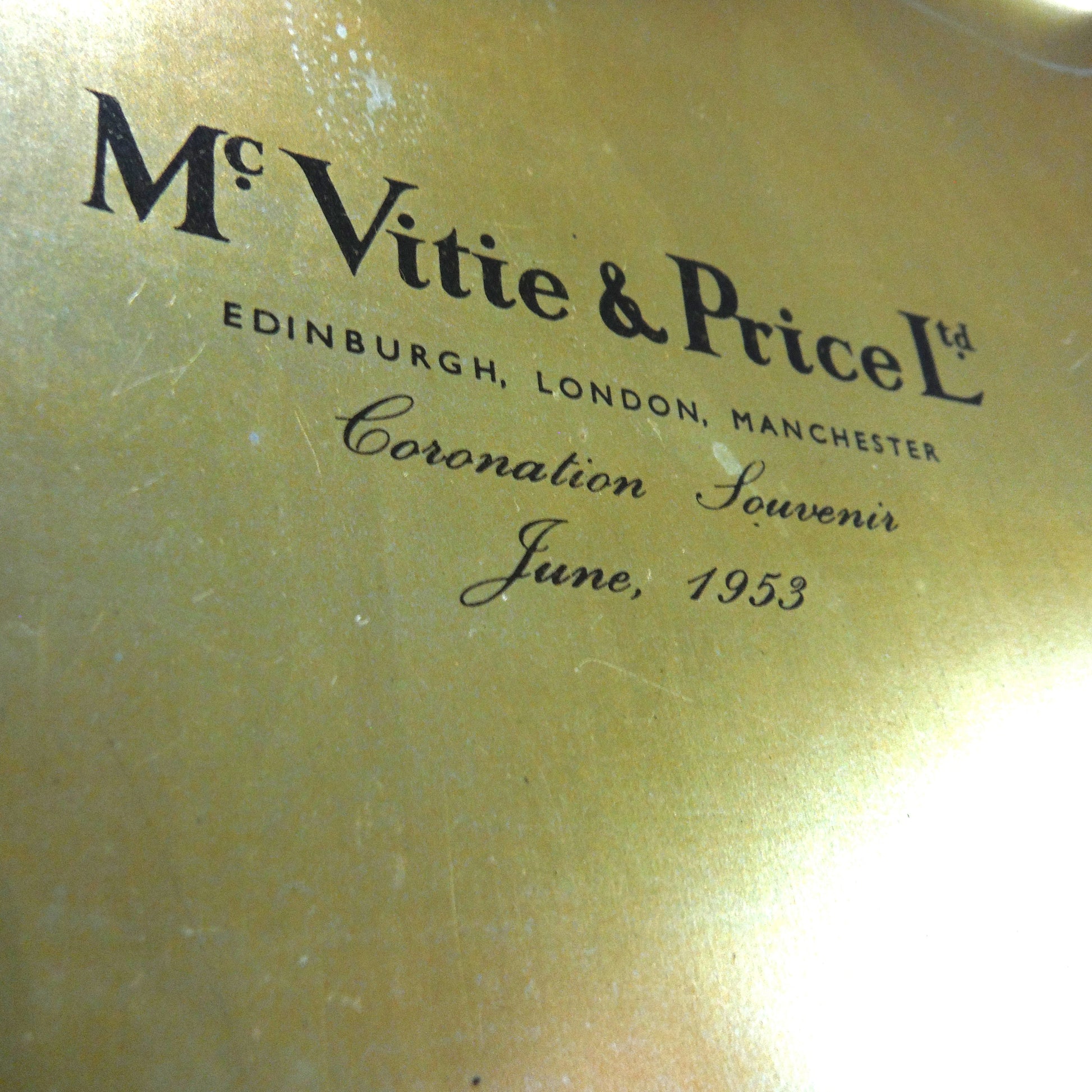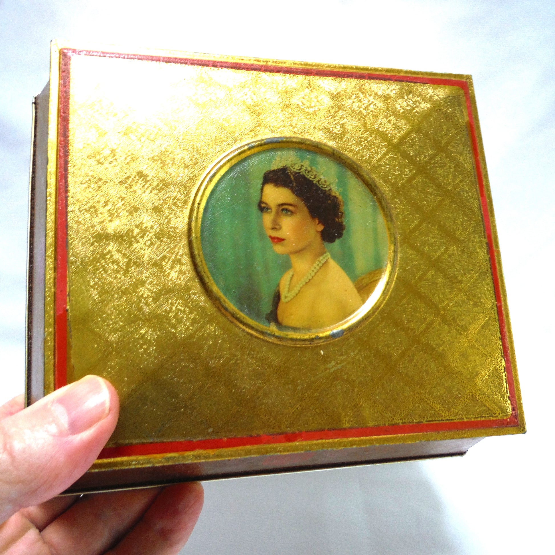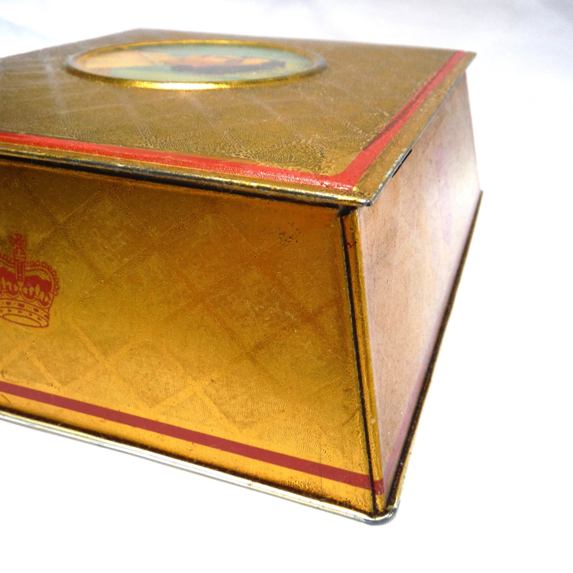 This Antique 1953 Coronation Tin by McVitie & Price of Great Britain, features a beautiful "CAMEO OF QUEEN ELIZABETH II', and it's in excellent condition! The tin screams REGAL, all decked-out in a brilliant gold-finish with ruby-red highlites. The unique shape is topped with a double thick, hinged lid, and the insides are in a bright gold finish and spotlessly clean. Black graphics are on inside lid, and is titled: Coronation Souvenir, June 1953. Made in England.