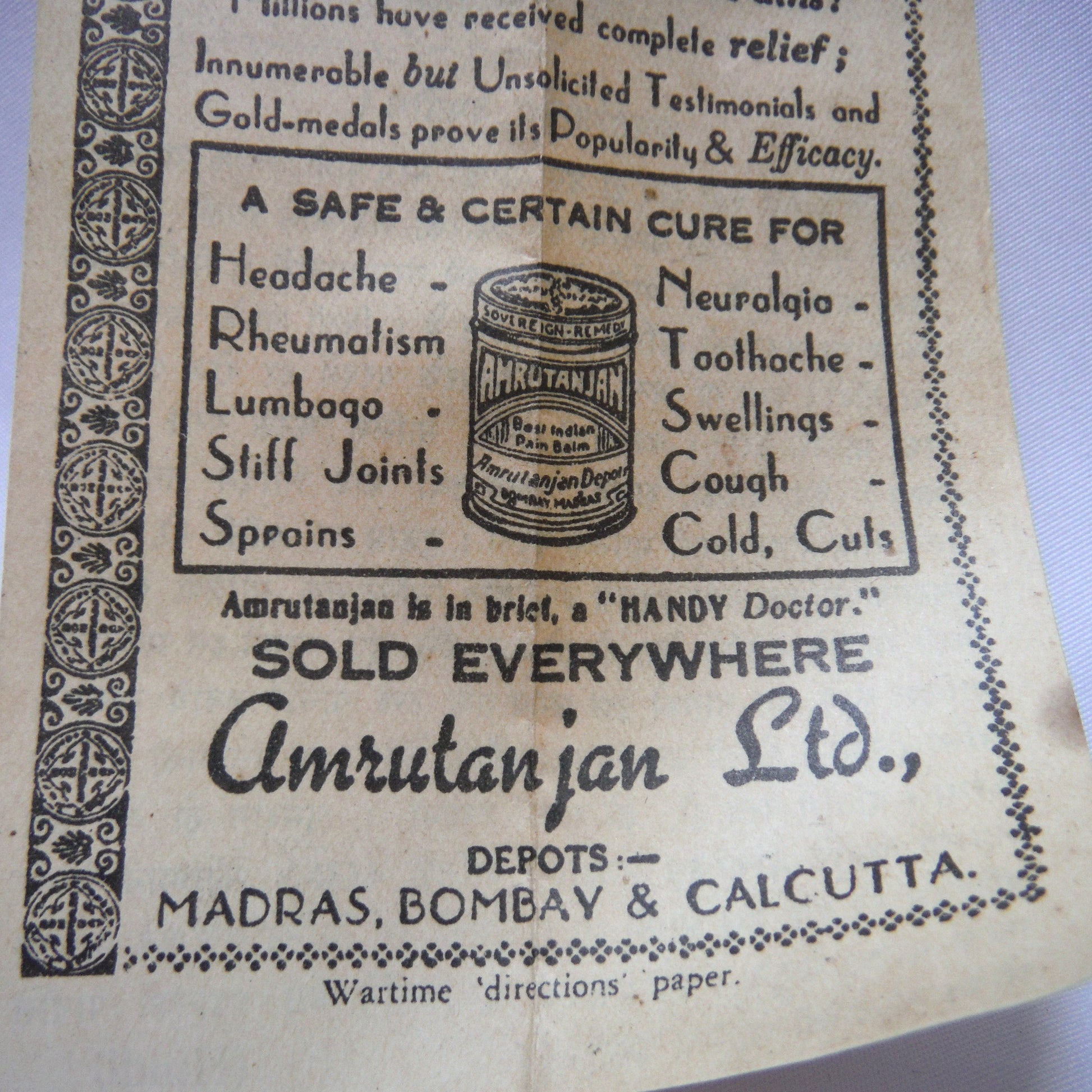 This rare antique WWII tin and glass container was produced by AMRUTANJAN Limited, Bombay, Madras, during or just at the end of the war, as indicated by the "Wartime 'Directions' Paper" that is included. The company had been making the BEST INDIAN PAIN BALM for over five decades at that time! The outer tin container itself is a collector's item, but this set also contains the original glass bottle, labeled Batch No. 26, which is still filled with the initial product. The tin still has the majority of the paper excise seal, and the original instruction sheet is also included. This was all made in India, and the tin itself measures 1.75 inches diameter and 2 inches in height.