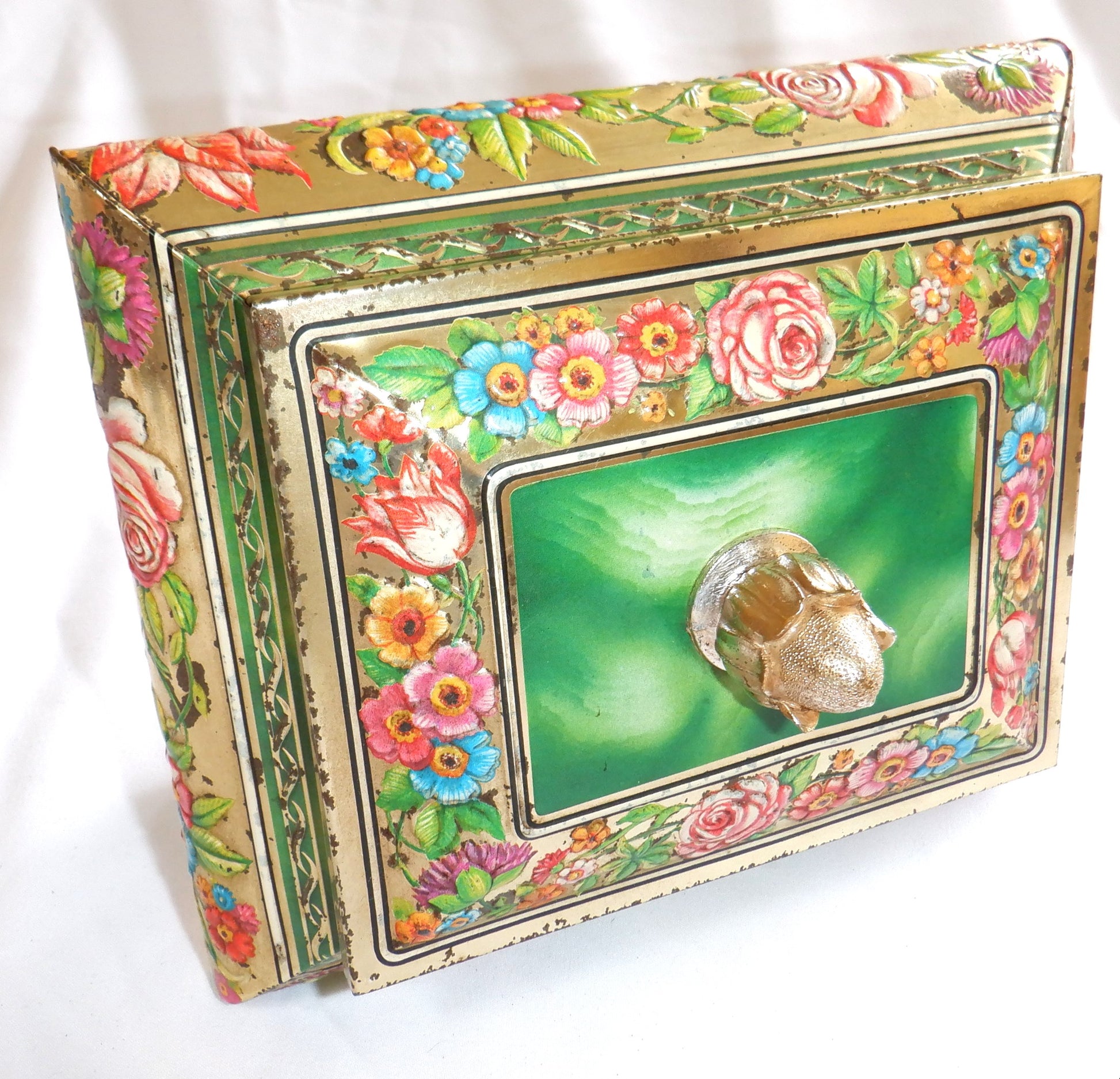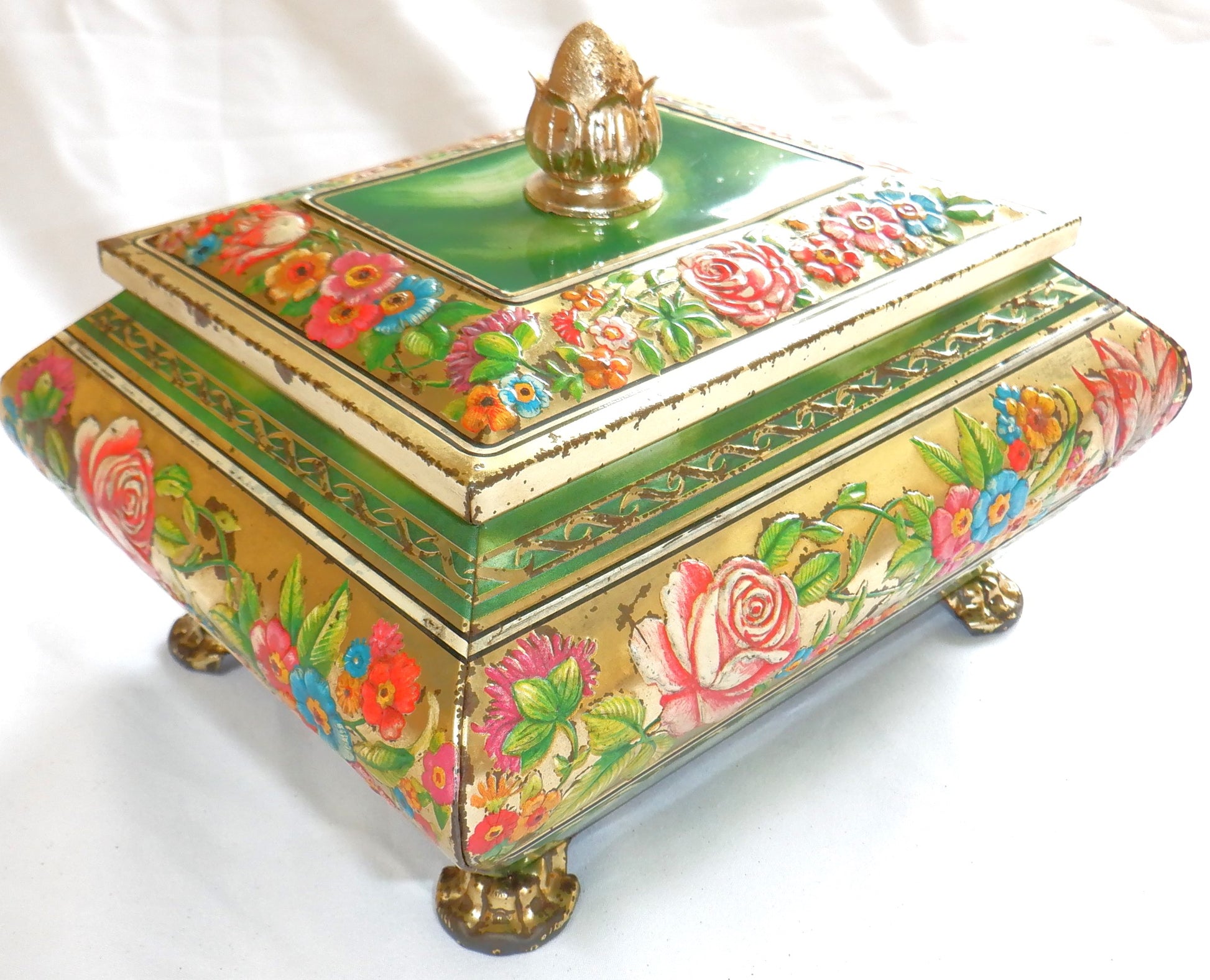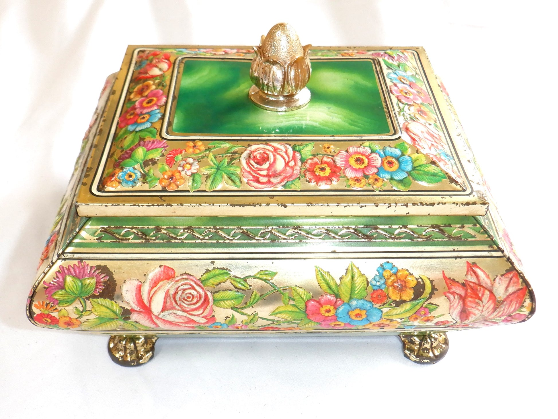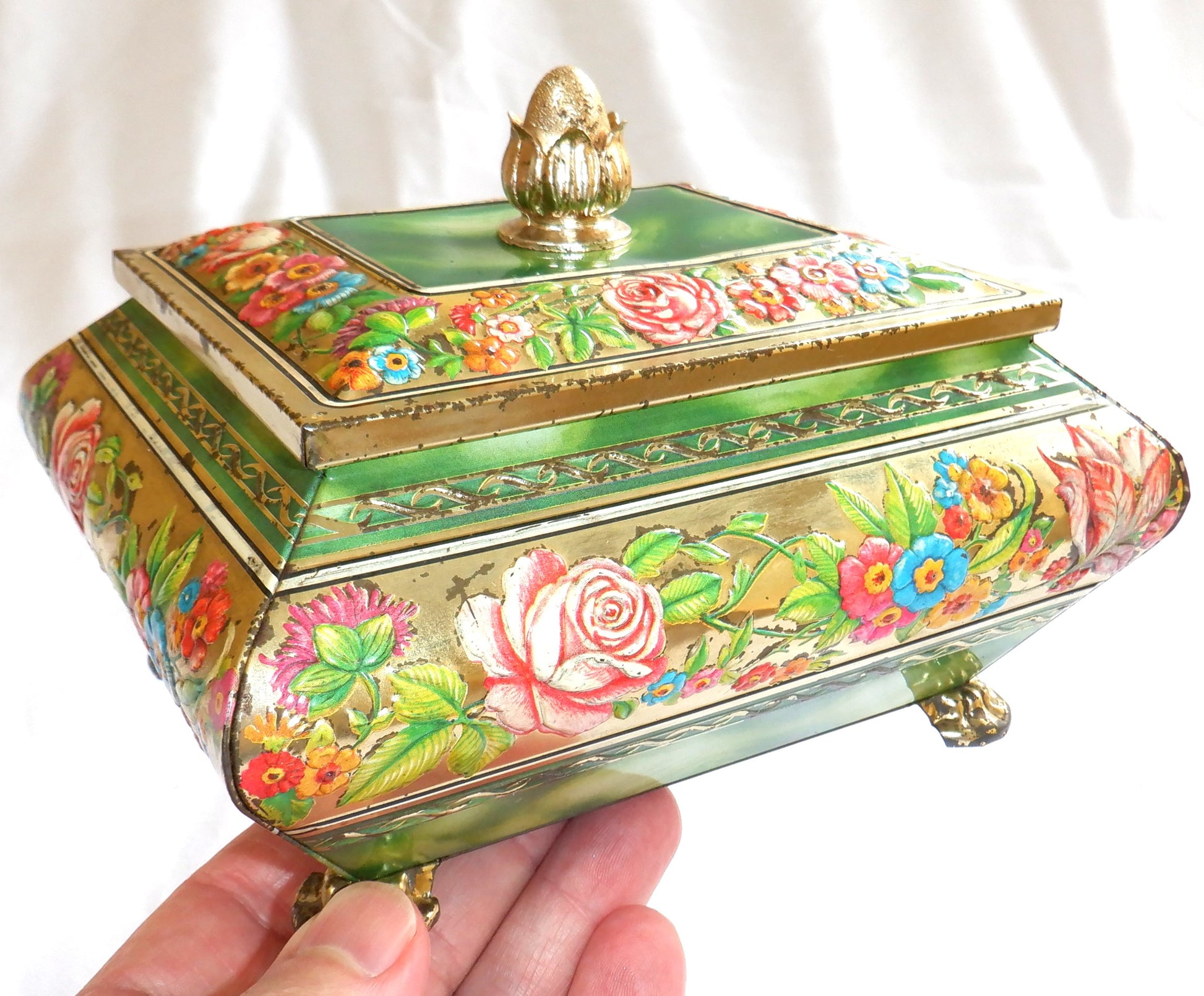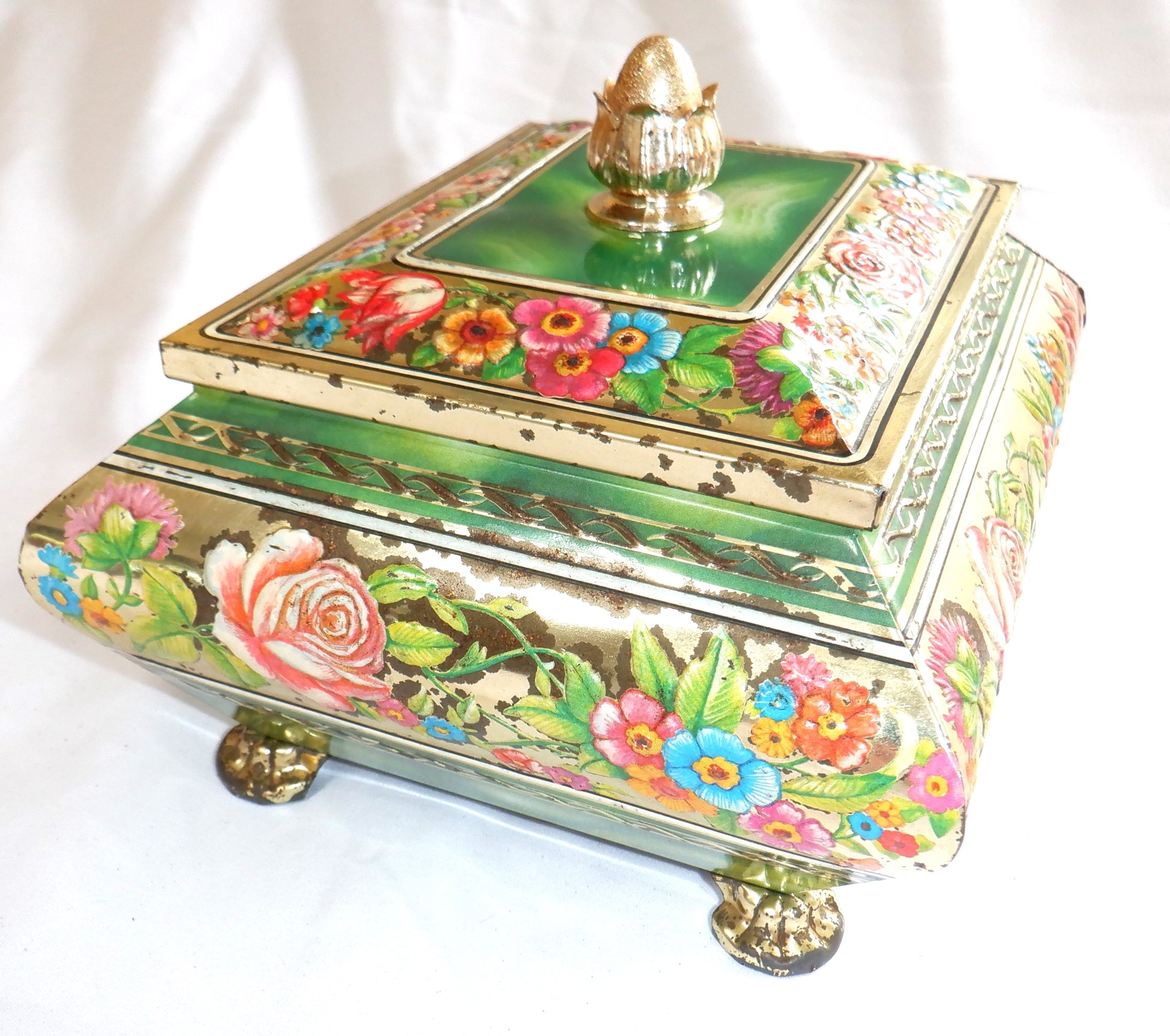 The entire Blue Bird Ornate Tin Container series is very under-appreciated, and has room to grow in price and collectibility! This MARBLED GREEN w/ Roses #1 is in good condition with some minor wear, rust issues, and an oxidized tin bottom. It is finished with a Green Marbled background finish, and highlited with White Roses and muted-pastel flowers. Removable lid, Plastic pull-handle, 4-fancy claw-feet. Made in England.