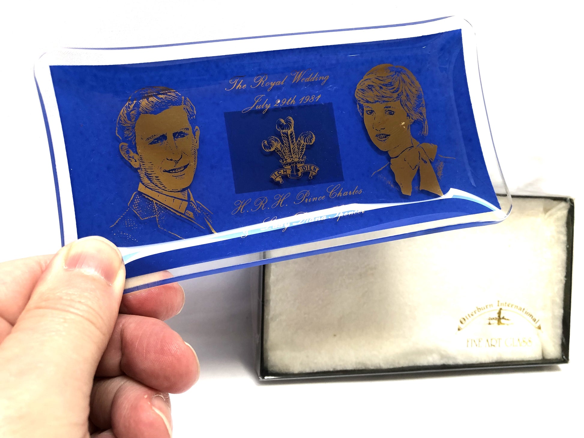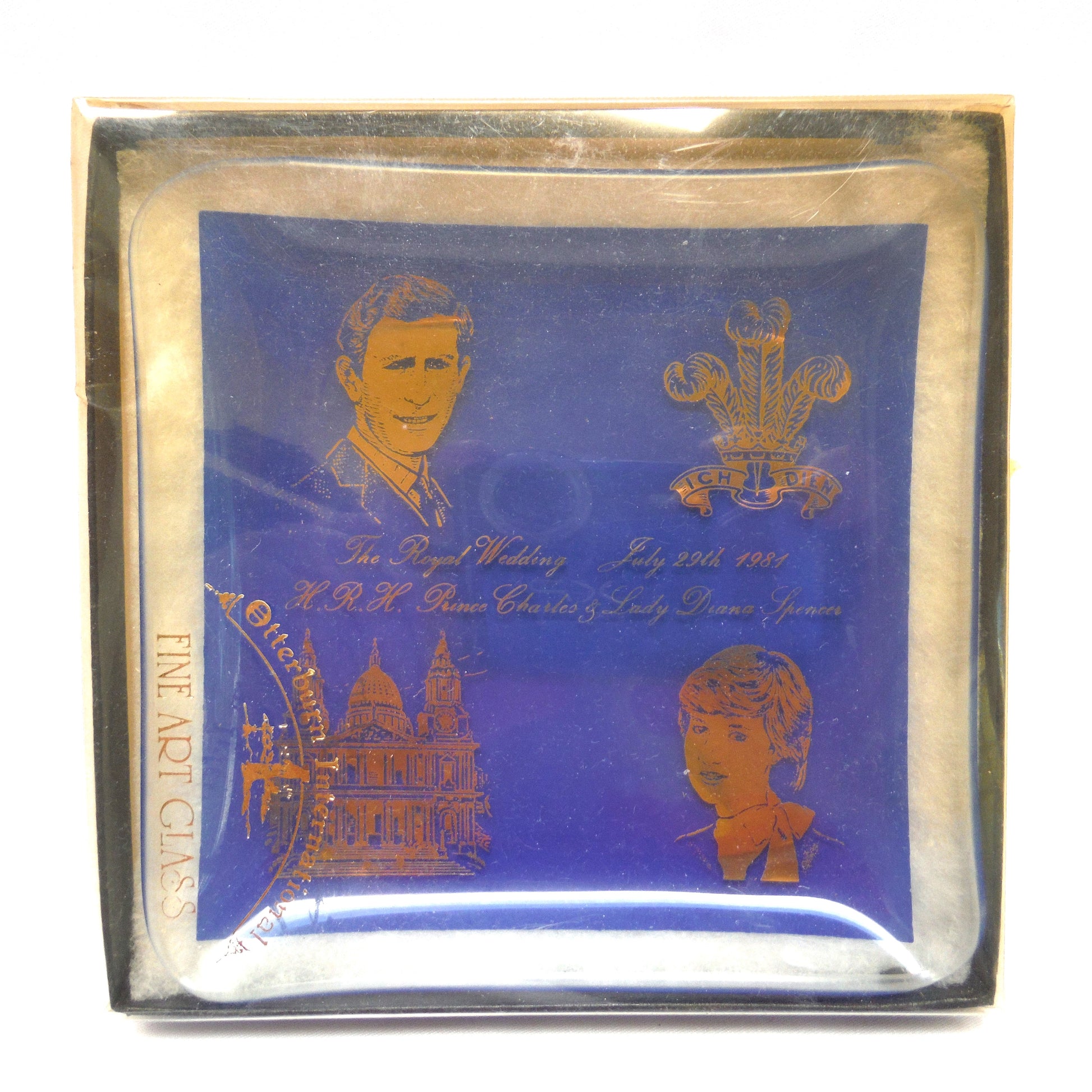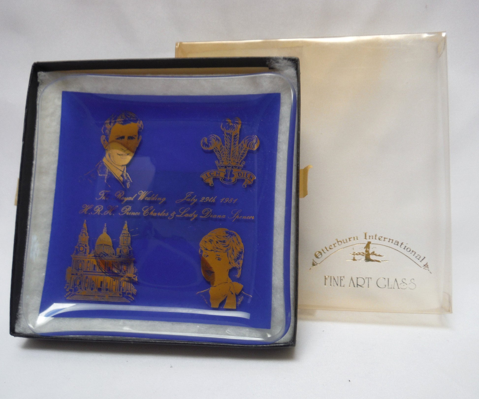 Blue Trinket Dish by Otterburn International Fine Art Glass of England: HRH Prince Charles and Lady Diana Wedding, 1981. Excellent Condition, no chips or scratches. Thick glass with back printed blue on gold stamp. Original box has age-wearing and yellowing on clear cover. Made in England.