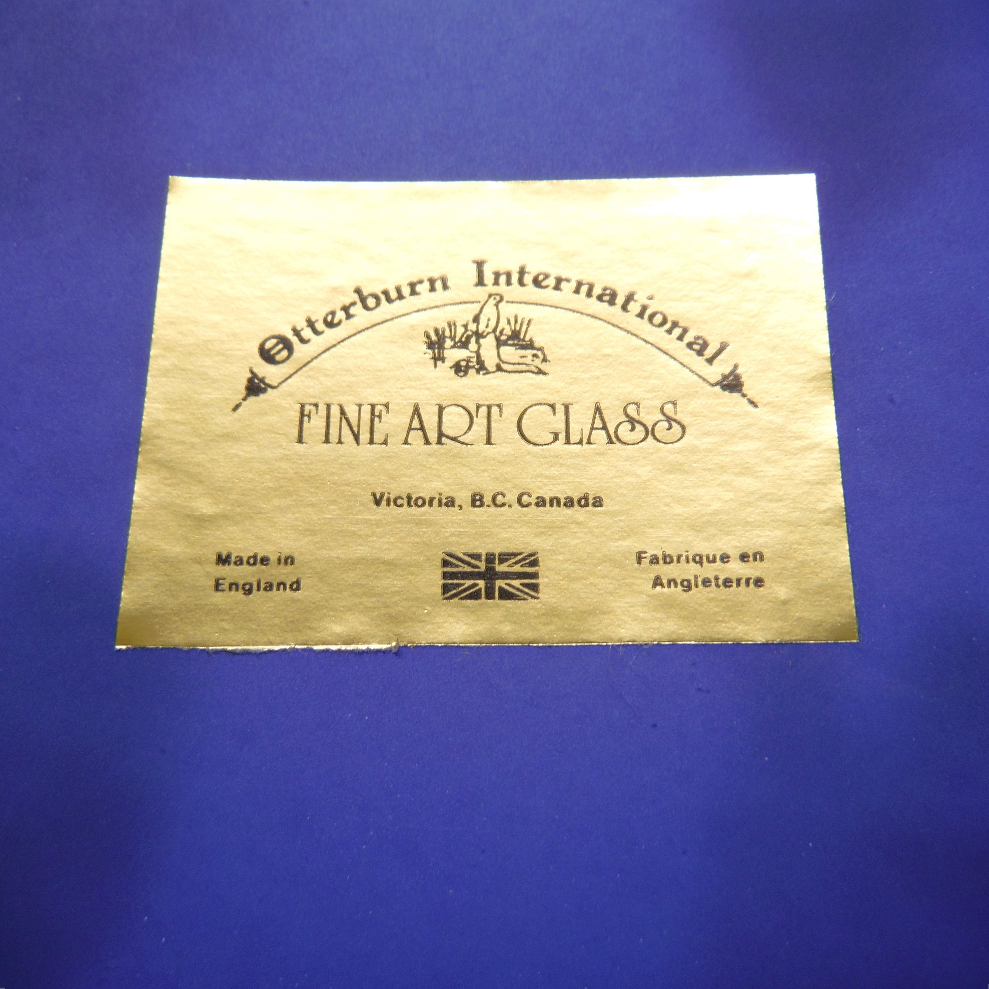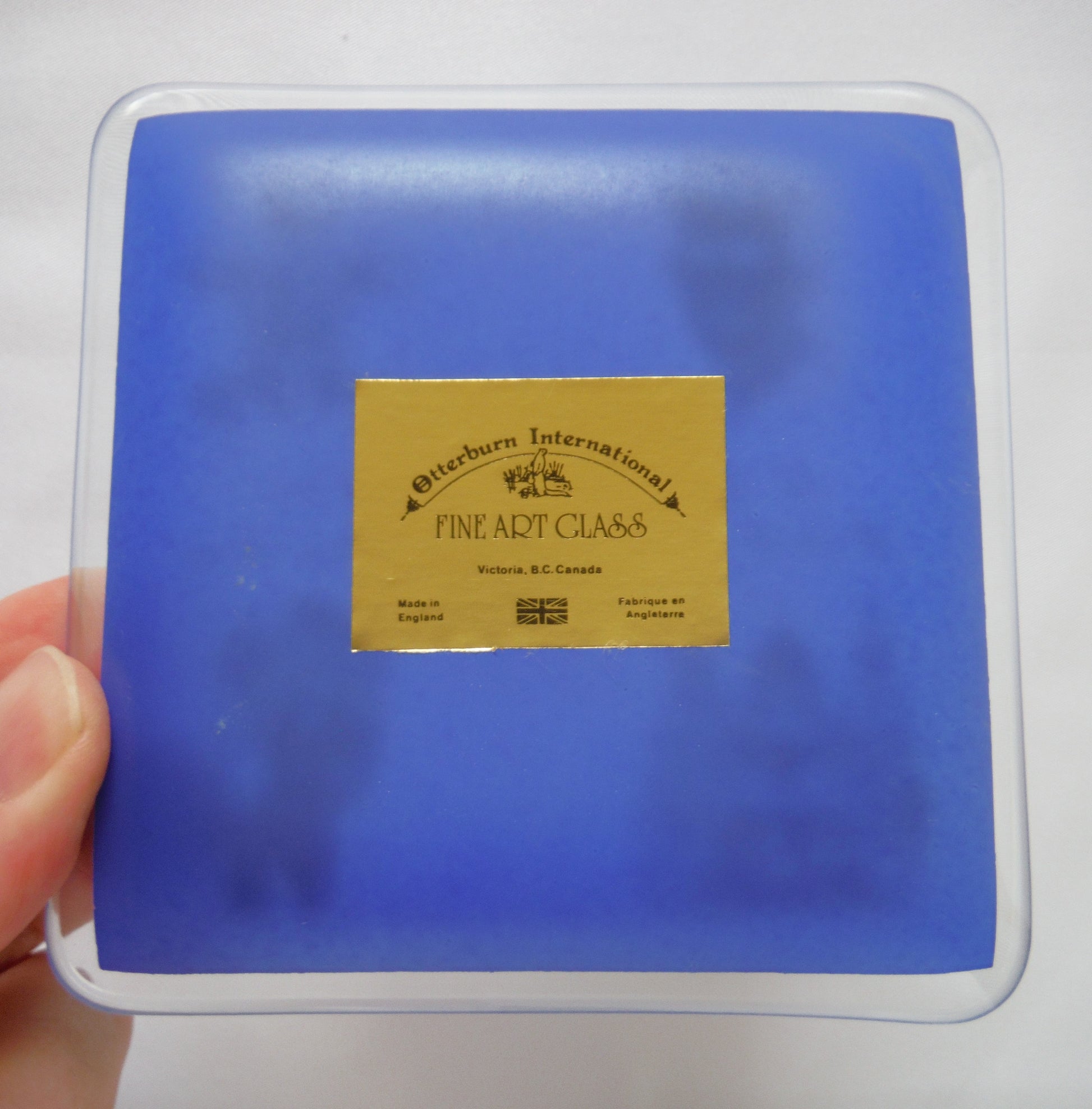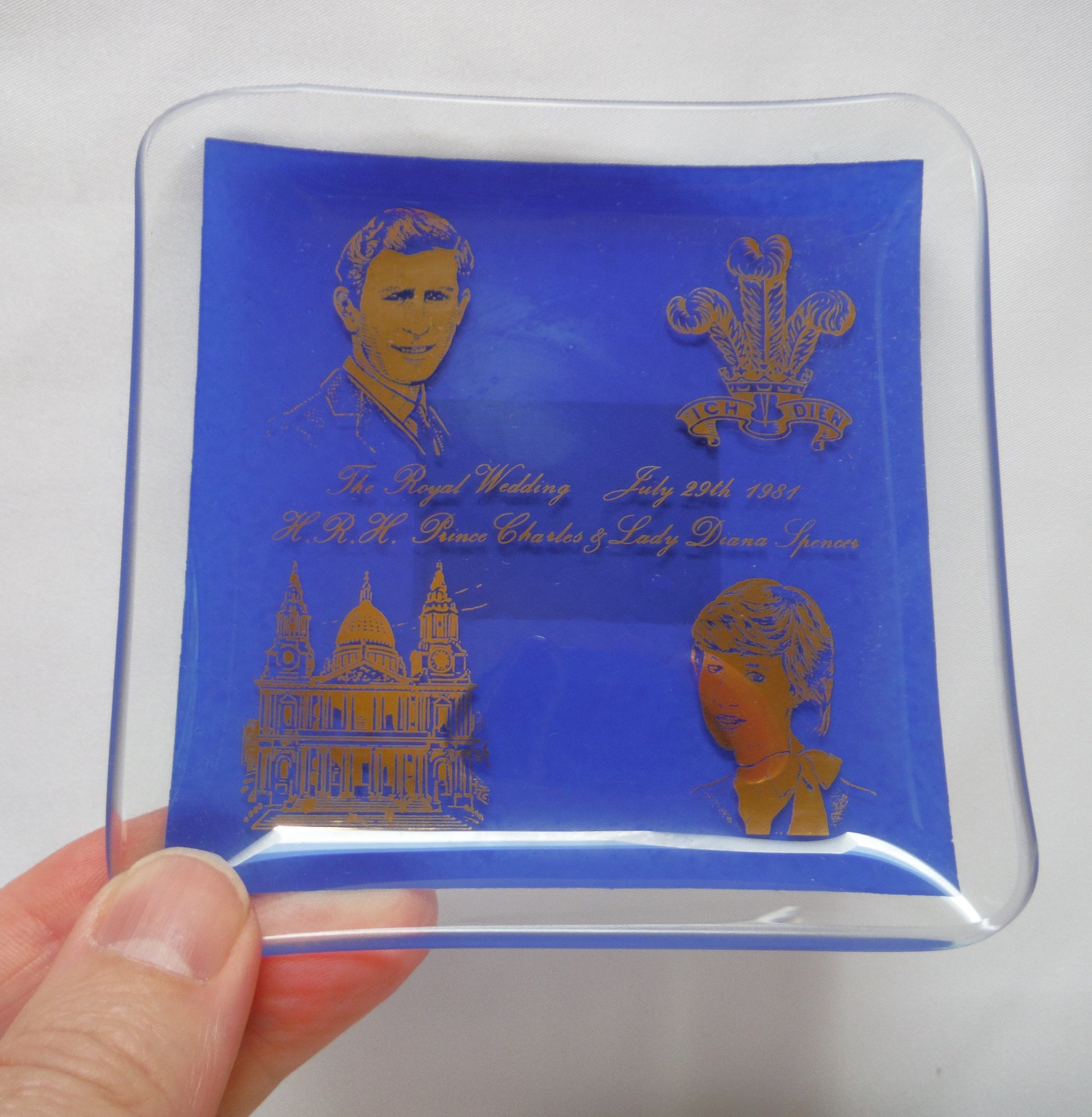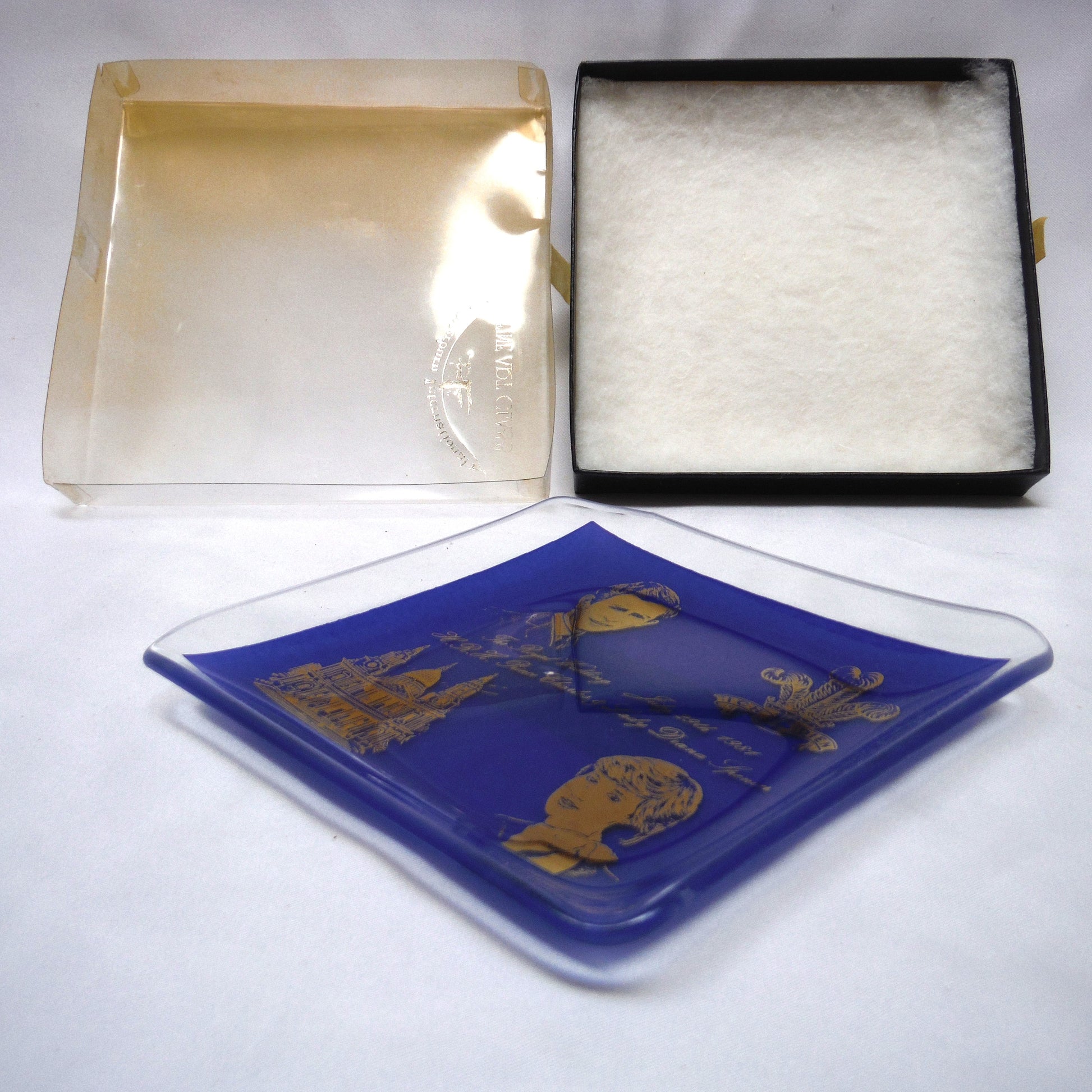 Blue Trinket Dish by Otterburn International Fine Art Glass of England: HRH Prince Charles and Lady Diana Wedding, 1981. Excellent Condition, no chips or scratches. Thick glass with back printed blue on gold stamp. Original box has age-wearing and yellowing on clear cover. Made in England.
