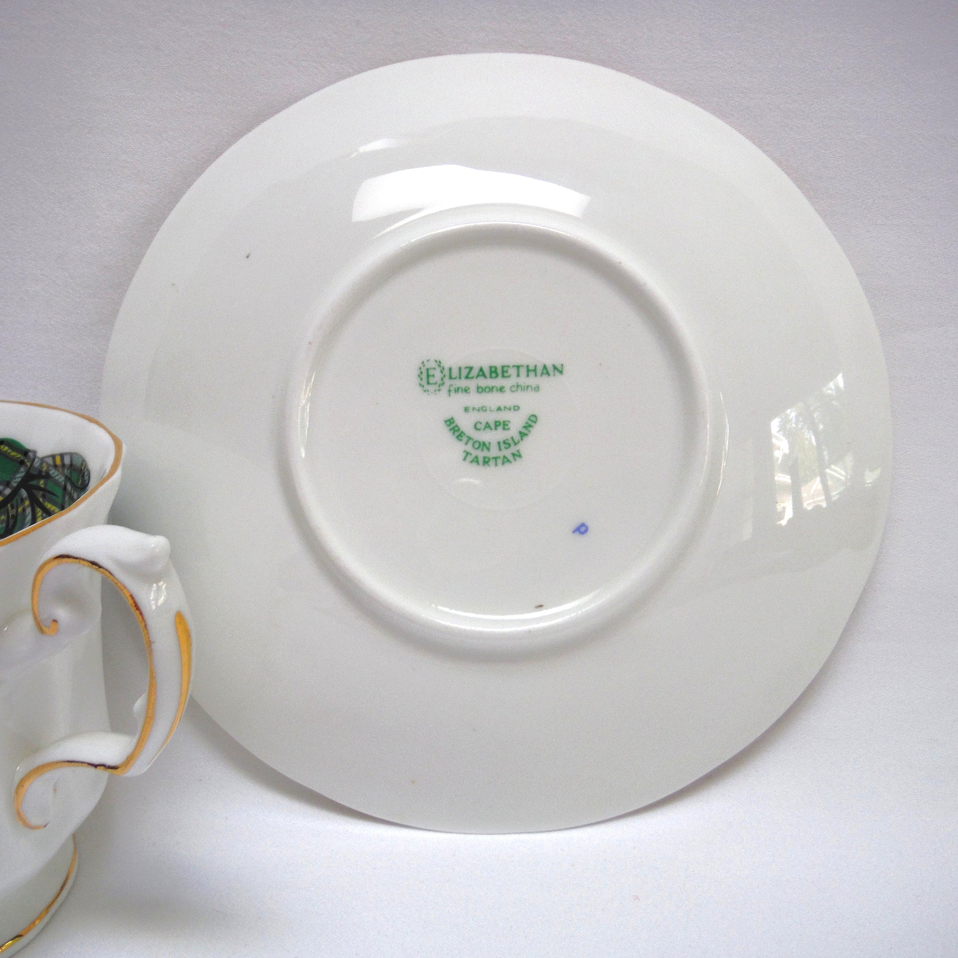 CAPE BRETON ISLAND TARTAN Tea Cup and Matching Saucer by Elizabethan Fine Bone China of England. Condition is Excellent, no chips, cracks or wear. The colours of the tartan, deep greens, bright yellow and grey, all shine through with depth and splendour, and the gold trim is solid and vibrant. Made in England.