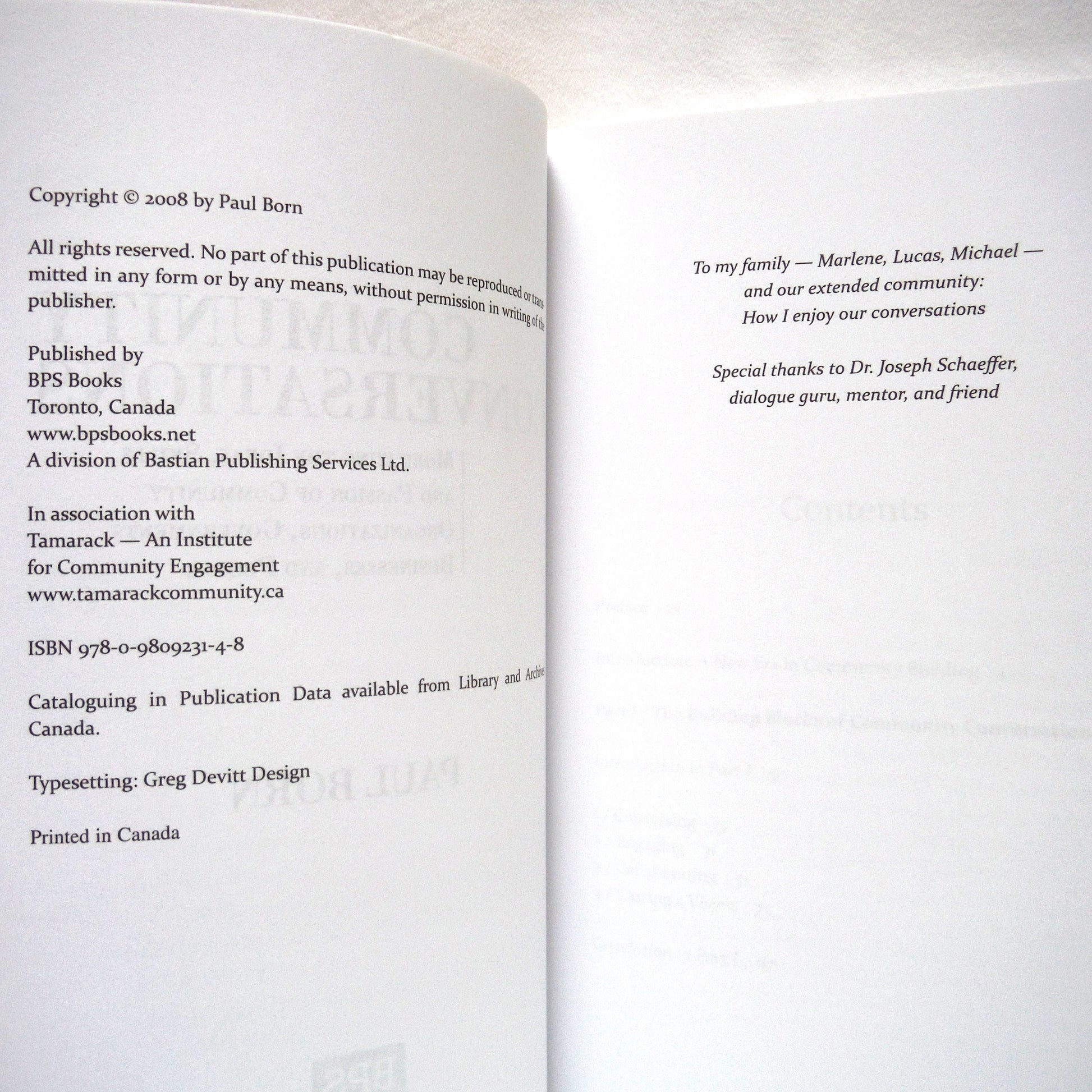 COMMUNITY CONVERSATIONS, Mobilizing the Ideas, Skills, and Passion of Comminity Organizations, Governments, Businesses, and People, by Paul Born, is an informative and inspiring guide to creating collaborative conversations, and offers ten practical techniques for hosting conversations in your community.