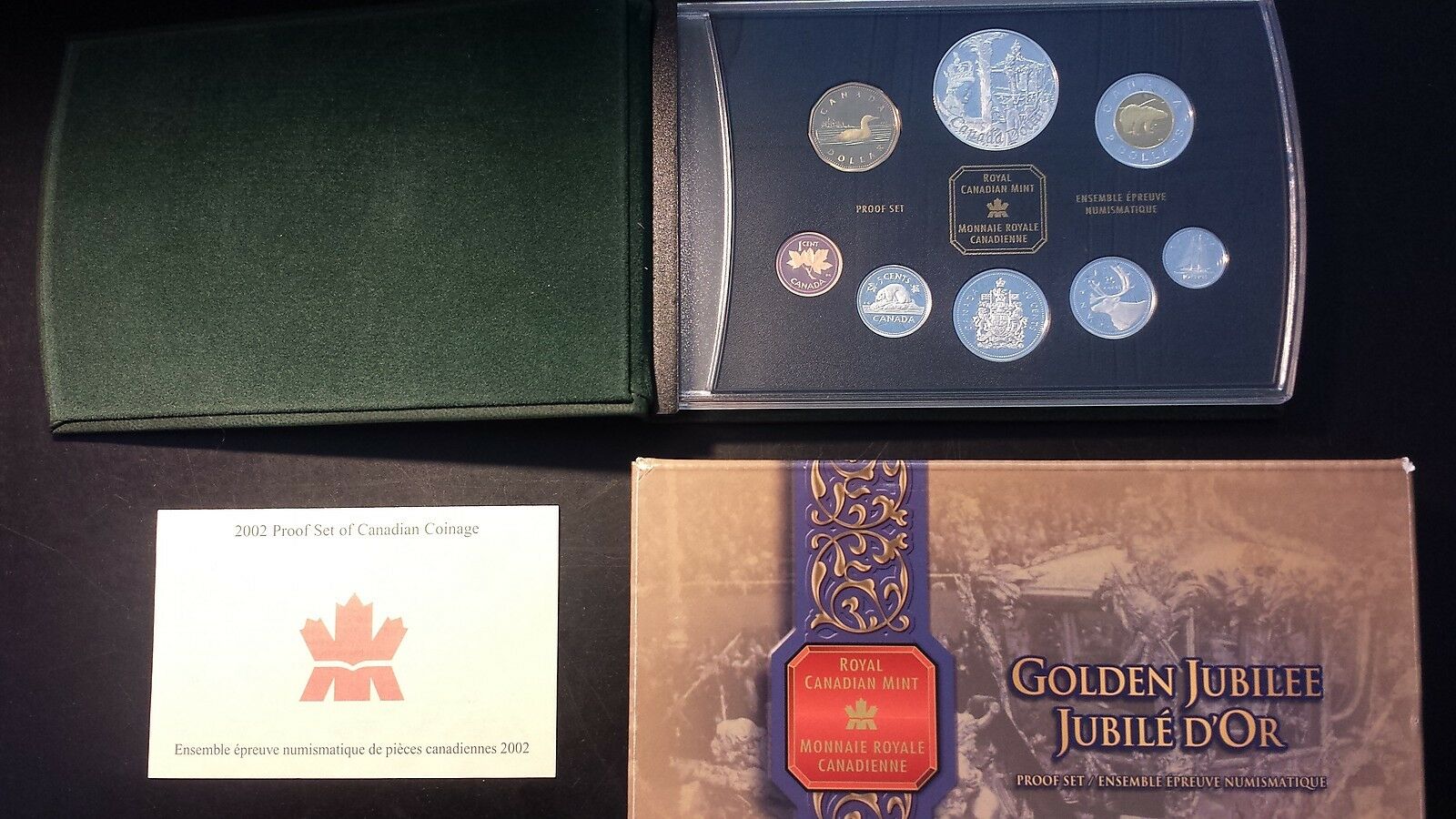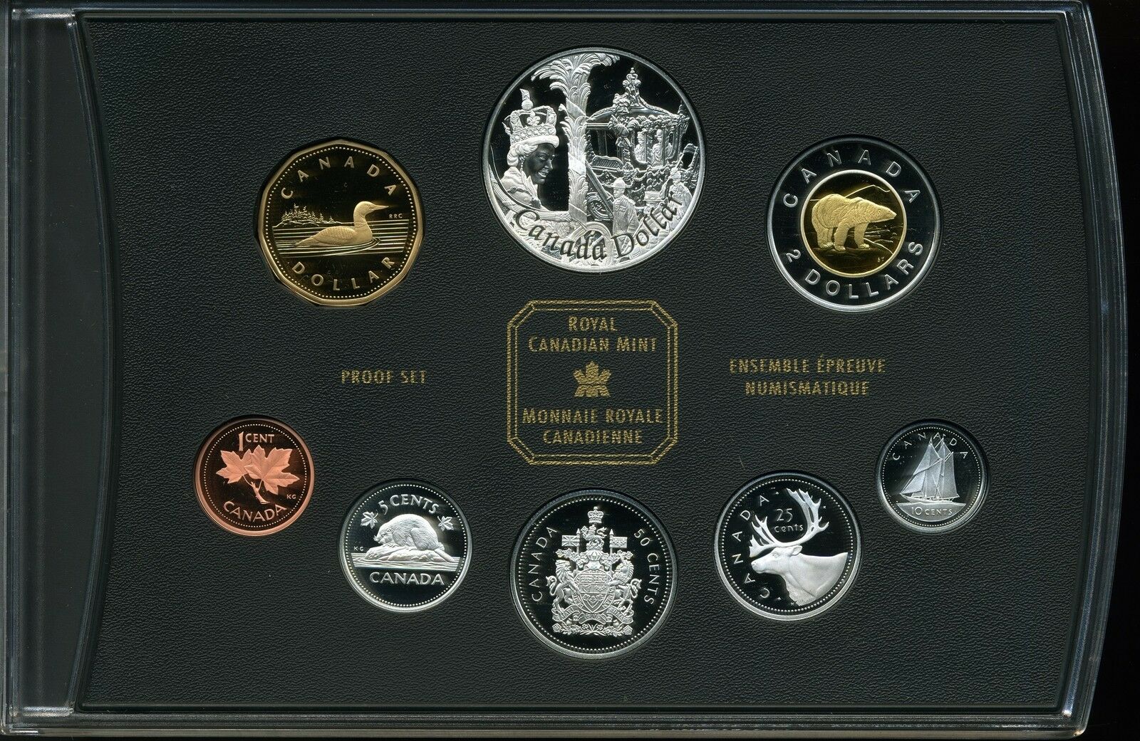 This beautiful 8-coin set marks "A Regal Curtsey for the Queen, Celebrating Elizabeth II on Her Golden Jubilee (1952-2002). "The 2002 proof set features both the commemorative silver dollar and the Loonie.