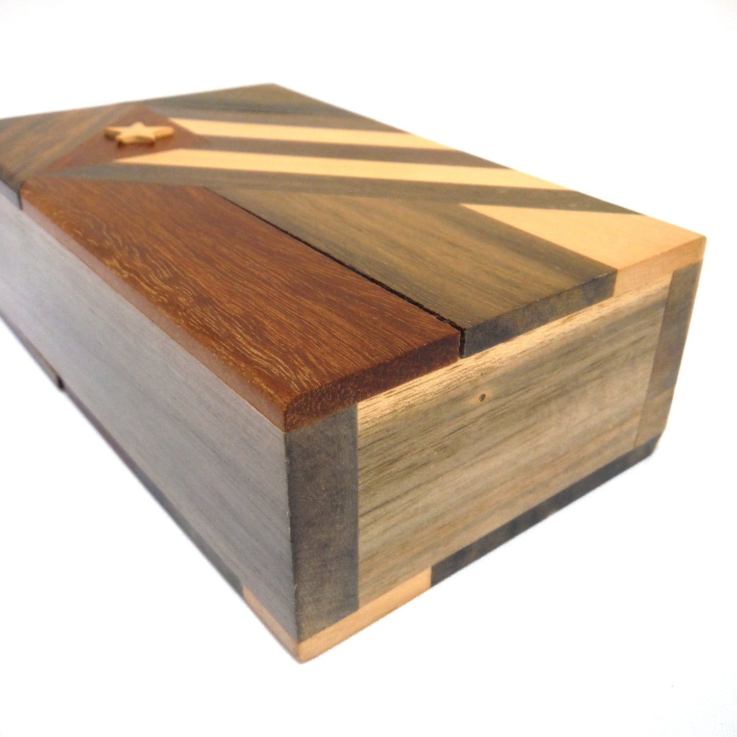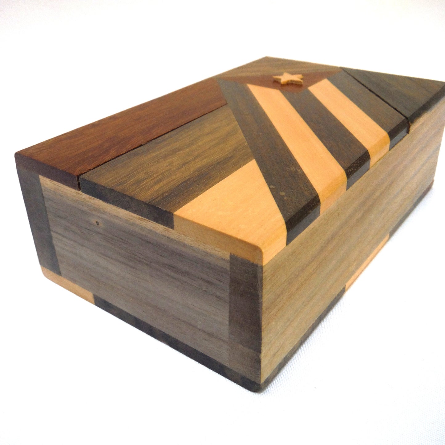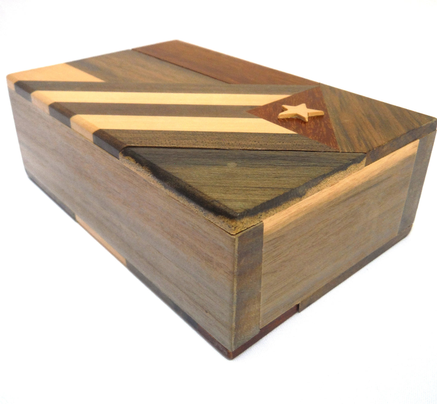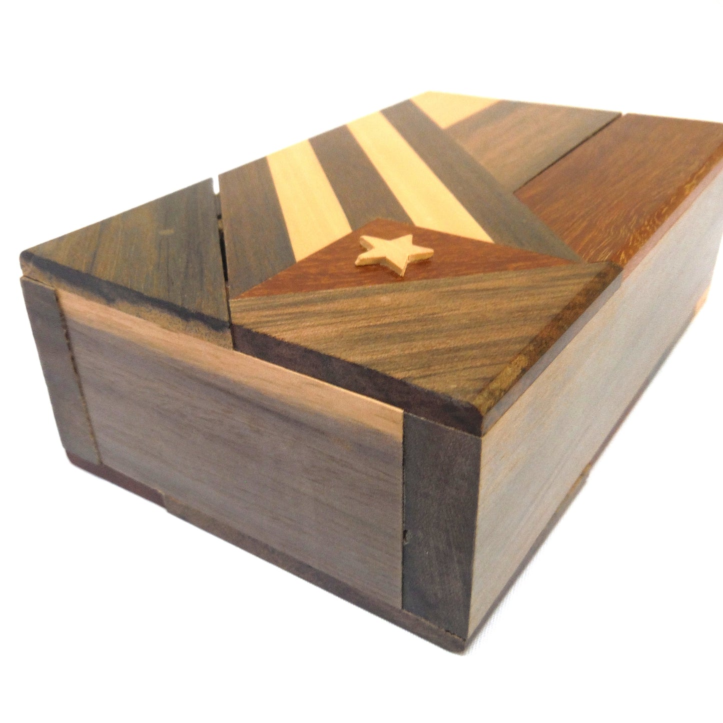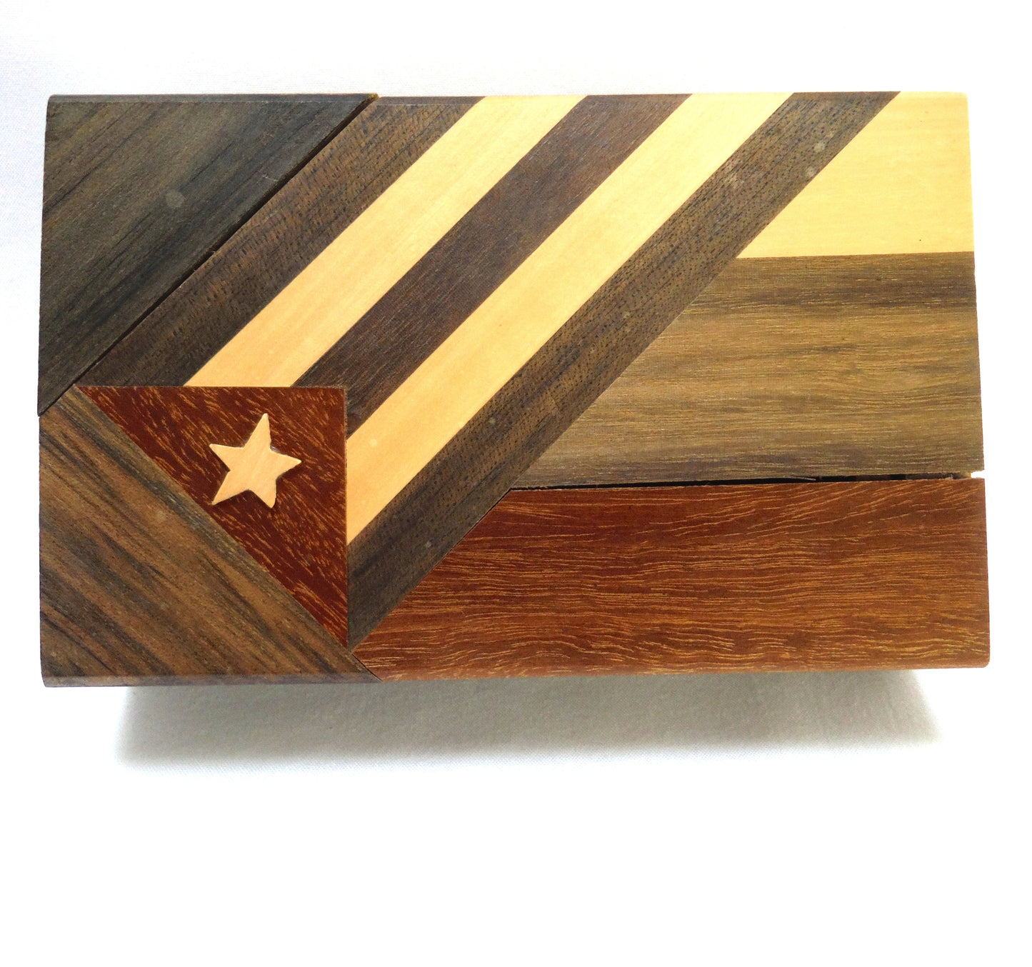 A lovely CUBAN Wooden Hand-Made Magical-Opening Secret Box, proudly displaying 'THE PROUD FLAG OF CUBA!' on the cover. A lot of work went into making these boxes from different types of local wood, and the finishing is excellent! Condition is perfect.ย