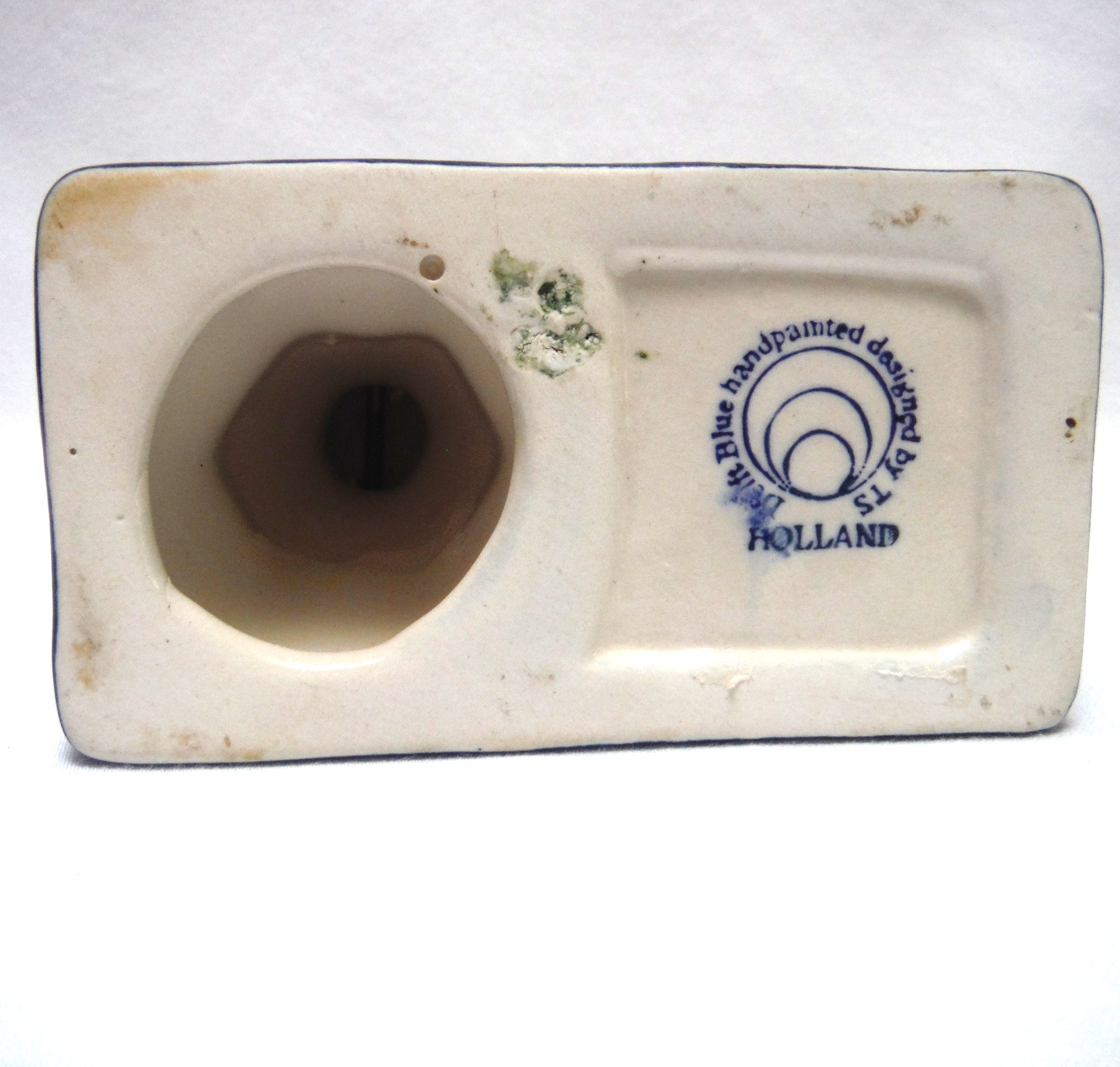 A stunning Delft Blue Holland figurine statue featuring a Dutch windmill and a pair of clogs, all mounted on a sturdy stand. It’s in excellent condition with no chips or cracks. The original steel nut and bolt still allow the windmill to spin freely, and the clogs showcase a charming little scene on both toes. The base is painted solid blue and does not display any city name, though the windmill is imprinted with "HOLLAND." The base also features the manufacturer’s marks. A delightful and well-crafted souvenir for any Delft collector.