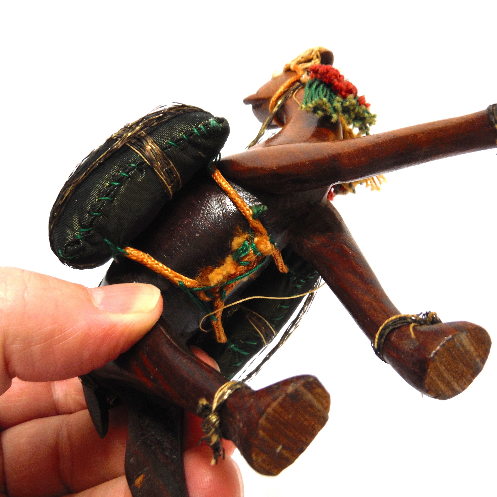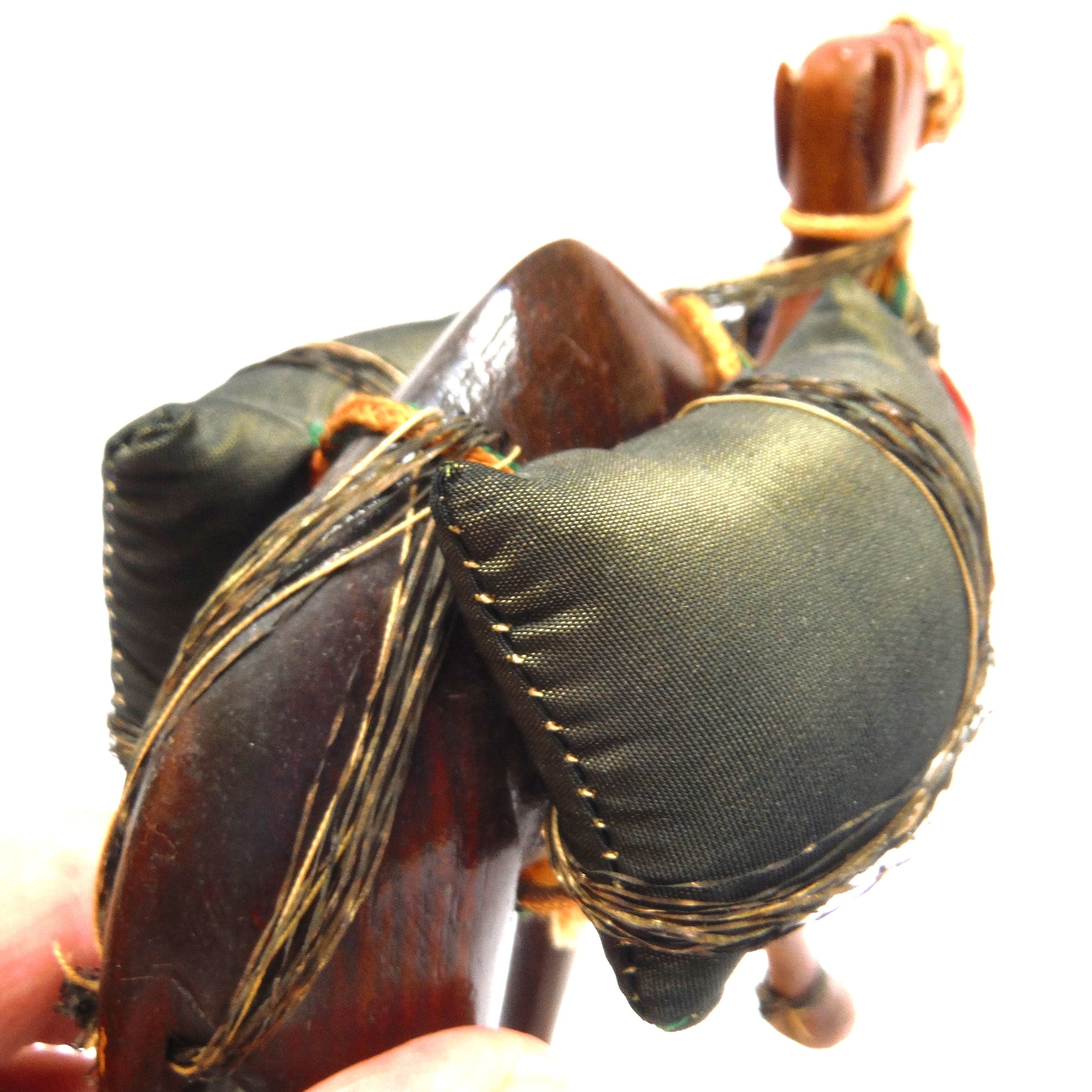 This is a one-of-a-kind hand-carved sold wood antique CAMEL with several stunning hand-made accoutrements, probably from the early 1900's Middle East. This camel definitely has a mind of his own, but he's quite proud all outfitted with his ankle and neck ribbons, custom made muzzle and silk hand-made, hand-stitched side bags...this guy is good to go!