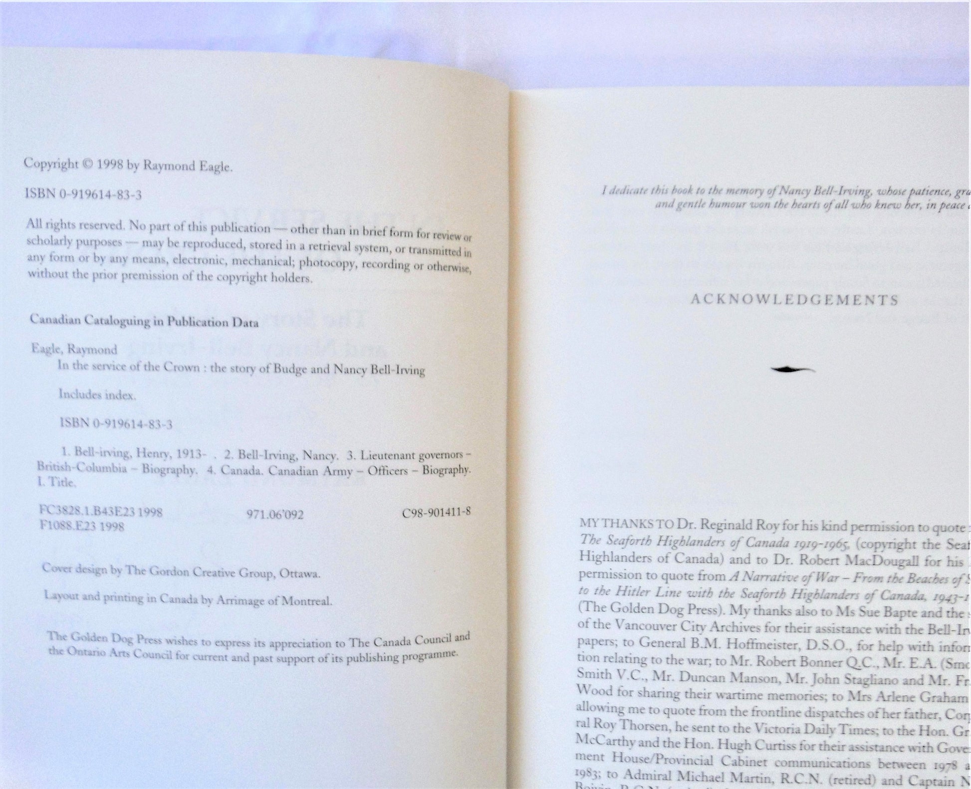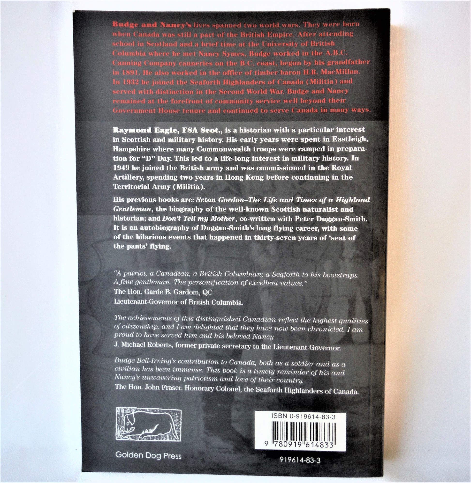 Budge later became B.C.'s 23rd Lieutenant-Governor. During his five years in Government House he kept a daily diar, and many of his insights from it are contained in this biography. Bell-Irving met his wife, Nancy, while attending UBC and was married in April 1937.ย ย