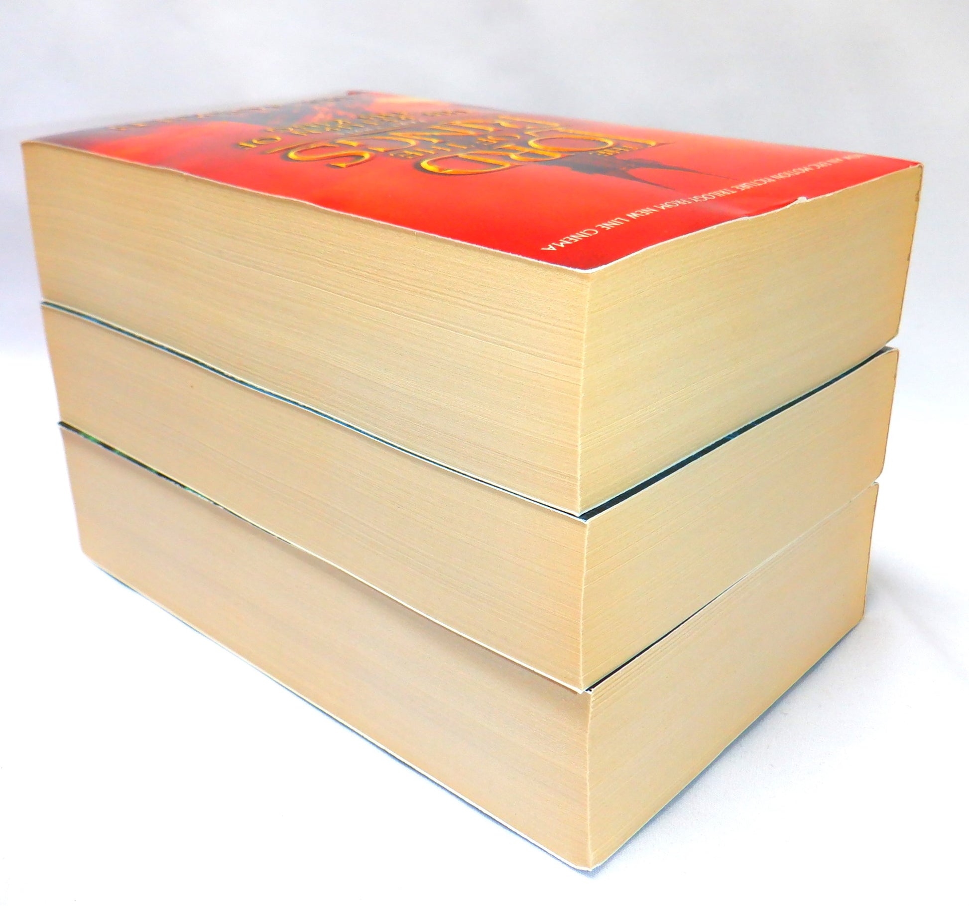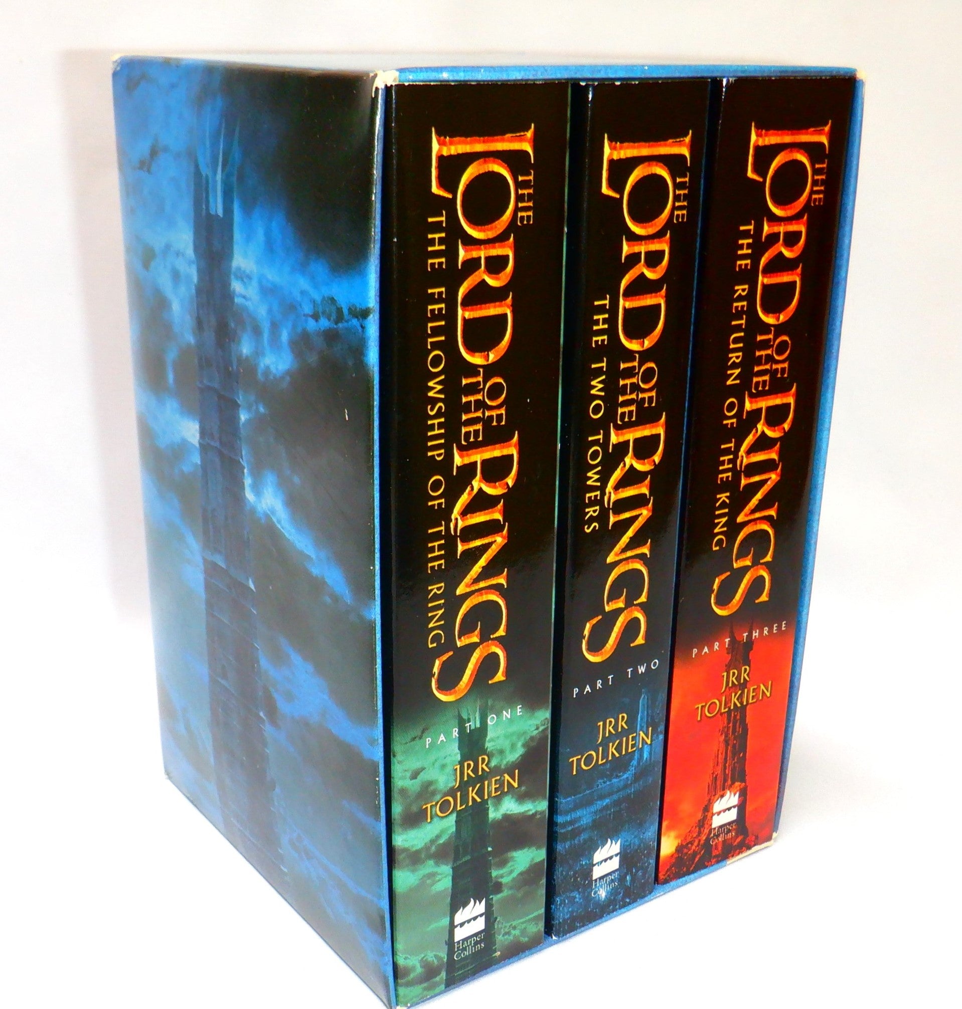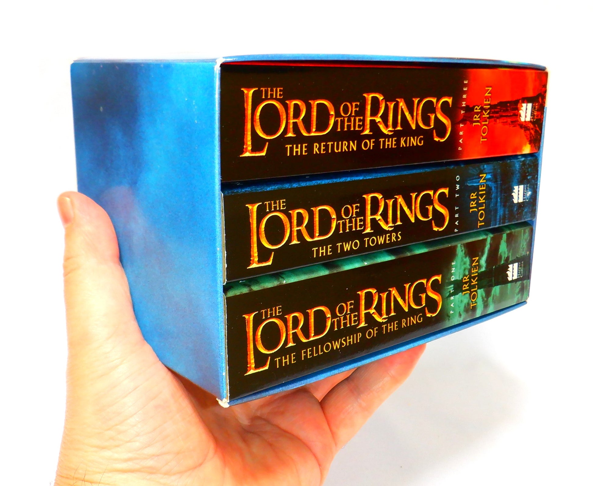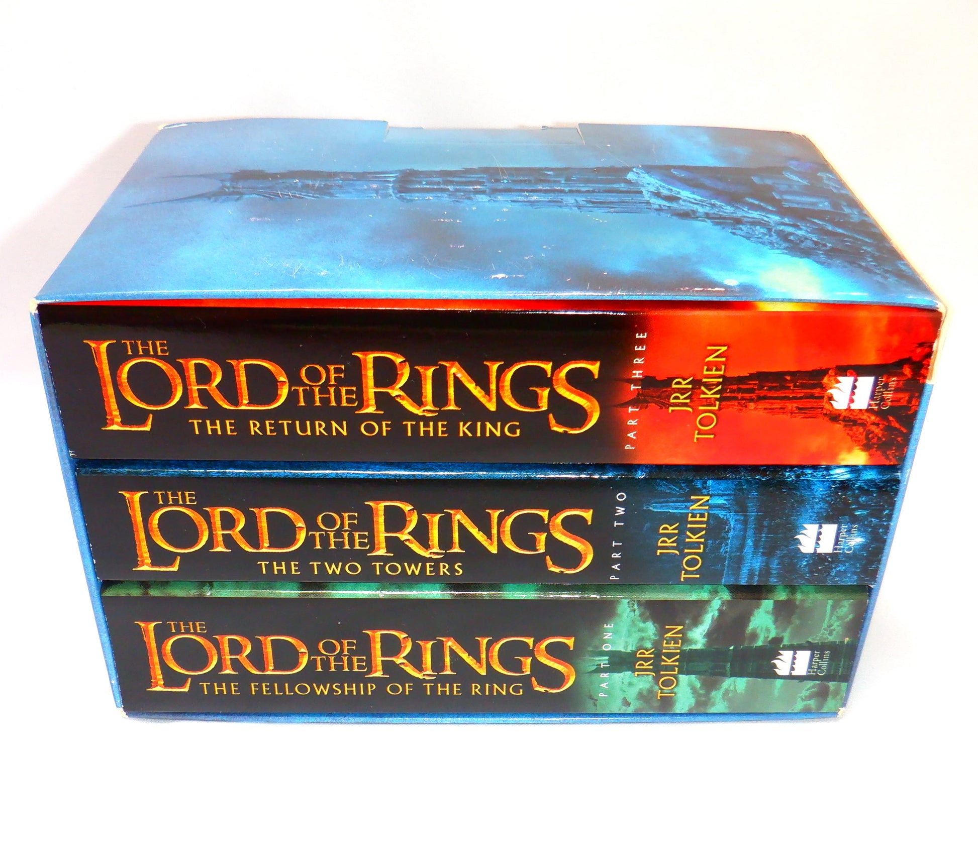 LORD OF THE RINGS, The Paperback Trilogy by JRR Tolkien - which include The Two Towers, The Fellowship of the Ring, and The Return of the King. This is the RARE first three volume, movie film tie-in, boxed-set edition of the Book of the Century ever published, featuring an exclusive movie cover image from the film on all three book covers,ย (Orthanc, Helms Deep and Barad-dรปr) along with a decorated slip-case.