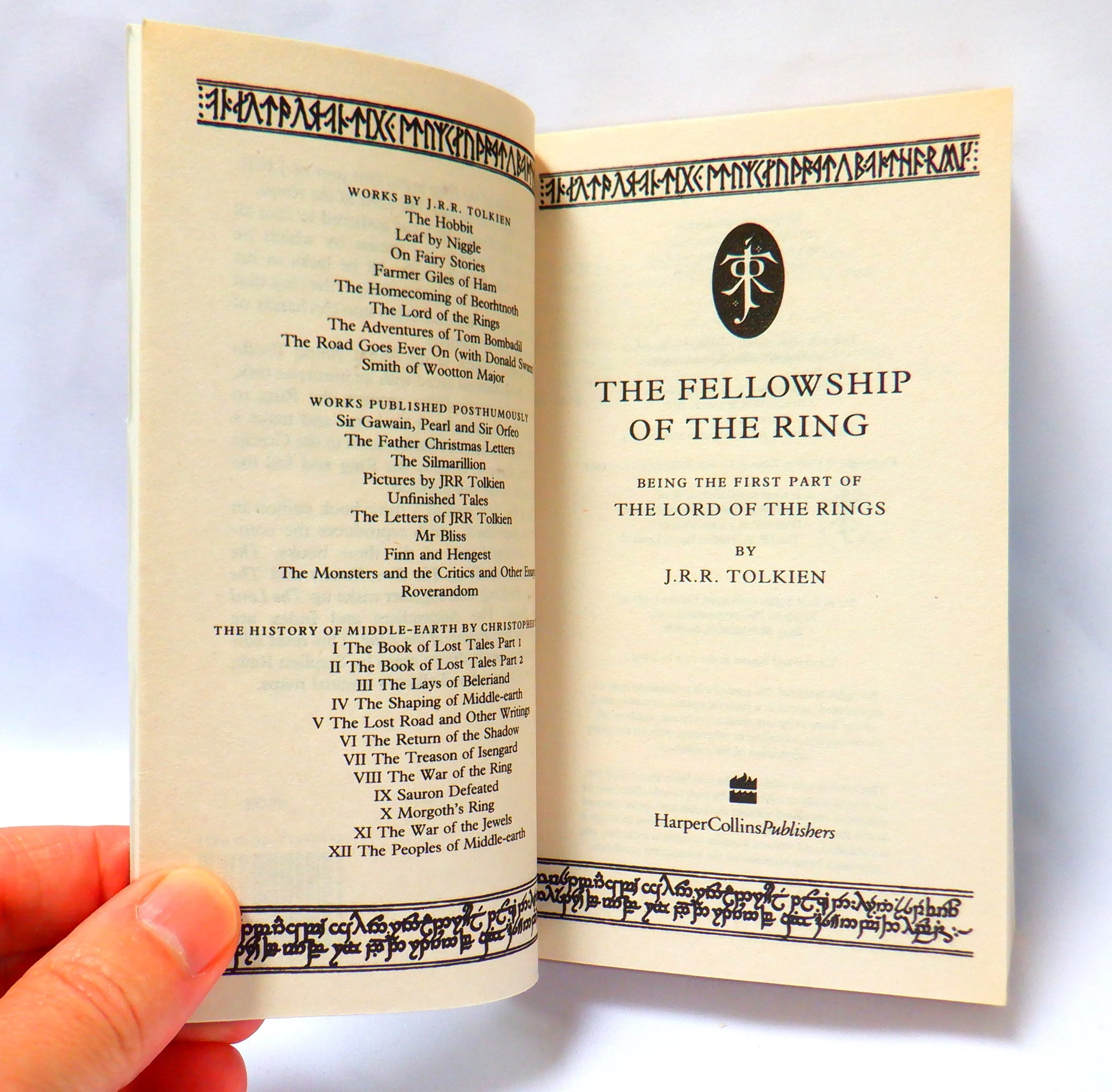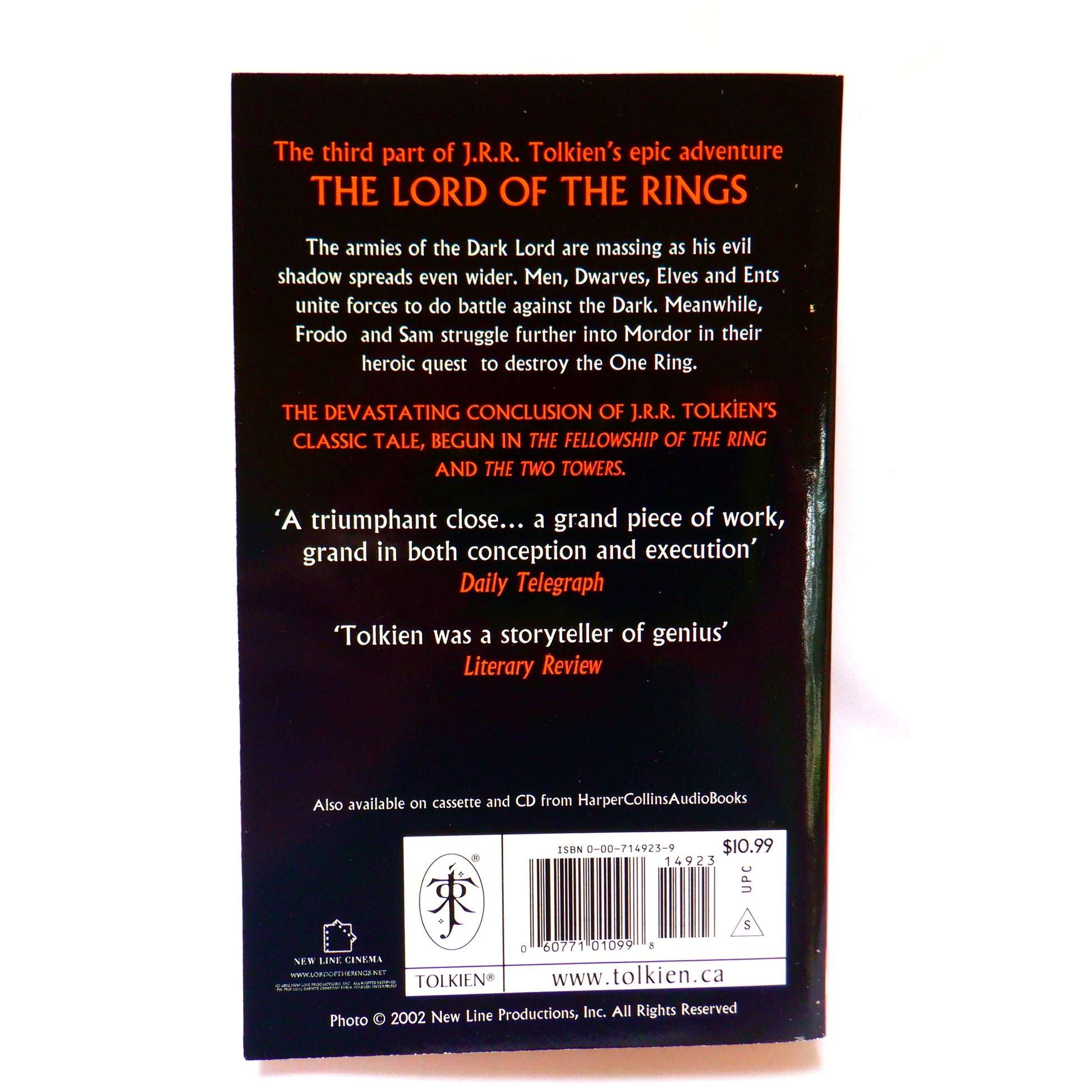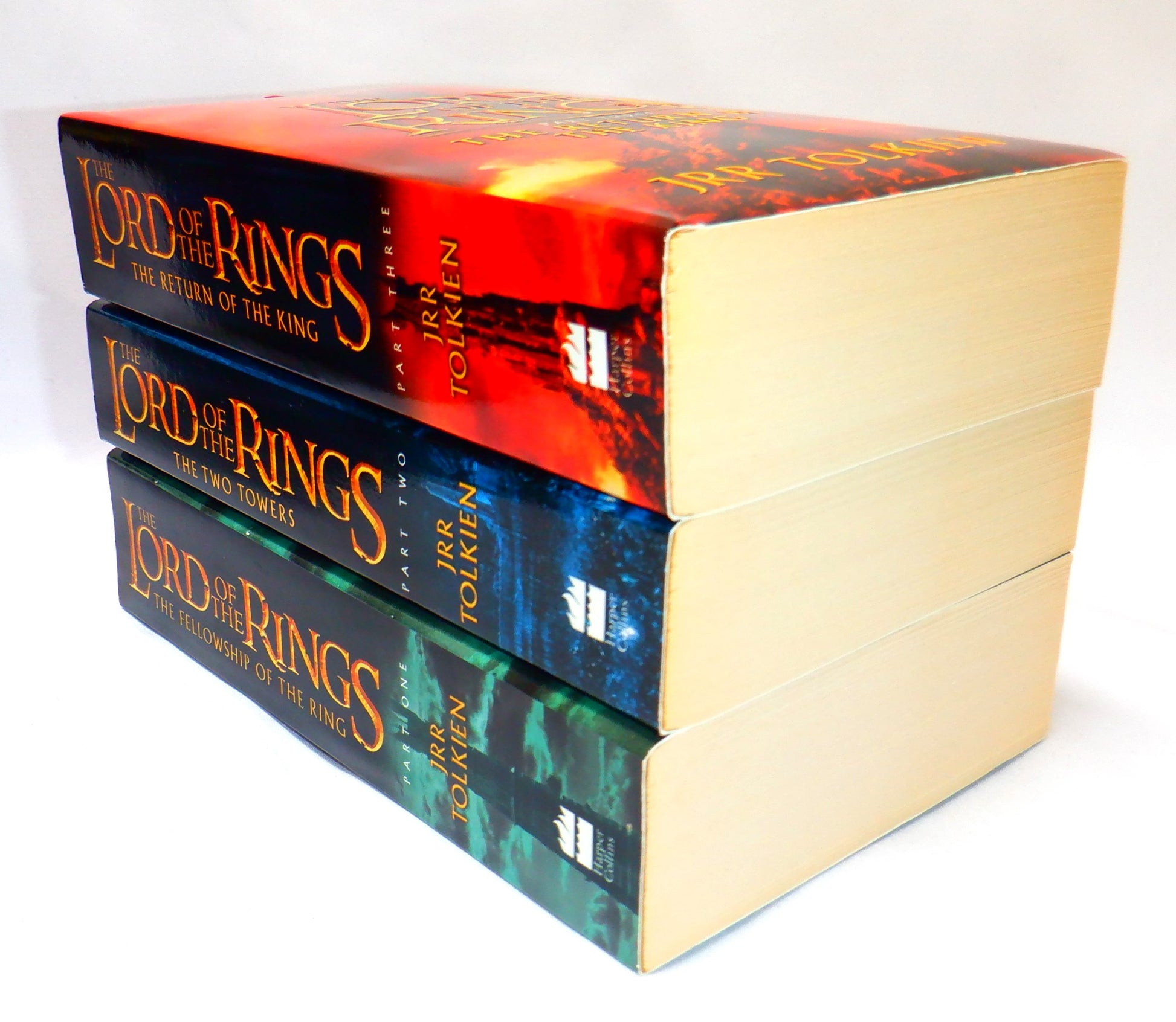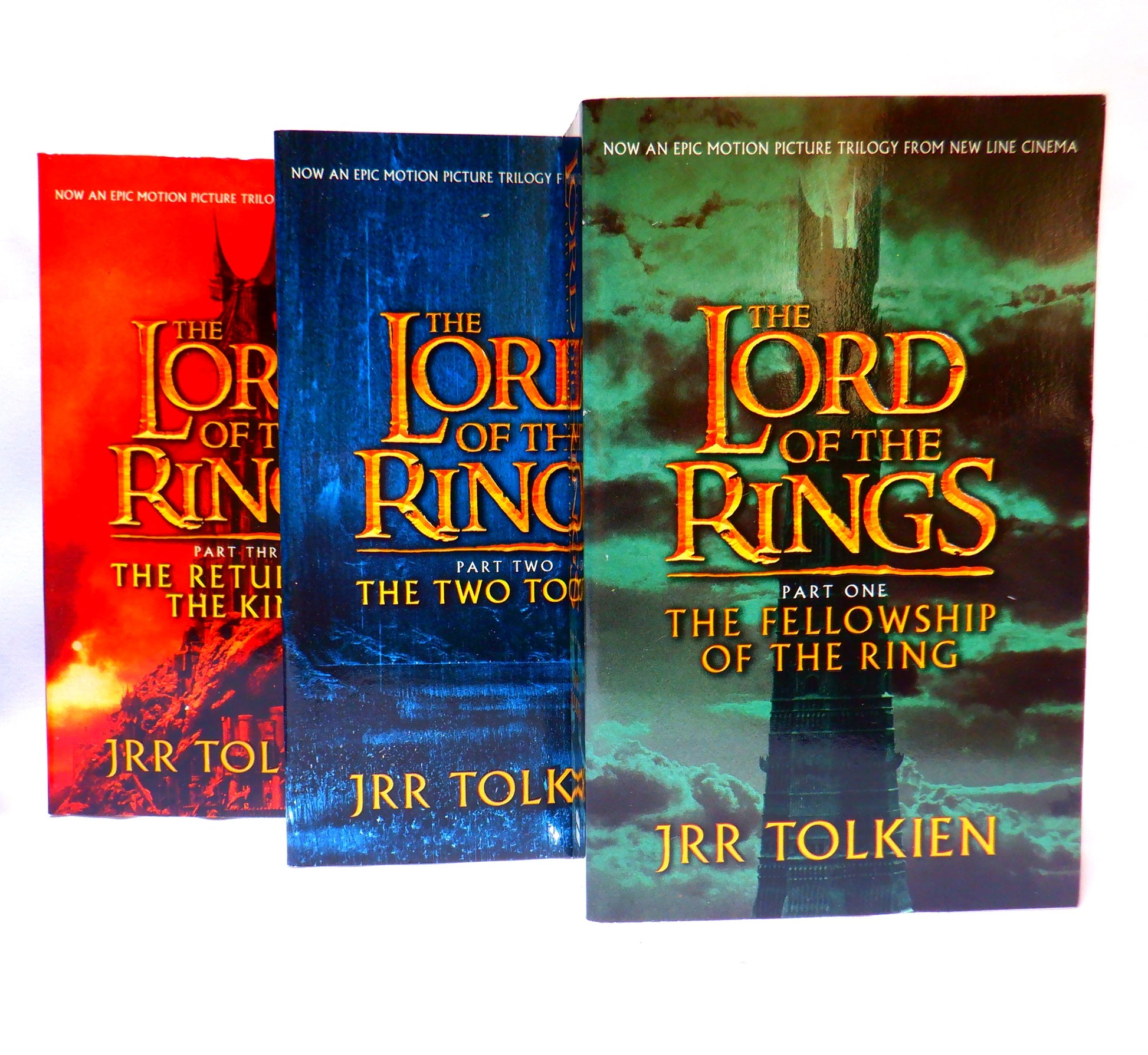 LORD OF THE RINGS, The Paperback Trilogy by JRR Tolkien - which include The Two Towers, The Fellowship of the Ring, and The Return of the King. This is the RARE first three volume, movie film tie-in, boxed-set edition of the Book of the Century ever published, featuring an exclusive movie cover image from the film on all three book covers,ย (Orthanc, Helms Deep and Barad-dรปr) along with a decorated slip-case.