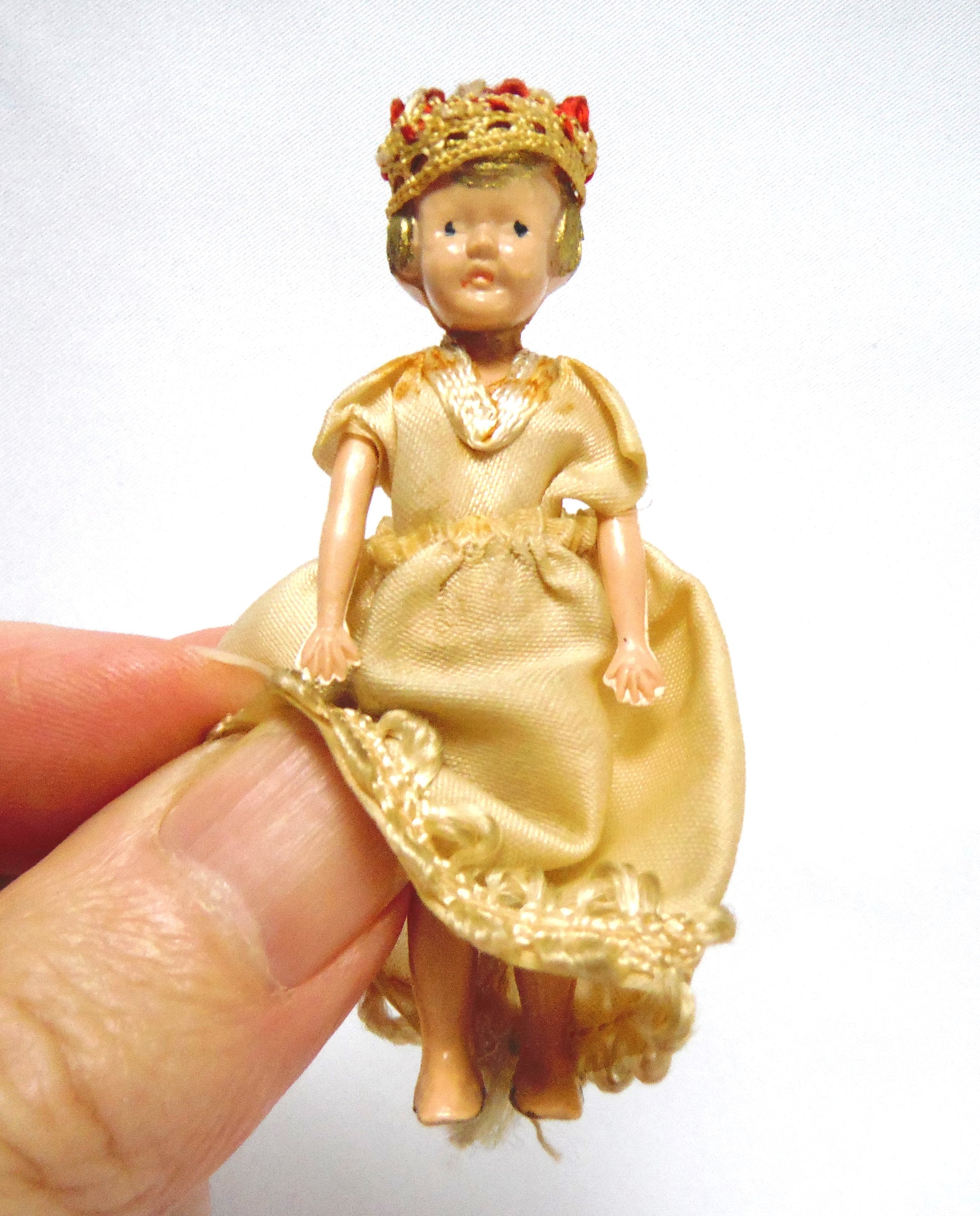 Miniature QUEEN ELIZABETH II DOLL, with Gown & Crown, Vintage 1950's, is a wonderful Miniature Doll of QUEEN ELIZABETH II, complete with Gown & Crown. She stands 3 inches tall, has a Gown of taupe silk and lace, a beautiful red crown, and arms that move up and down. Very Good Condition.