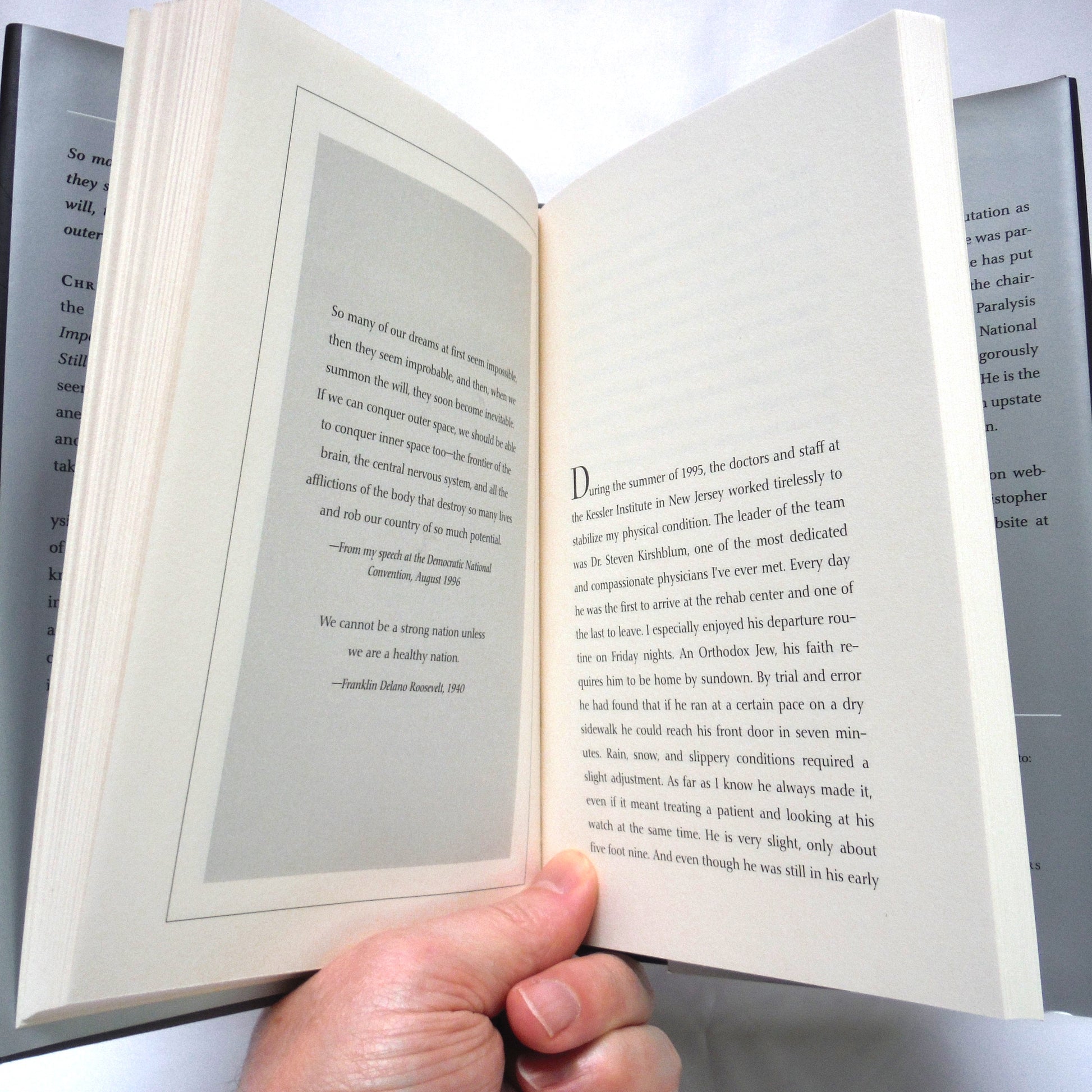 Author: Christopher Reeve. Published by Random House, New York, NY., 2002, 1st Edition. Printed in USA. Like New Condition HARDCOVER Book and Dust Jacket. Clean inside, tight spine. Size: 8.25 x 5.25 inch, 176 pages.