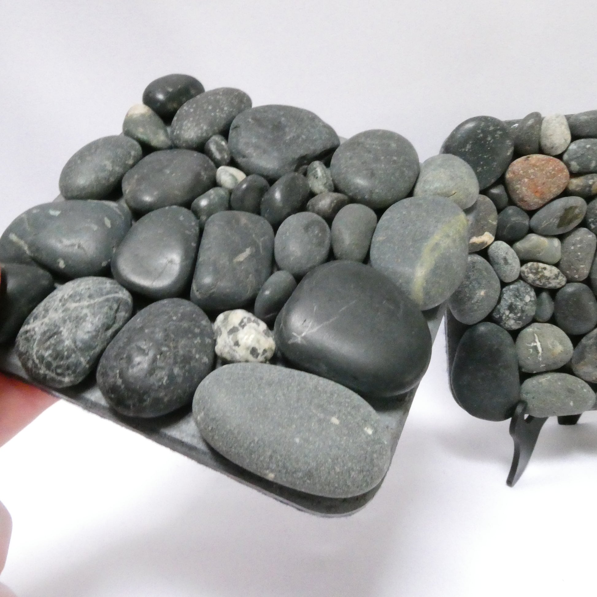 This pair of contemporary pebble stone mosaic drink coasters features like-new black felt backing to protect surfaces, and is perfect for sharing a drink with someone special. They’re quite heavy, made with an assortment of black and gray pebbles, possibly river rocks from Canada’s Pacific West Coast or Mexican beach pebbles. Both types are known for their smooth, unpolished texture and dark colors, which become beautifully vibrant when wet. The price is for the pair, though you can ask about purchasing just one.