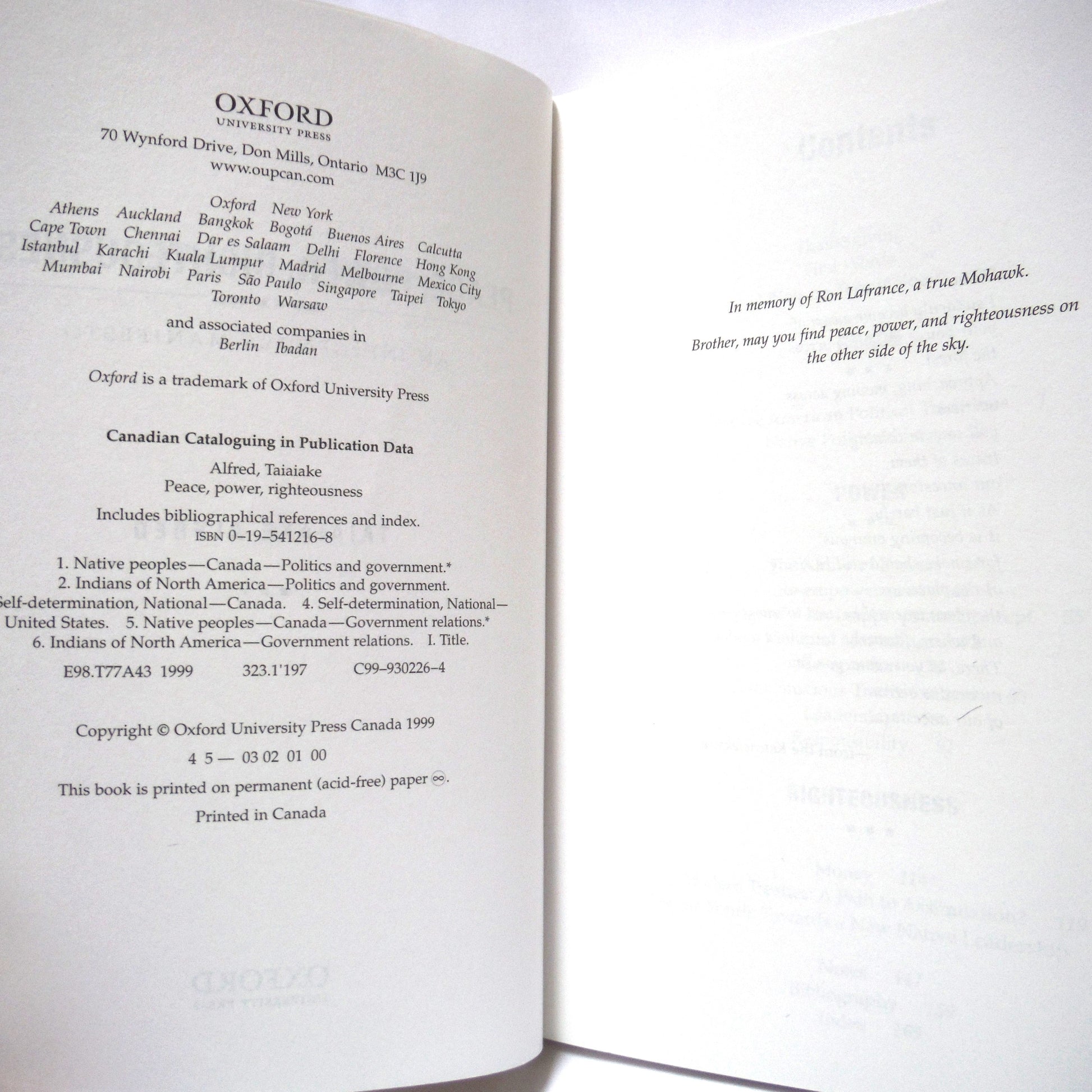 PEACE, POWER, RIGHTEOUSNESS: an Indigenous Manifesto, by Taiaiake Alfred (1999 1st Ed.)