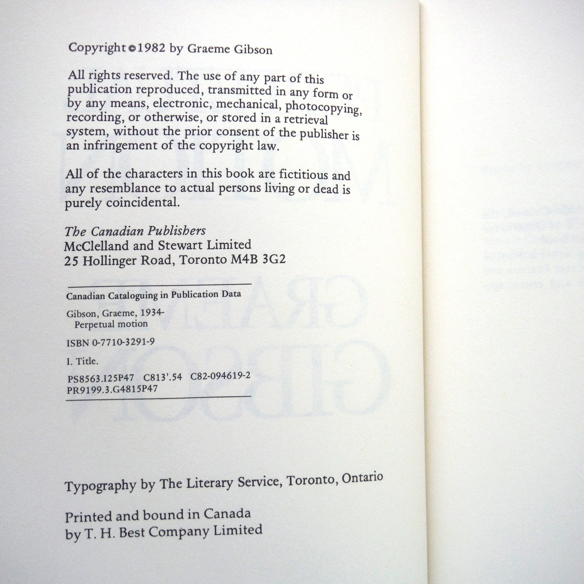 PERPETUAL MOTION, A Novel by Graeme Gibson (1982 1st Ed.)