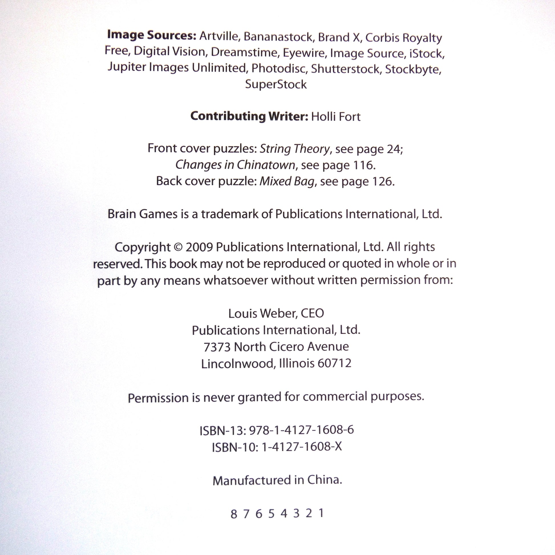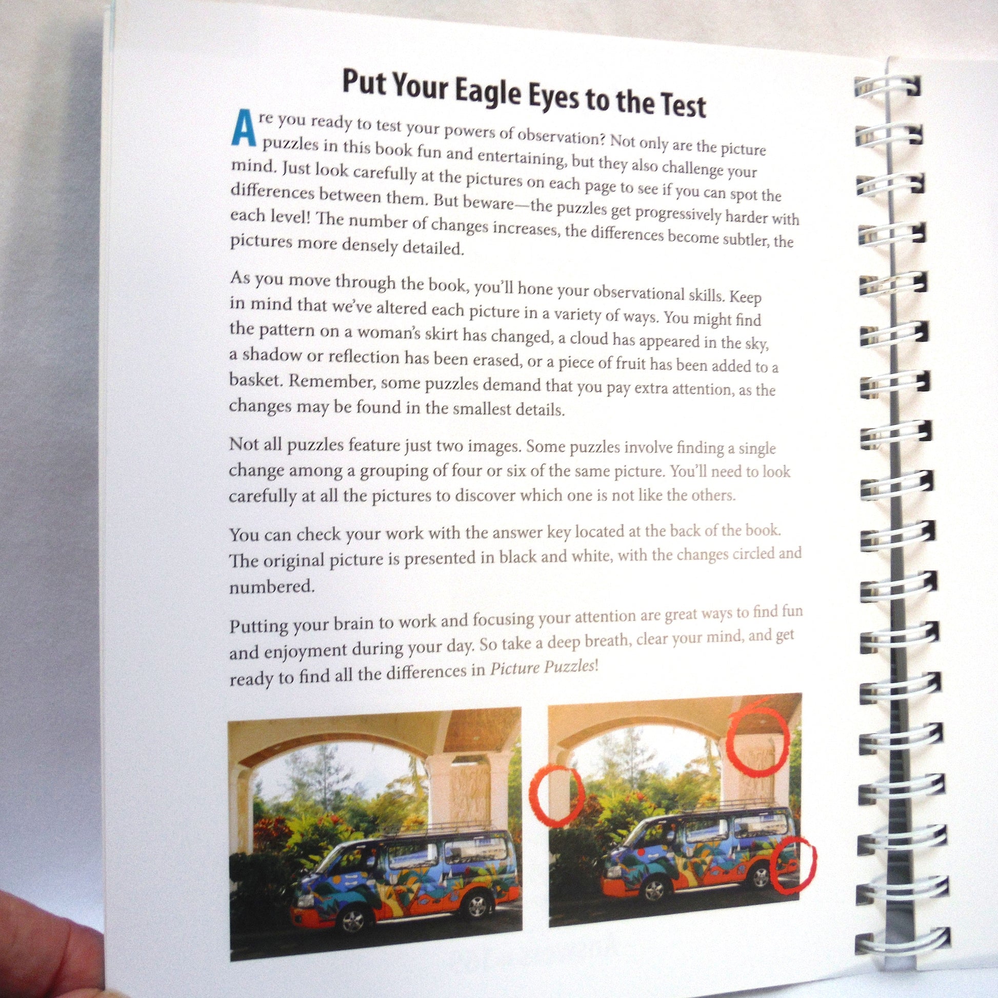The book is divided into four sections of pictures puzzles, each progressively more difficult. Can't find all the changes? No problem because the solutions to all the puzzles are provided in the final section of the book. The book is spiral-bound and handy to use, no matter whether you are at home, on public transportation, in a long security line at the airport, or relaxing at poolside or on the beach. Take along Brain Games Picture Puzzles wherever you go stimulate your mind a few minutes at a time.