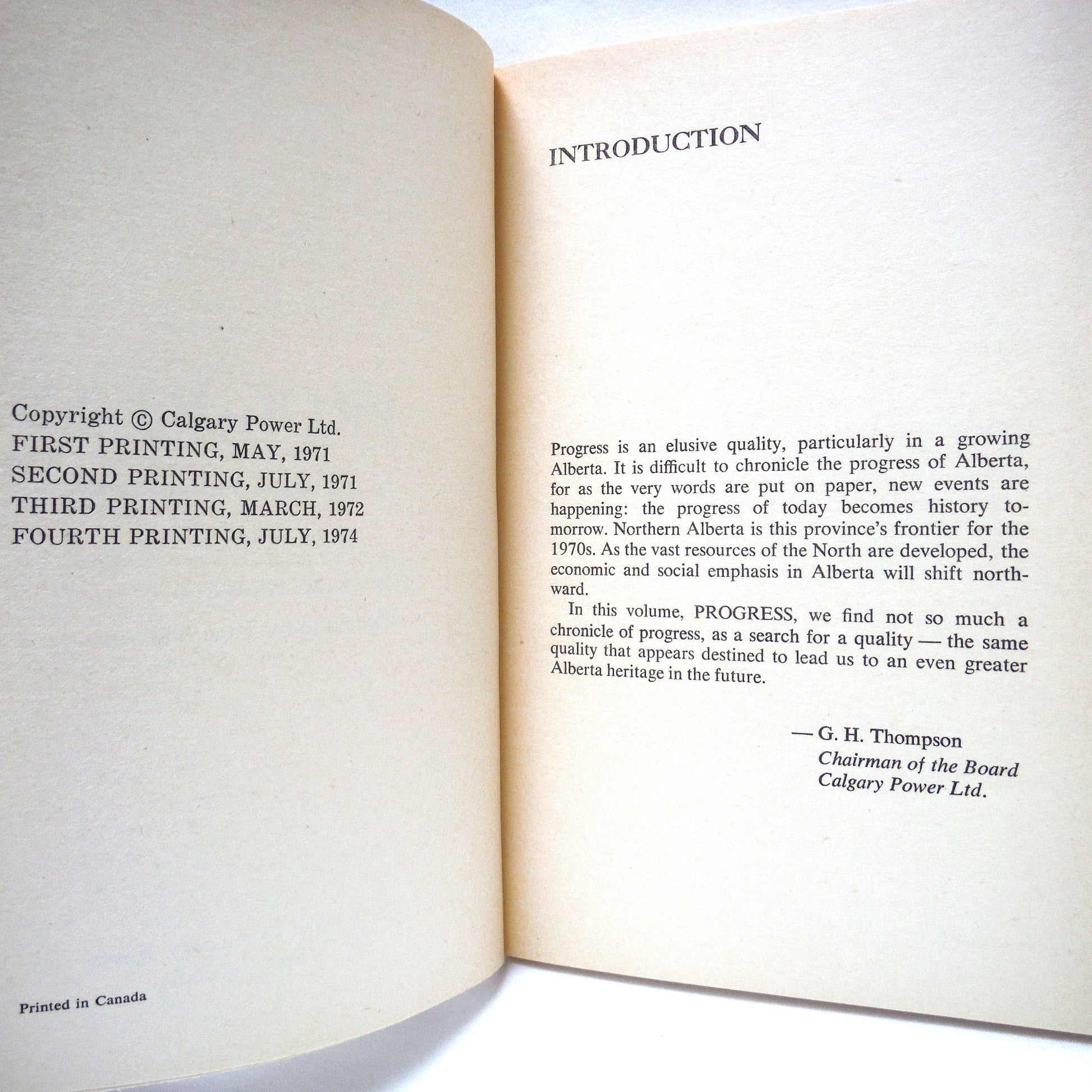 "Progress in an elusive quality, particularly in a growing Alberta. it is difficult to chronicle the progress of Alberta, for as the very words are put on paper, new events are happening: the progress of today becomes history tomorrow." -Introduction by G.H. Thompson, Chairman of the Board, Calgary Power Ltd.